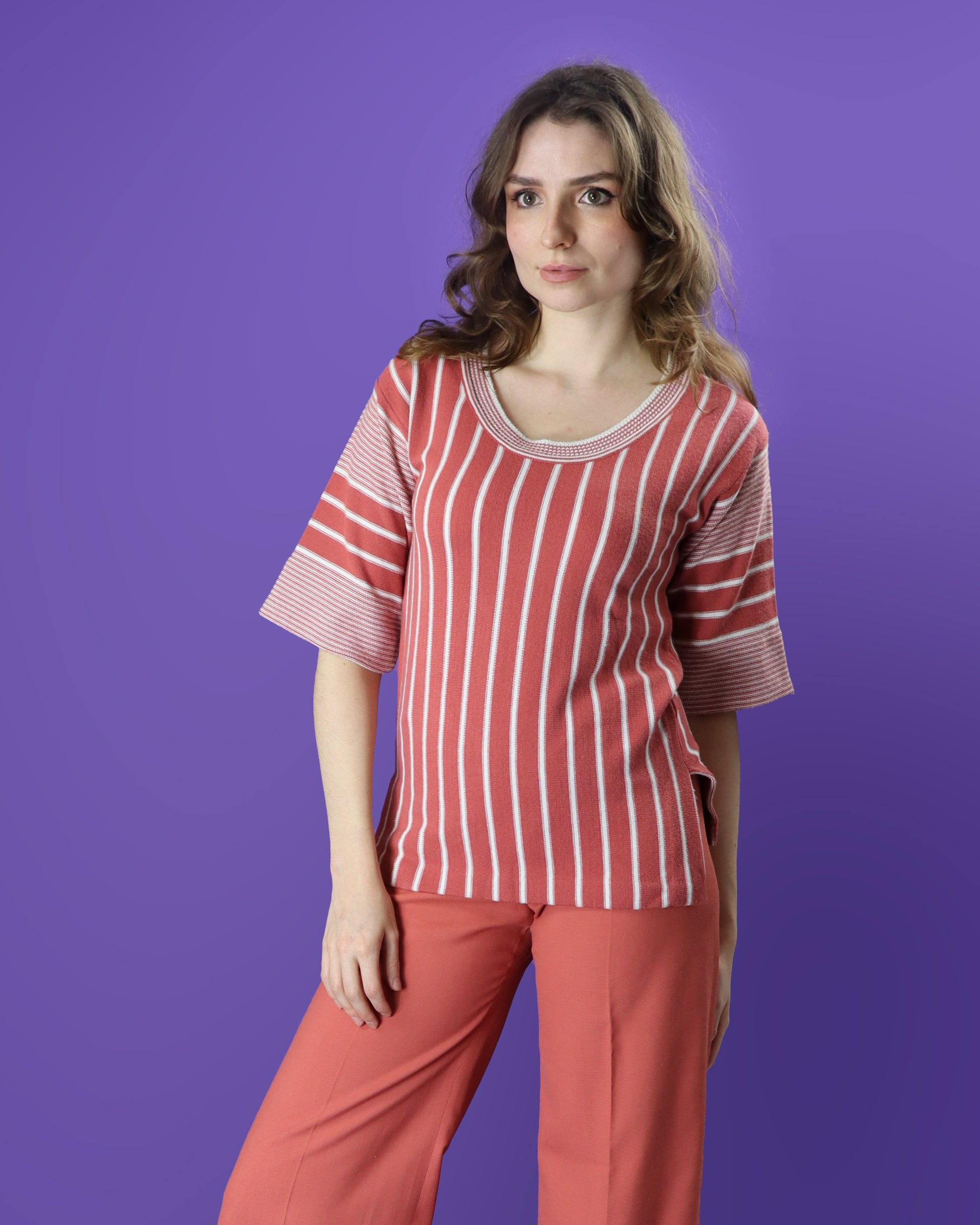 Fabulous vintage 1970s DEADSTOCK palazzo pant suit by coveted designer boutique JAEGER. Made in England. Consists of an acrylic stripe jumper top with scooped neckline and elbow length sleeves, matched with a pair of flattering high and tight waisted wide leg palazzo pant flares. In a gorgeous coral pink colourway. A perfect set for spring summer! Unworn. So many beautiful details to this set- very well made.