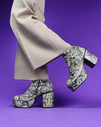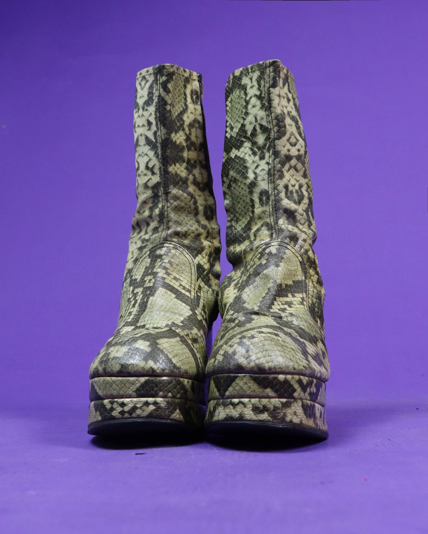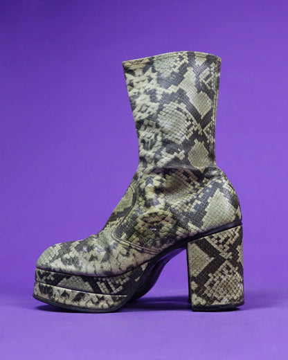 Fabulous vintage 1970s faux snakeskin platform boots. Featuring a slim fit ankle, mid calf length, large block heel and front platform. The snakeskin vinyl used is very effective with embossed scales and a slight sheen. Iconic and rare glam rock stomping boots!