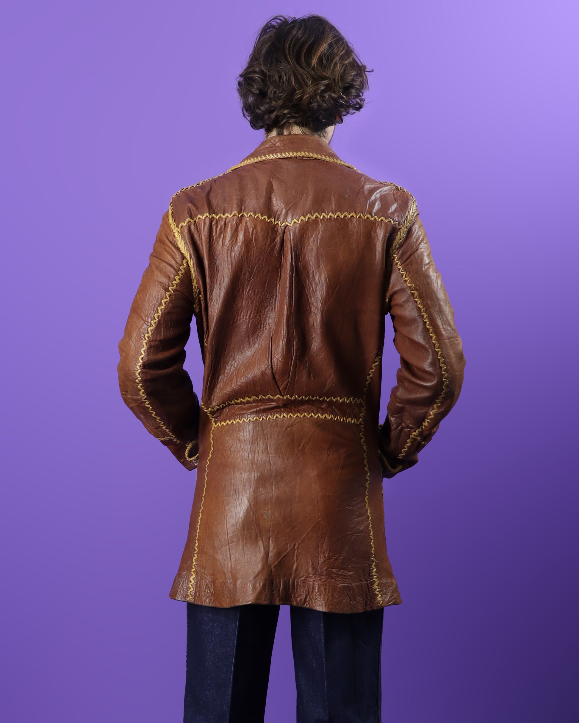 Rare vintage 1970s leather coat handmade in Mexico by renowned makers 'North Beach Leathers'. Burnt umber softest supple leather panels sewn together using contrasting whipstitched tan leather thread & featuring matching self covered leather buttons. A true work of art- I love the arched shapes in the panelling, the pocket tab detail & the large lapel collar. Fully lined. A rare collectible.