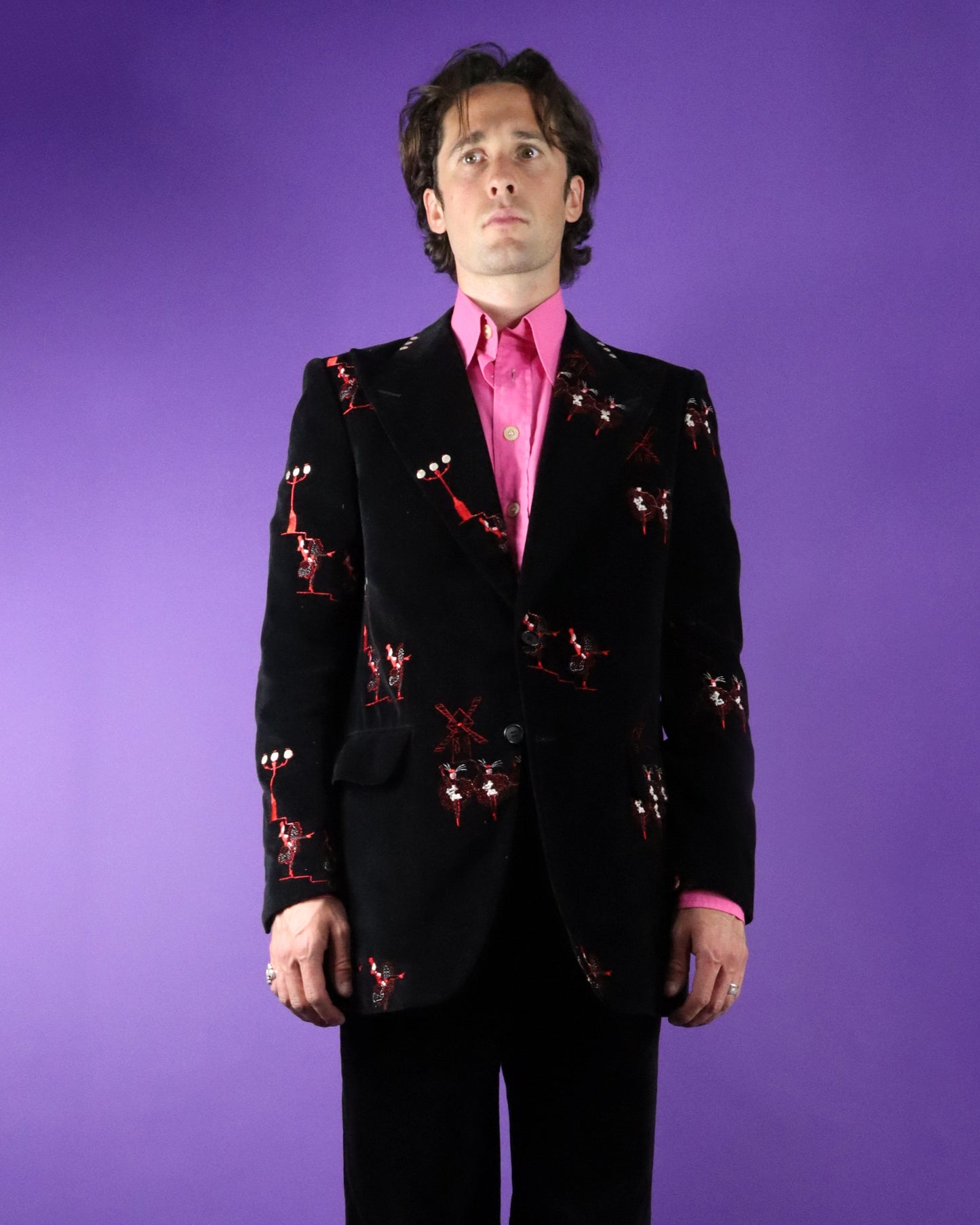 Incredible rare vintage 1970s blazer by Soho tailor 'James & James'. Black velvet with suave satin stripe down each side, adorned with contrast red and white embroidery depicting French cabaret motifs including dancers, windmills and lamp posts- very Moulin Rouge. I love the can can dancers with bloomers on display! Cut with a peaked lapel and featuring lots of lovely finishings and high quality details. A true work of art and piece of fashion history.