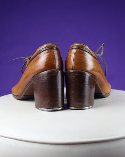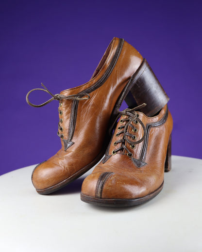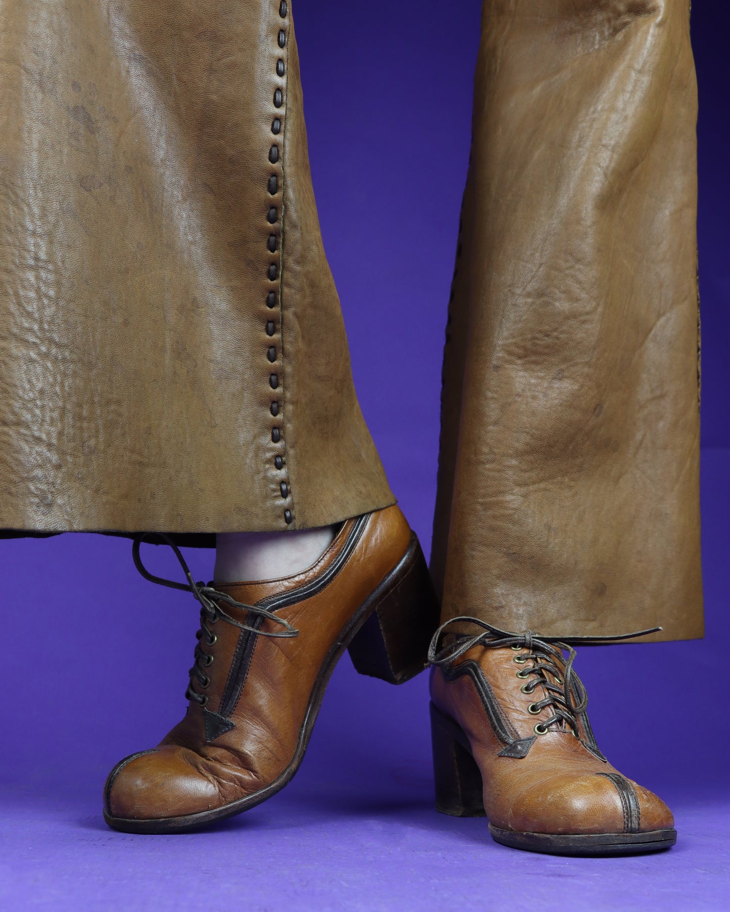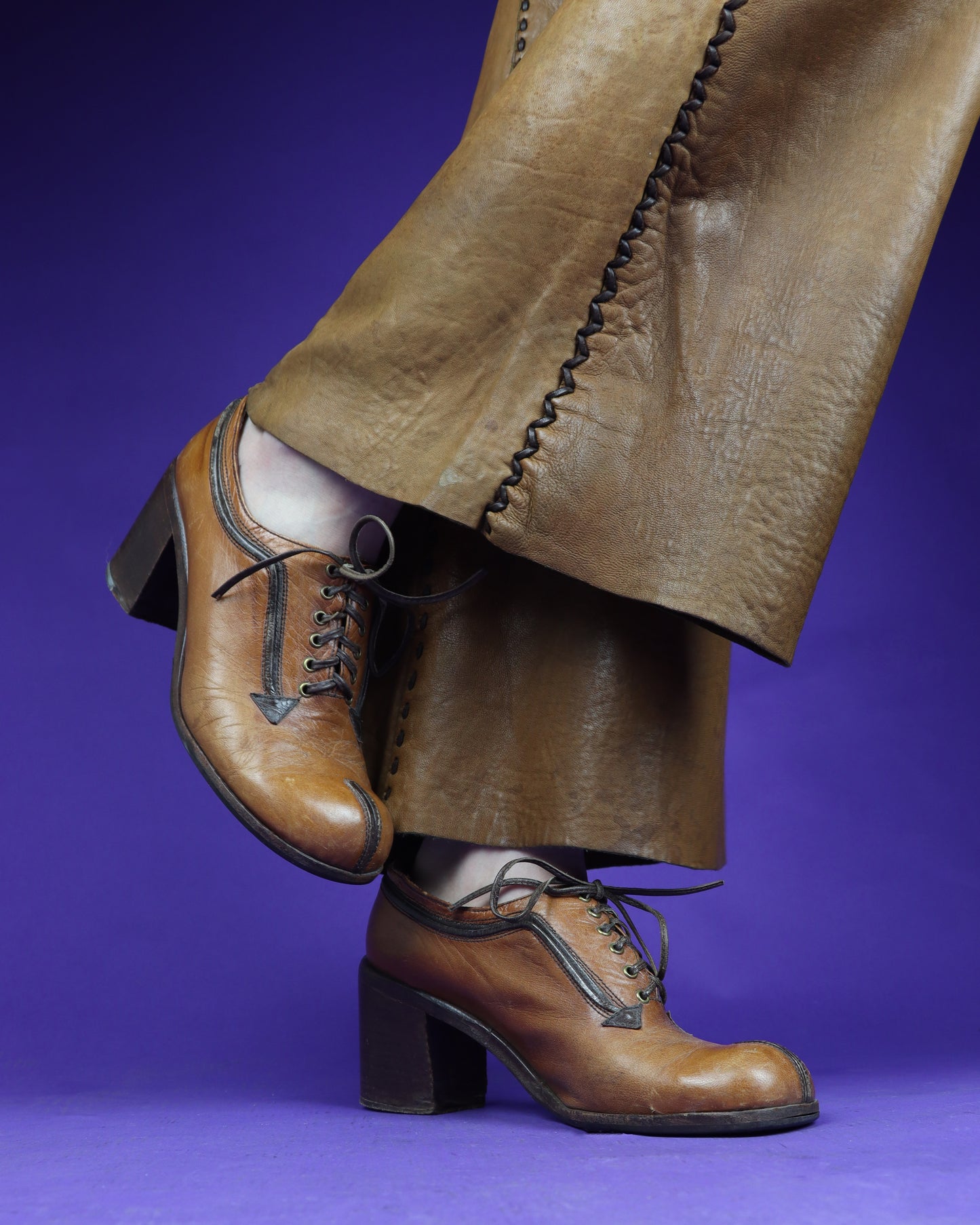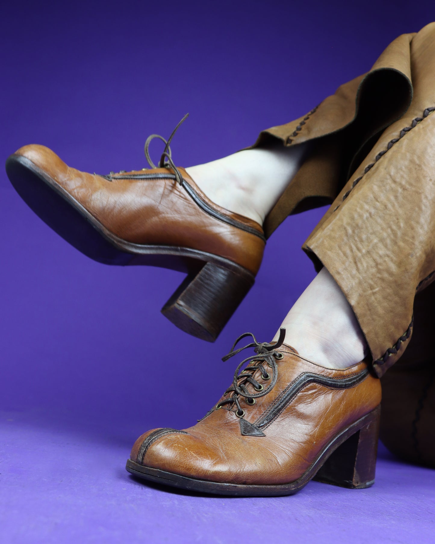 Fabulous vintage 1970s platform shoes. Cognac coloured leather with contrasting dark brown leather arrow detailing wrapping around each shoe. I love the sleek, flat toe shape and large block stacked heel. A special pair of shoes which are super comfortable and beautifully crafted.