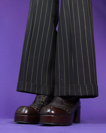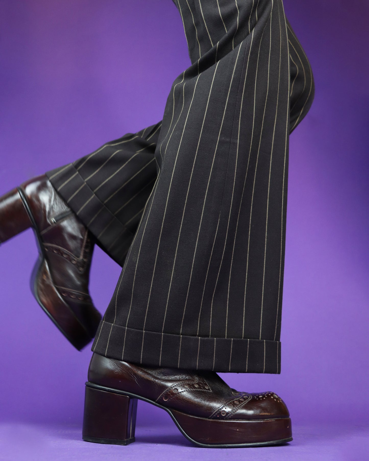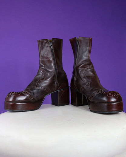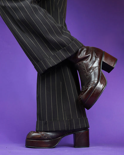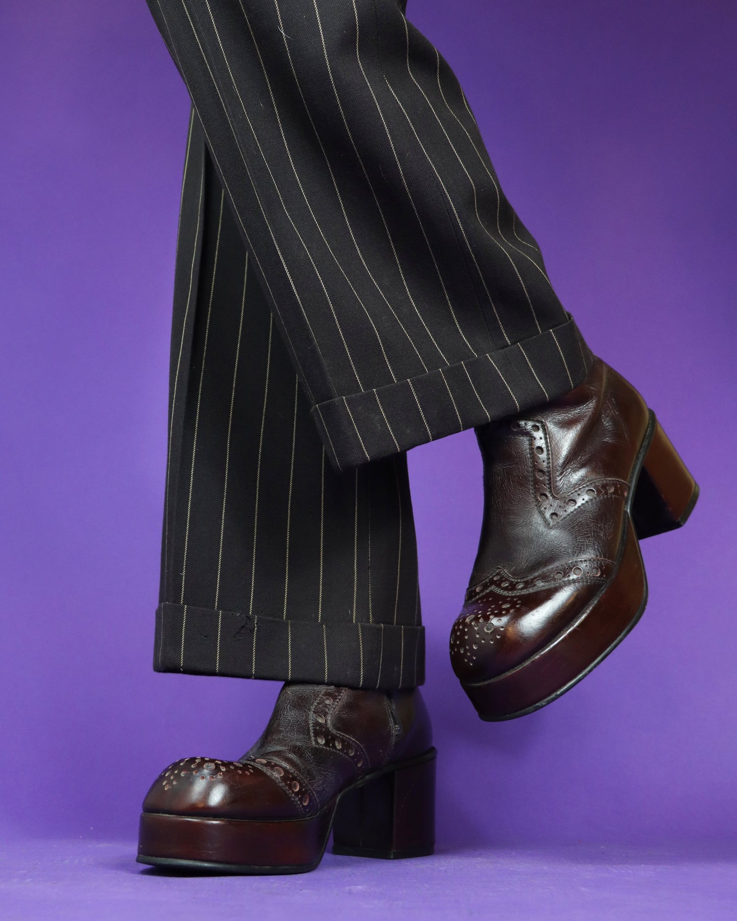 Vintage 1970s brogue platform boots by Dolcis. Beautiful rich brown colourway with punched brogue style design. I love the neat round toe shape on these, and the chunky block heel and platform. Super cool under a suit. Appear to be hardly worn.
