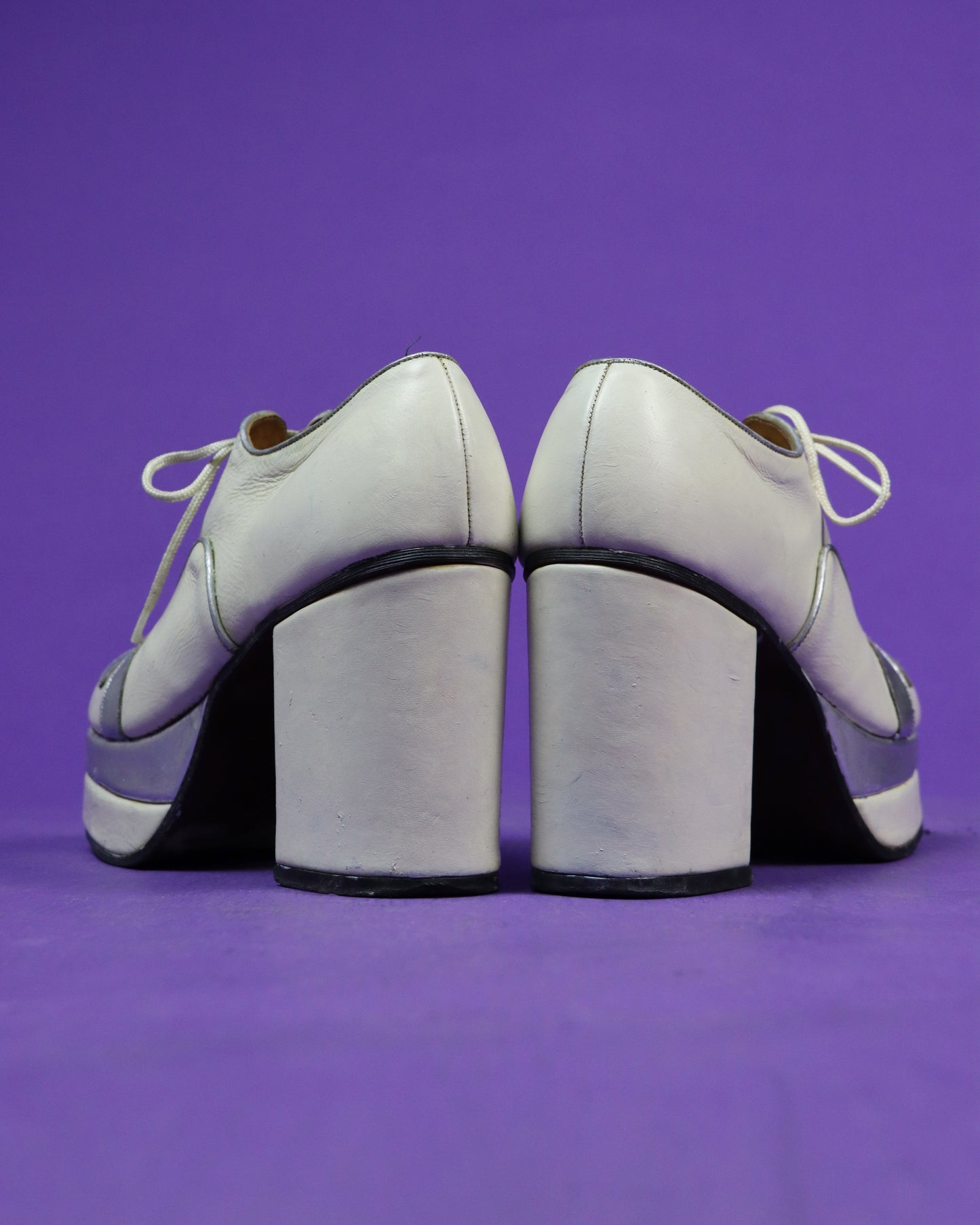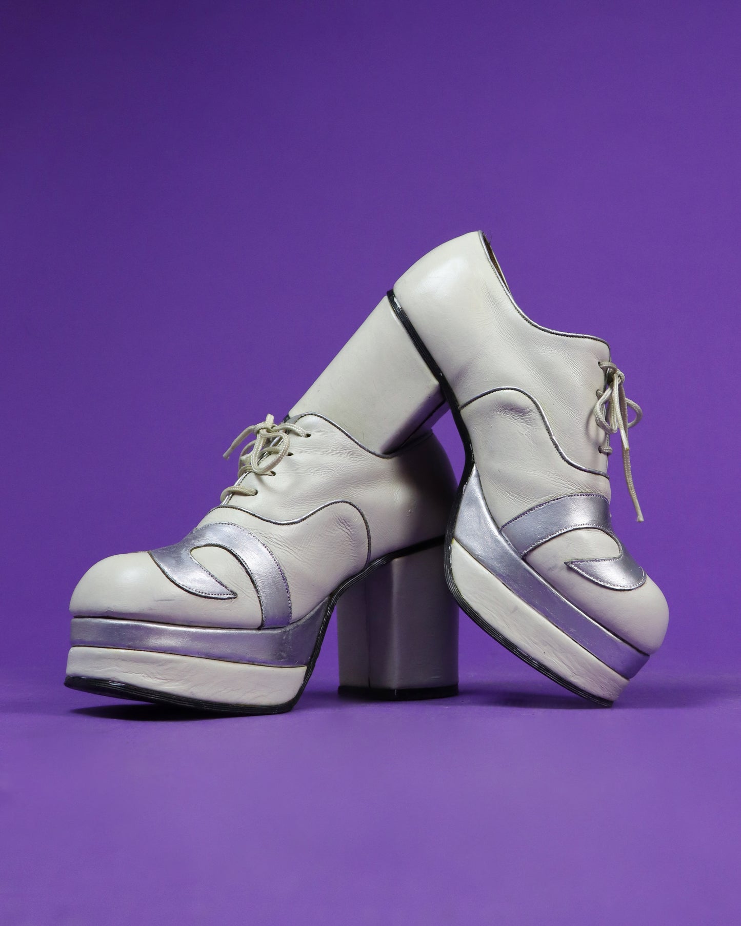 Vintage 1970s Cream and Silver Swirl Platform Shoes