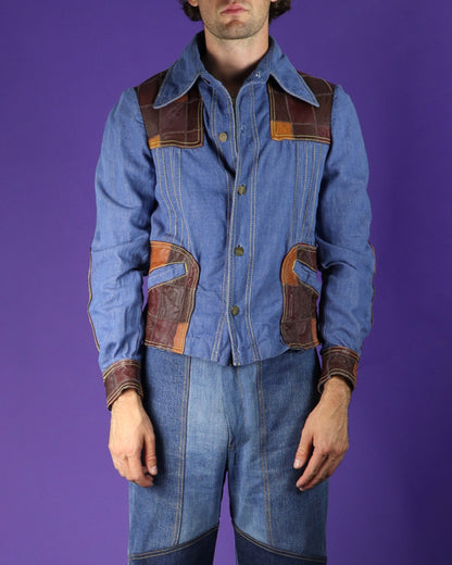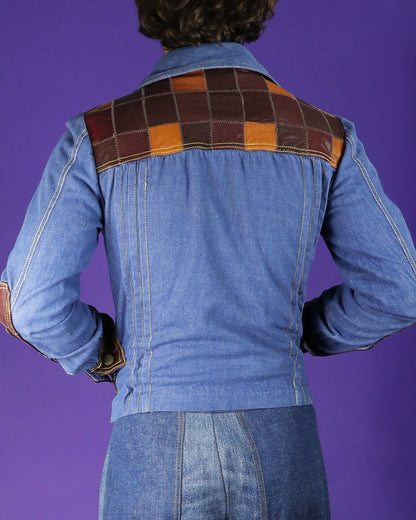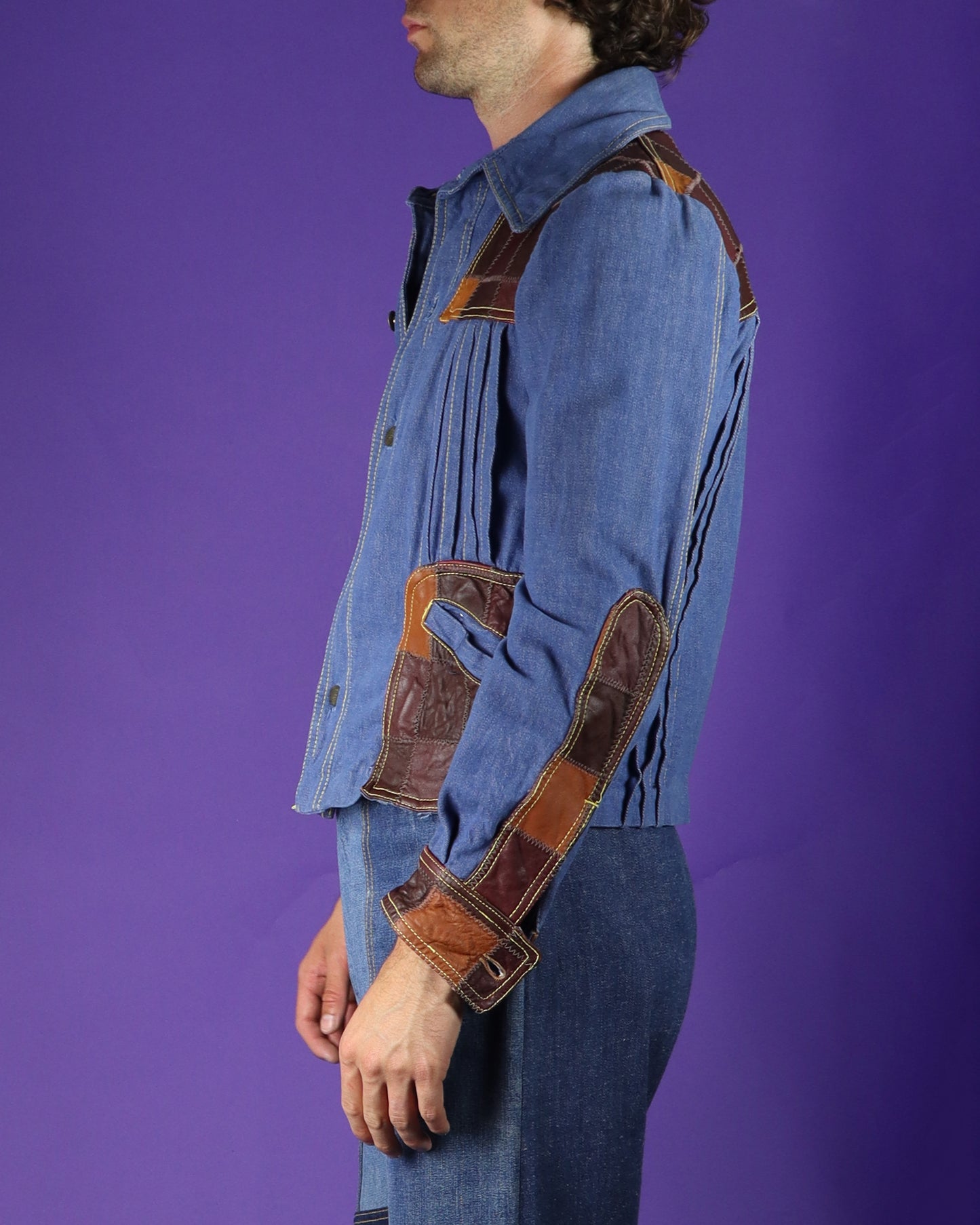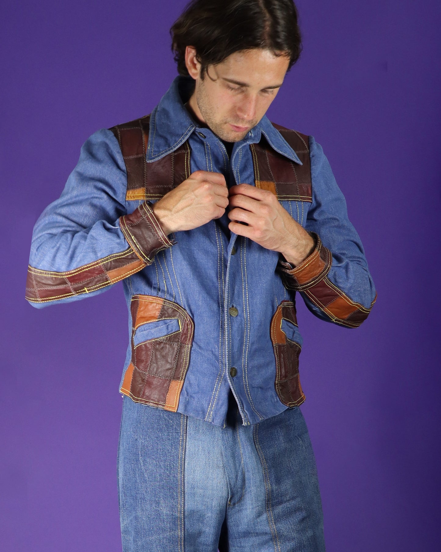 Fantastic vintage 1970s denim trucker jacket by 'Dr Denim & Mr Hide'. Features fabulous cubic patchwork on the yoke, patch pockets and sleeve seams. I love the brown and orange tones against the indigo denim. Beautifully finished with pleated seams at the sides and a dagger collar. Super special jacket!