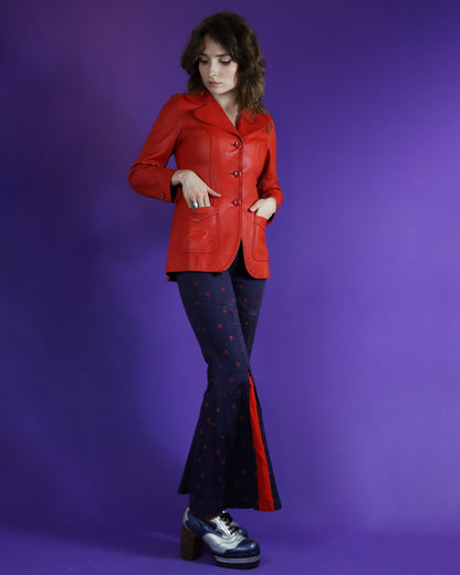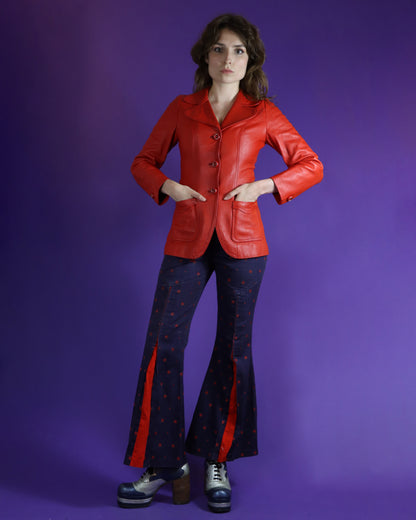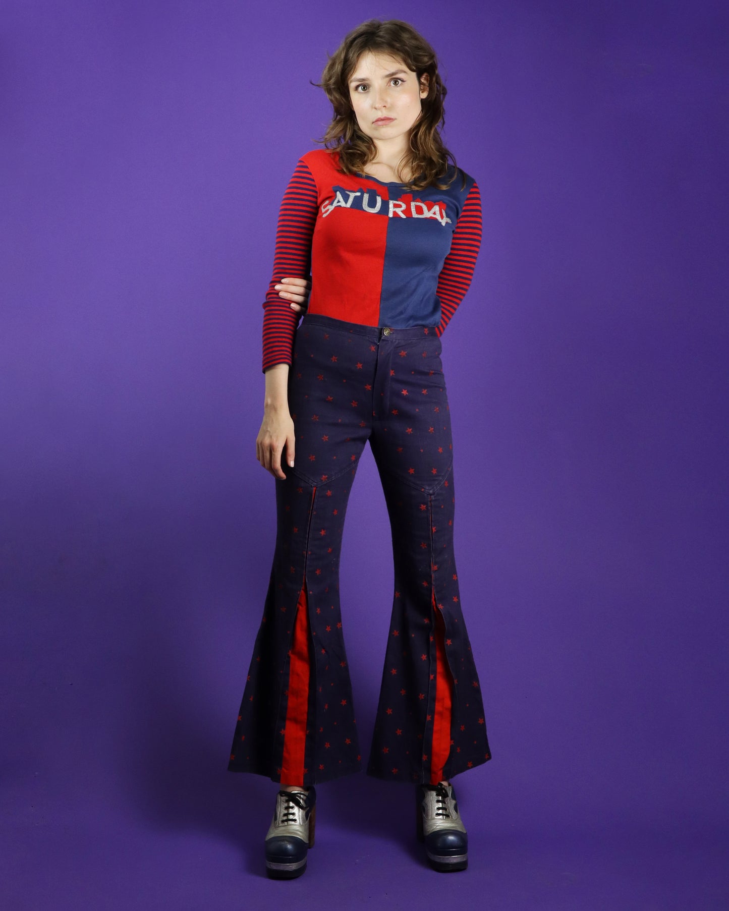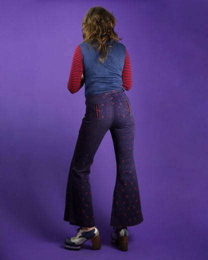 Wild vintage 1970s flares by 'Kwite Fantastic'. Deep indigo denim with printed red stars all over, featuring a circus tent style red panel at the knee- this creates the ultimate bell bottom flare! This is also echoed on the back pockets. A glam rock dream piece & total rarity.