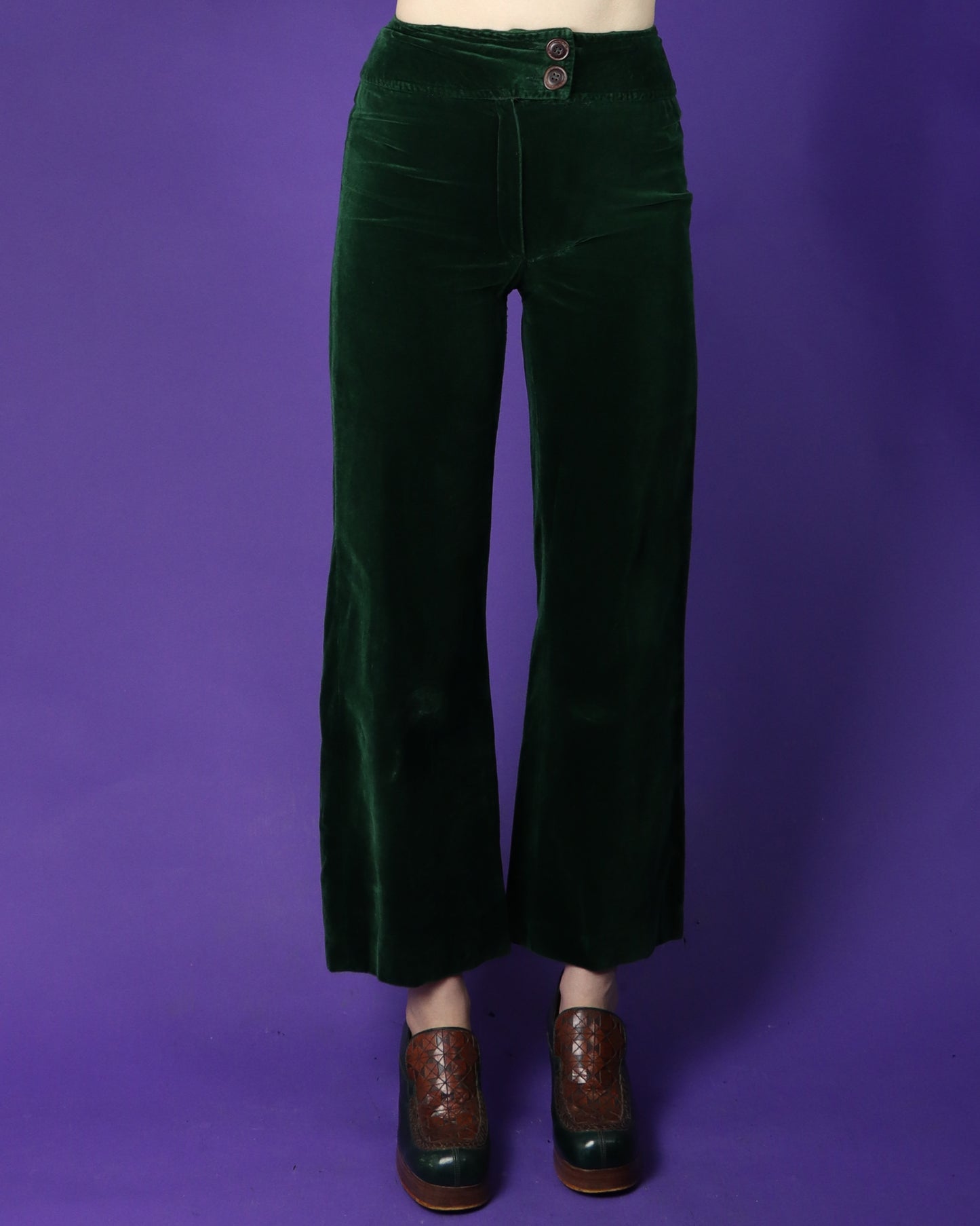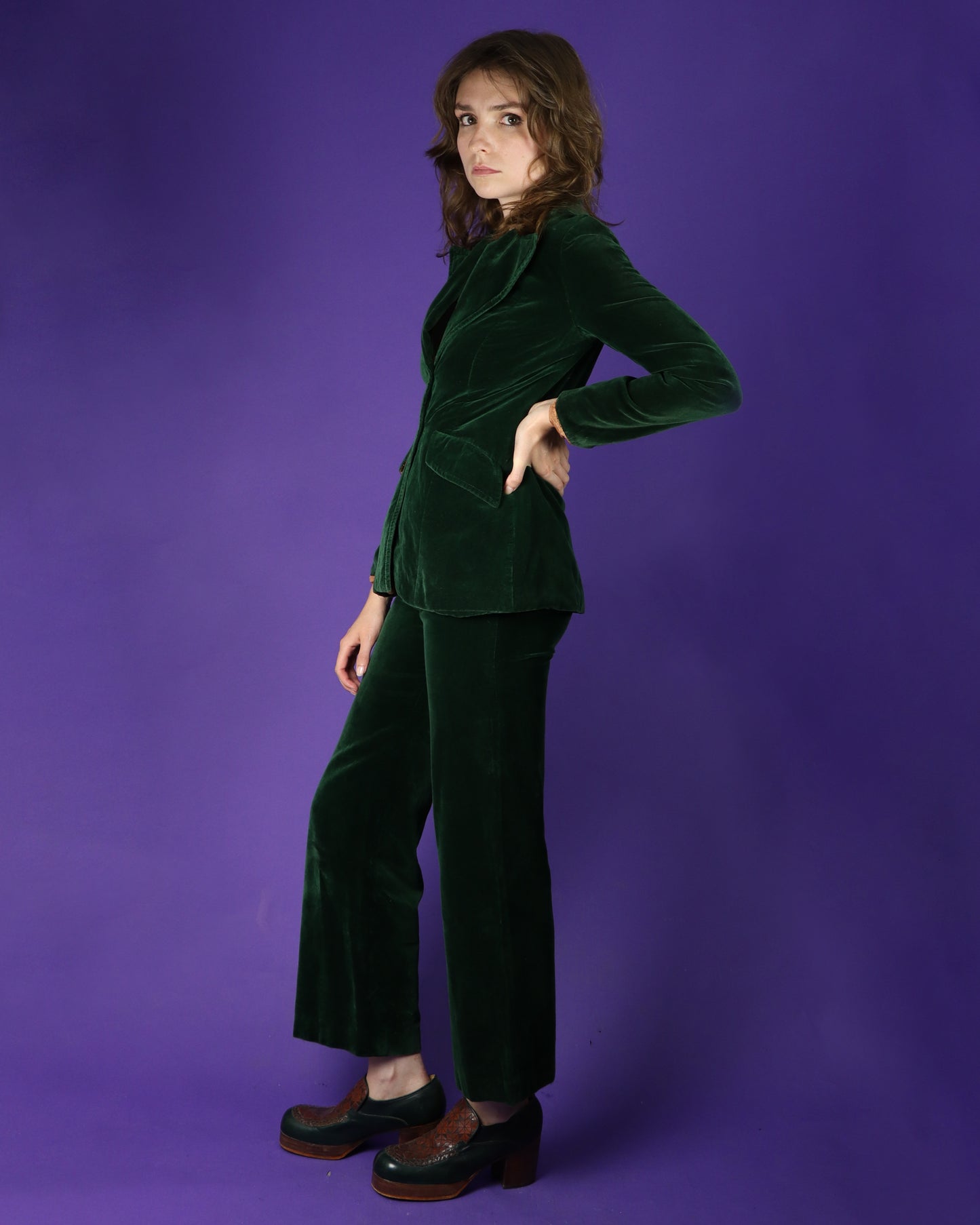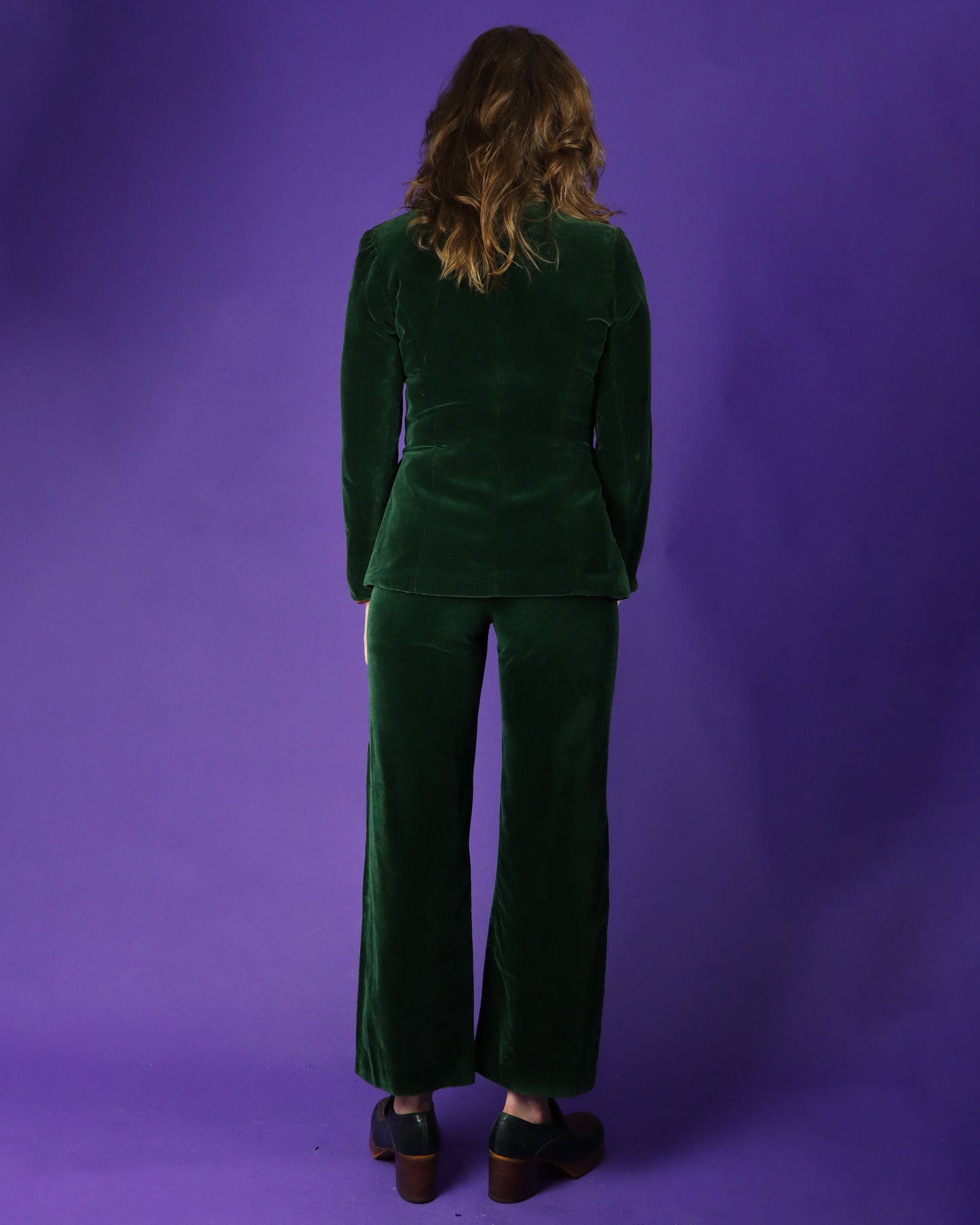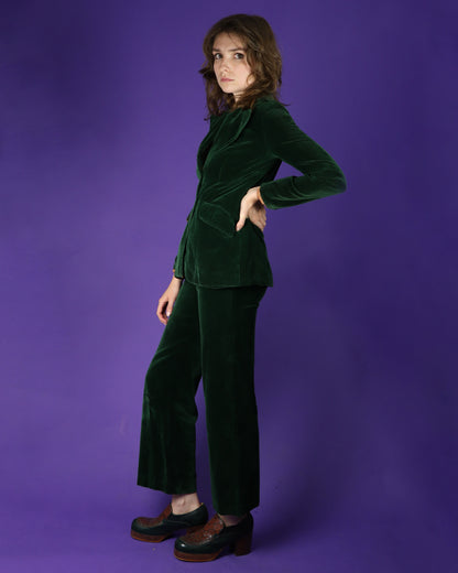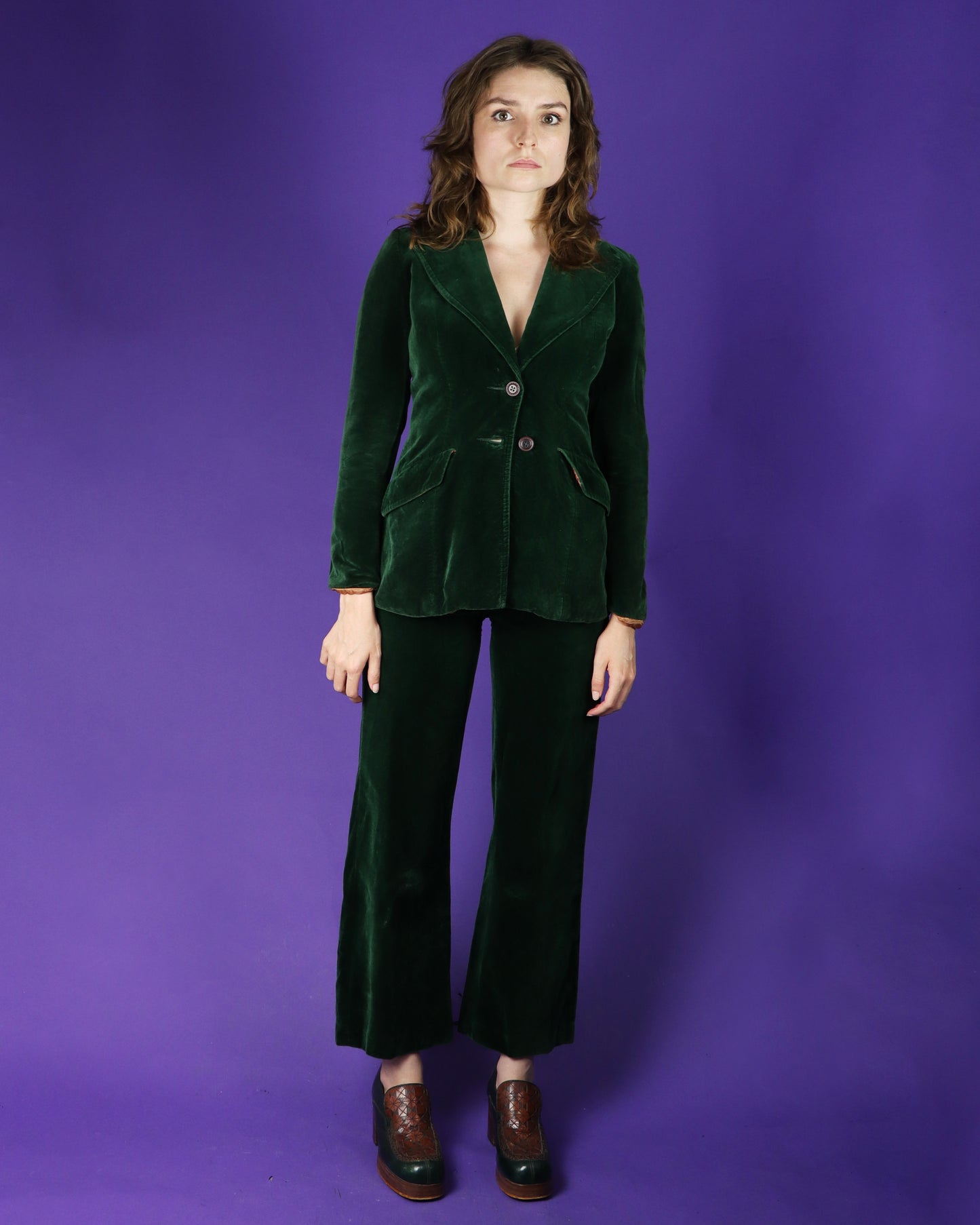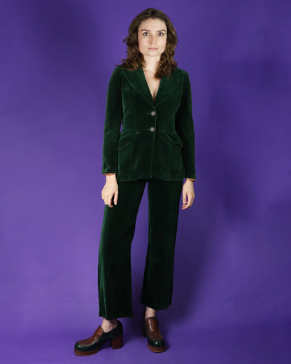 Fantastic vintage 1970s bottle green velvet suit. Plush velvet in a lustrous green colourway. The blazer is cut with a cinched waist, double button closure, slanted pocket tabs, peaked lapel. Matched with a pair of high waisted flares with a wide waistband and double button closure. Truly special colourway and form flattering cut. A totally chic trouser suit!