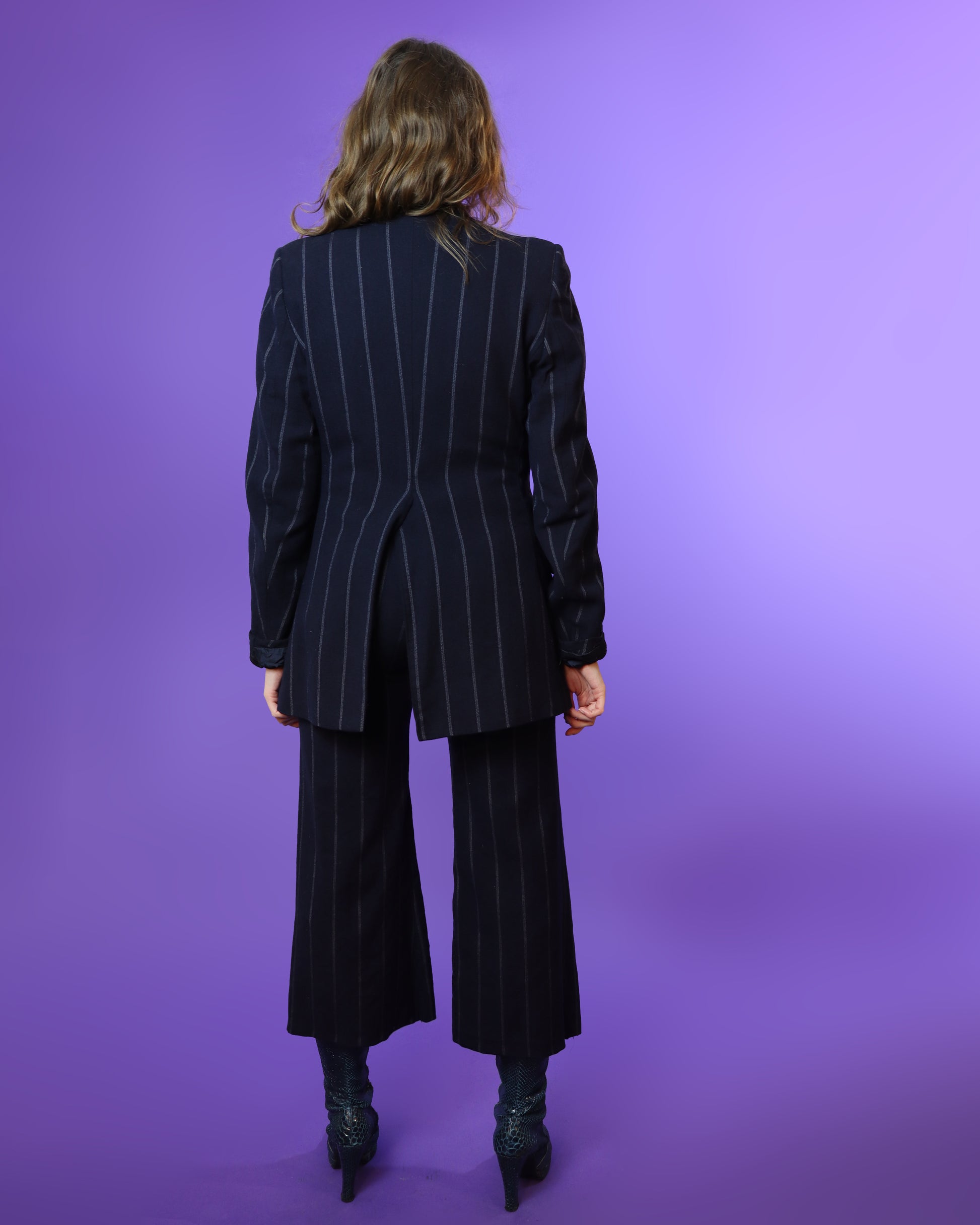 Note: a previous owner has cropped the length of the trouser, meaning this suit would be best suited to petite frames, or to show off some fabulous boots. This has been reflected in the price.