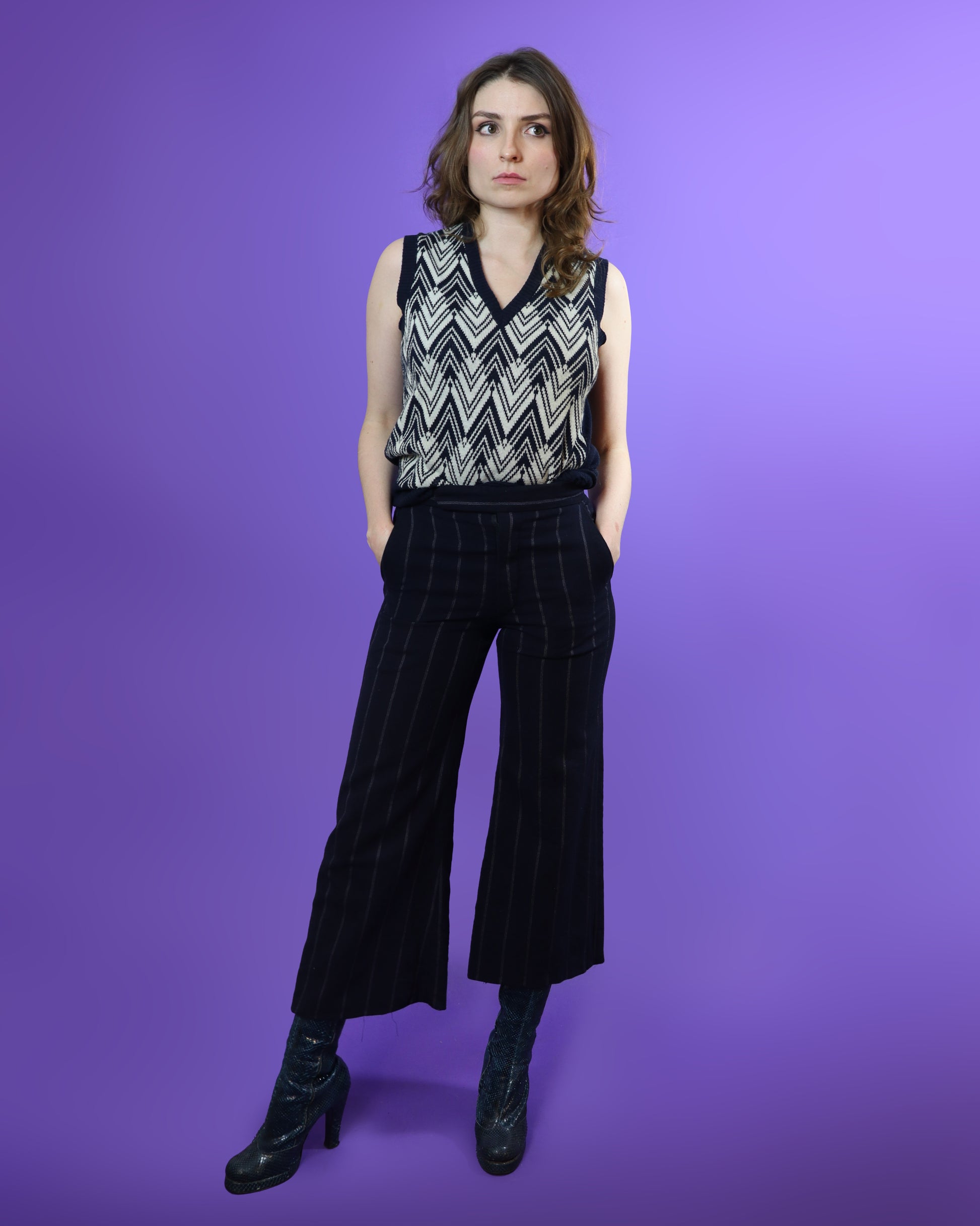 Vintage 1970s tailored trouser suit by Anderson of London. Navy blue woollen mix material with wide set pinstripe cut with a pair of bell bottomed slacks and a wide lapelled blazer. A brilliant cut & sharp silhouette! Super cool and flattering suit.