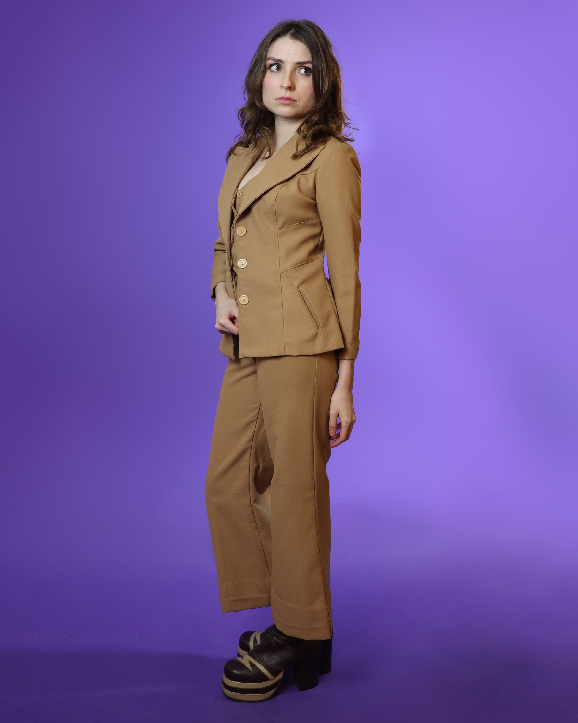 Vintage 1970s tan coloured 3 piece trouser suit. High waisted flares, button up waistcoat & a peak lapelled blazer with fab panelling details. Beautifully handmade and finished with matching buttons. Such a chic, classic colourway and a super flattering cut.