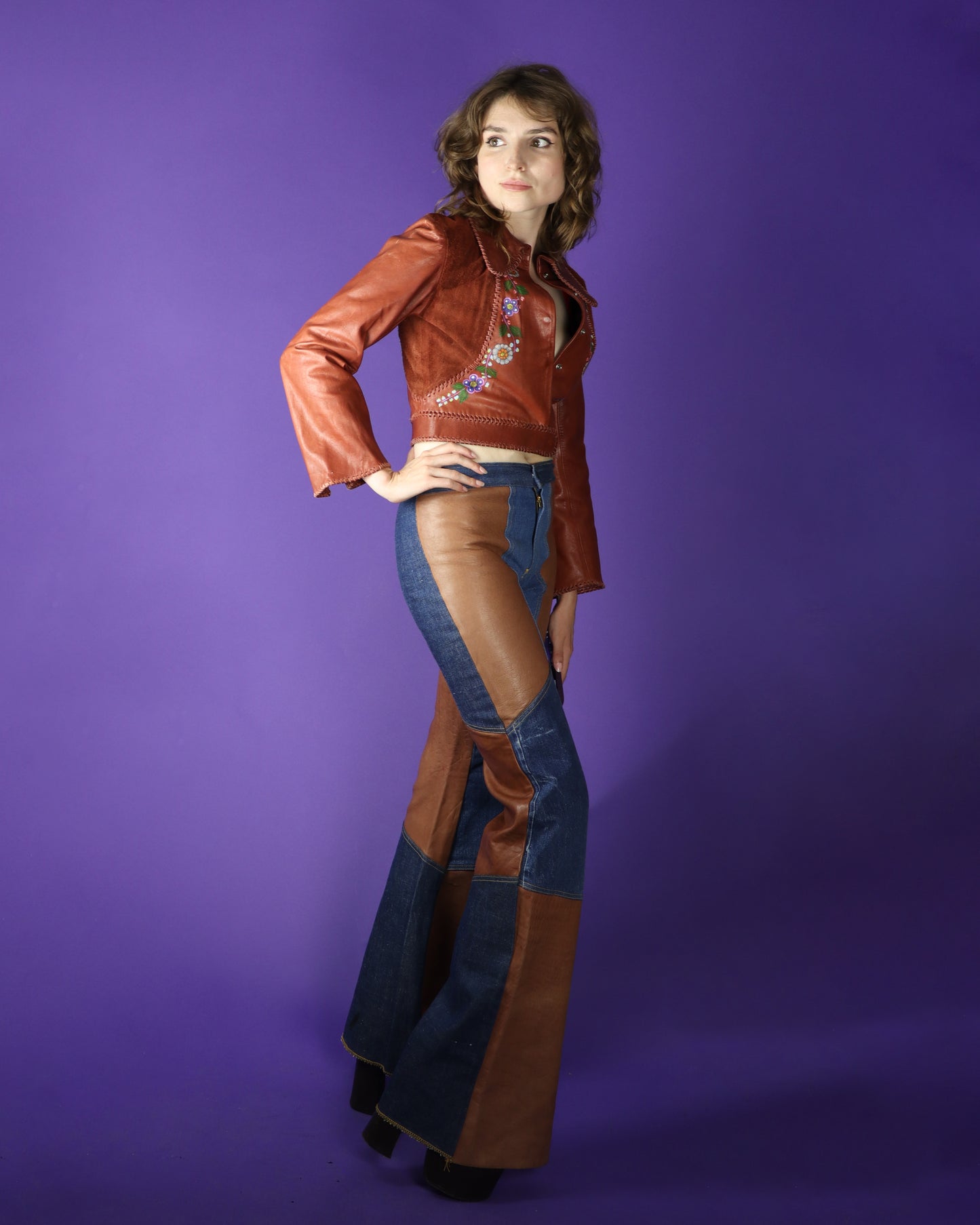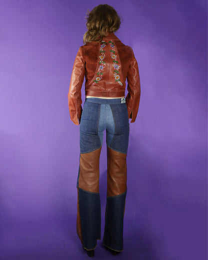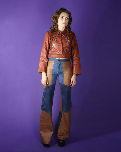 Vintage 1970s burnt umber leather and suede jacket handcrafted so beautifully by renowned leather label ‘Char’ (Designer Charlotte Blankenship de Vasquez, made in Mexico). Hand painted floral detailing, whipstitch seams, wooden slice buttons and curved panelling, bell sleeves (which have an open seam for cuffing!), large rounded collar and cropped waist length. Fastens with hidden poppers. A truly special jacket- I love the clever textural use of the suede and leather panels contrasting eachother.