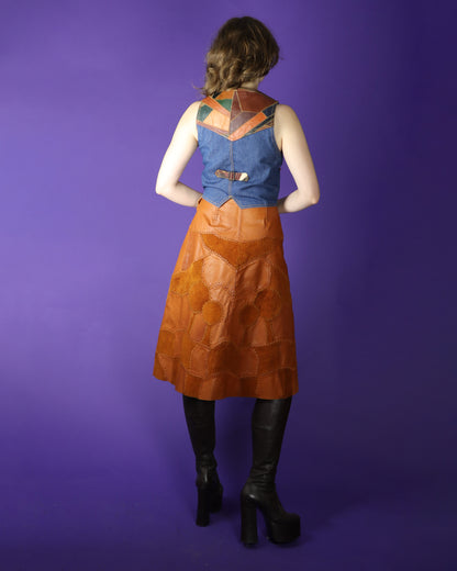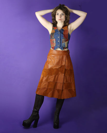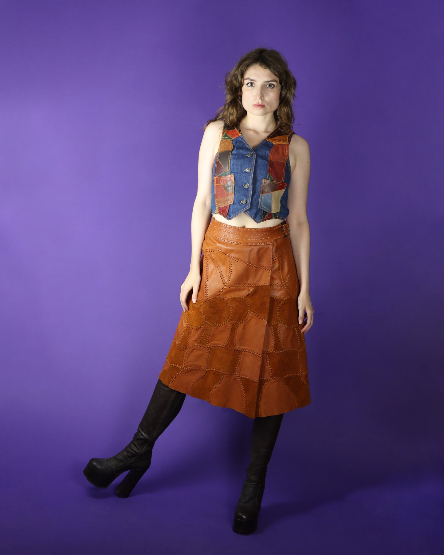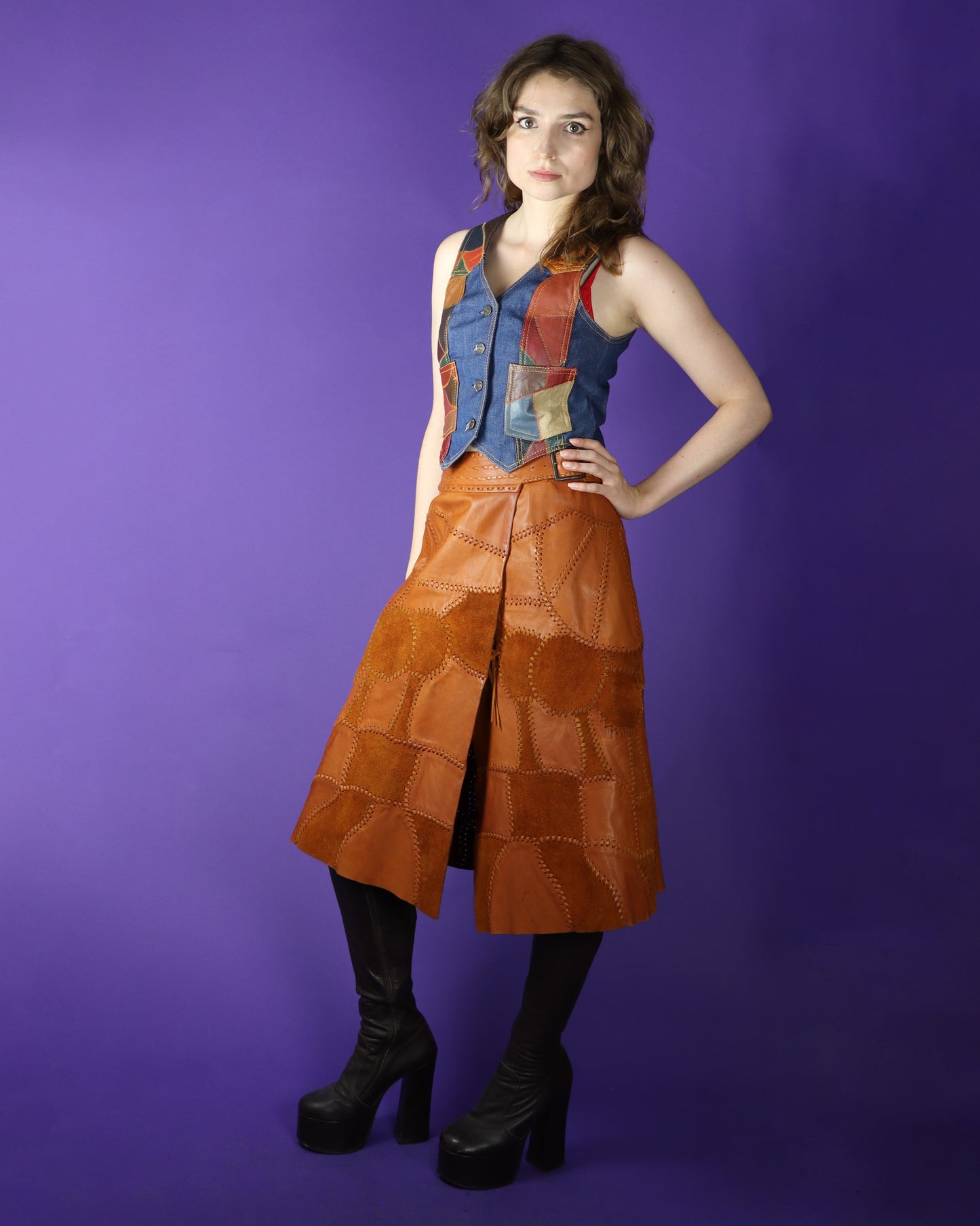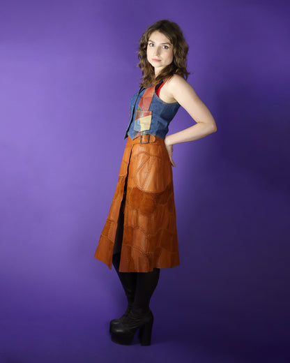 Hand-made in 1970s Mexico by iconic and sought after leather maker 'Char', this midi skirt is a work of art!! Patches of leather and suede whip-stitched together into a woodland scene. We love the clever monotone tan suede & leather used- it creates an interesting depth in textures.