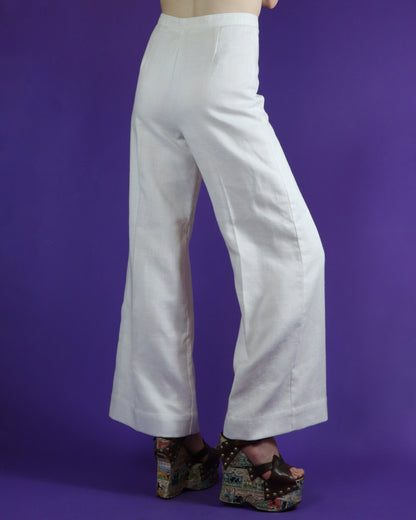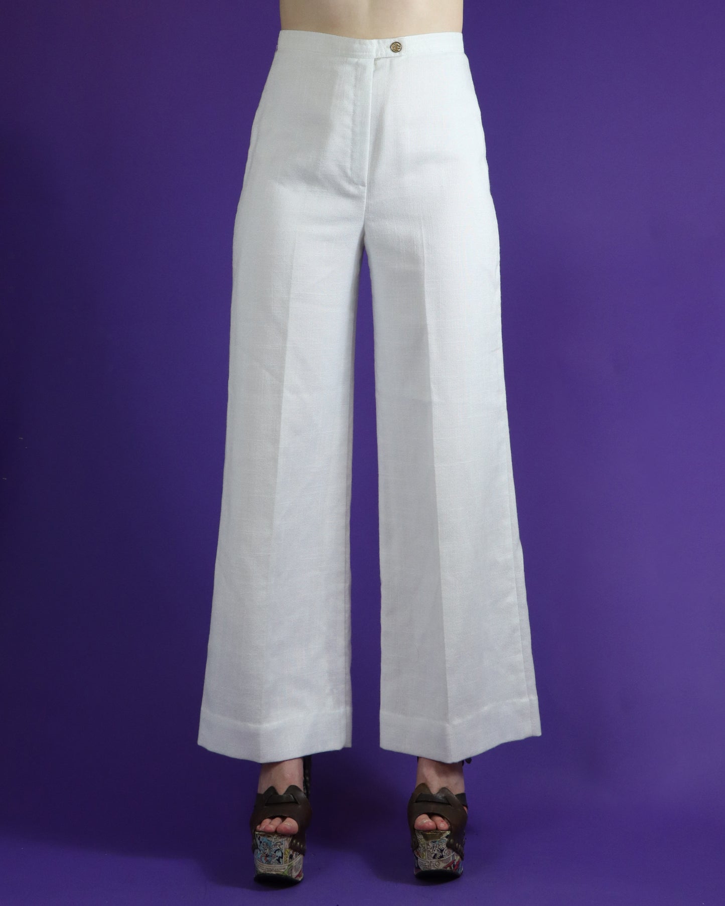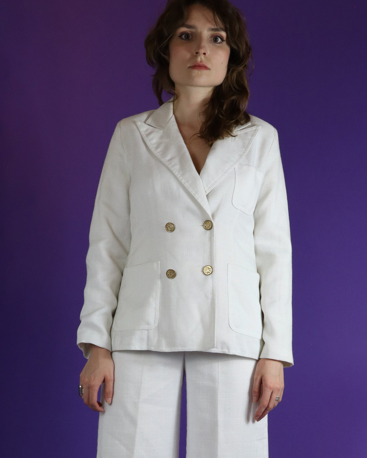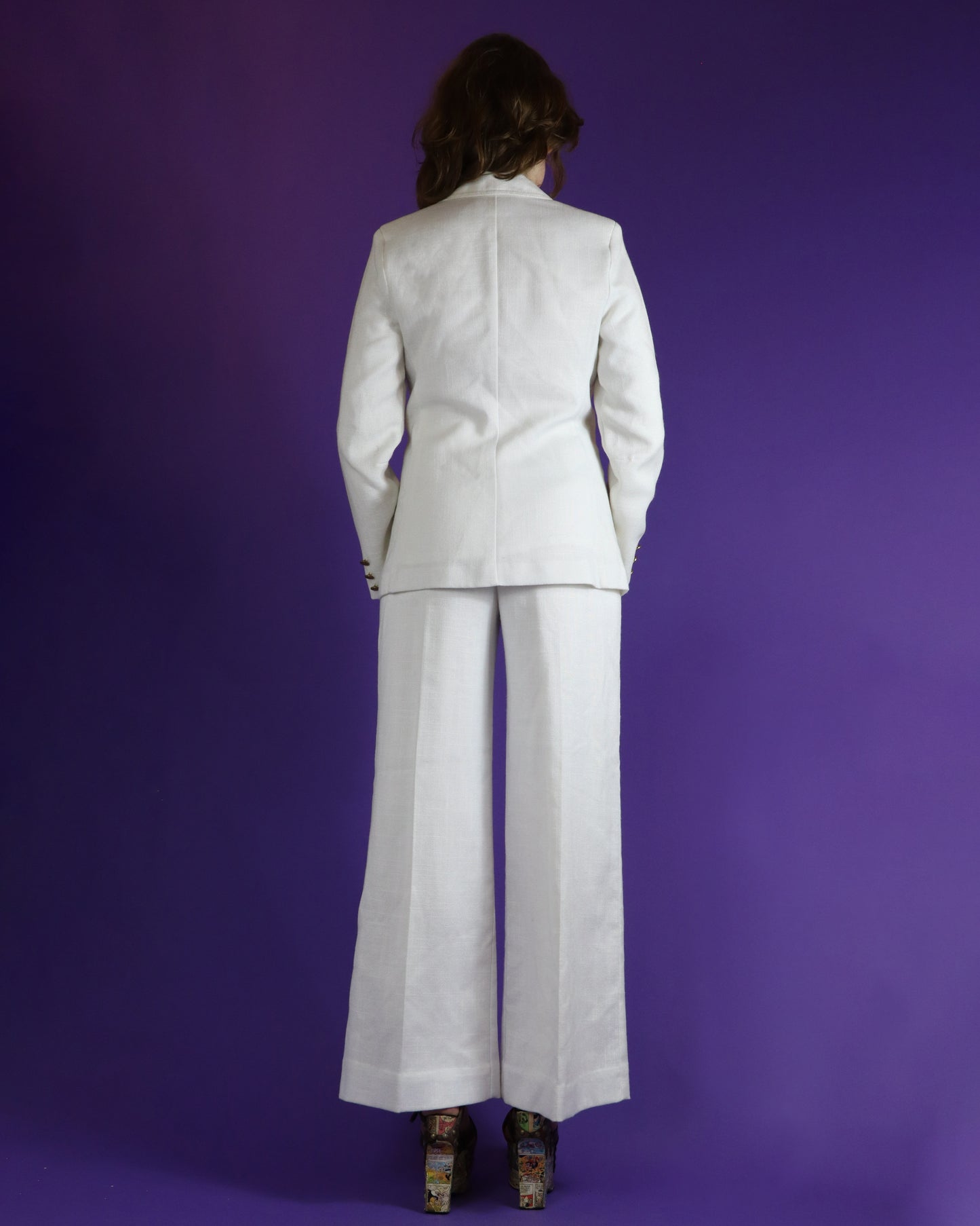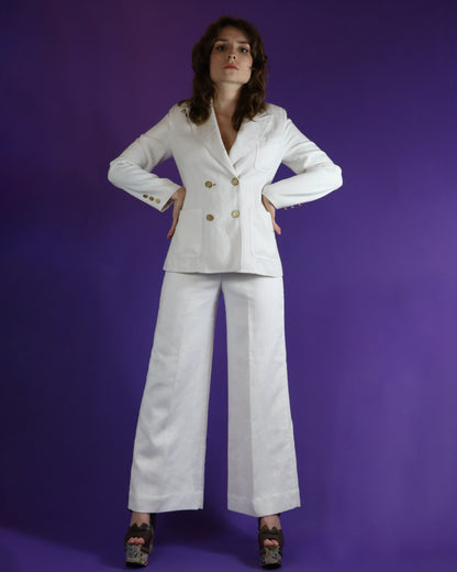 Vintage 1970s 2 piece white linen trouser suit by Bronson California. Double-breasted peaked lapel blazer and high waisted palazzo flares. Beautifully made in a pure white linen material and finished with gold tone buttons and a full lining. A 70s white trouser suit is the epitome of cool; it is synonymous with Bianca Jagger chic! Appears to be barely worn!