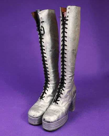 Super rare to find platforms in this larger size, and the knee length lace up design is so special! Absolute glam rock dream piece.