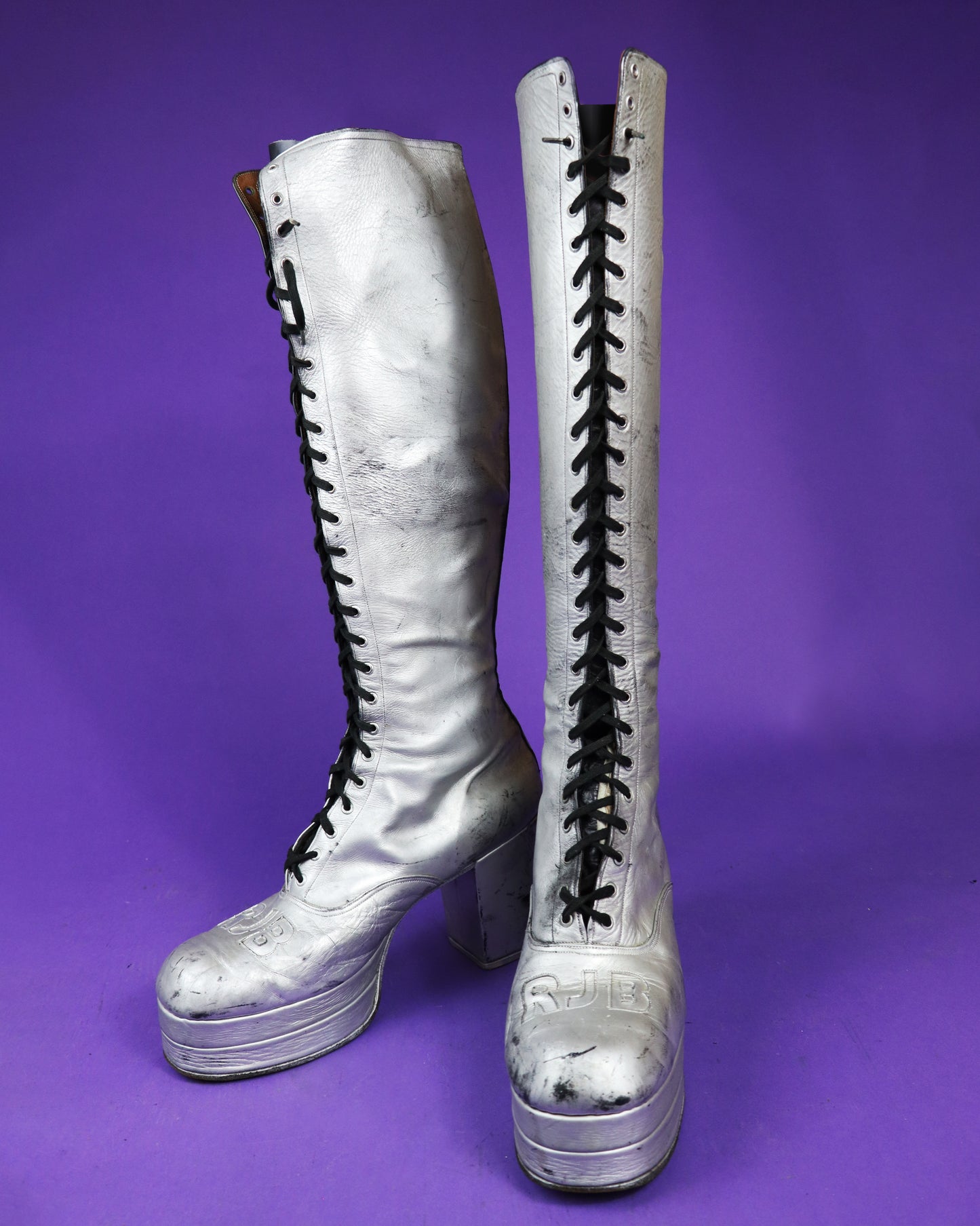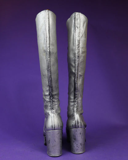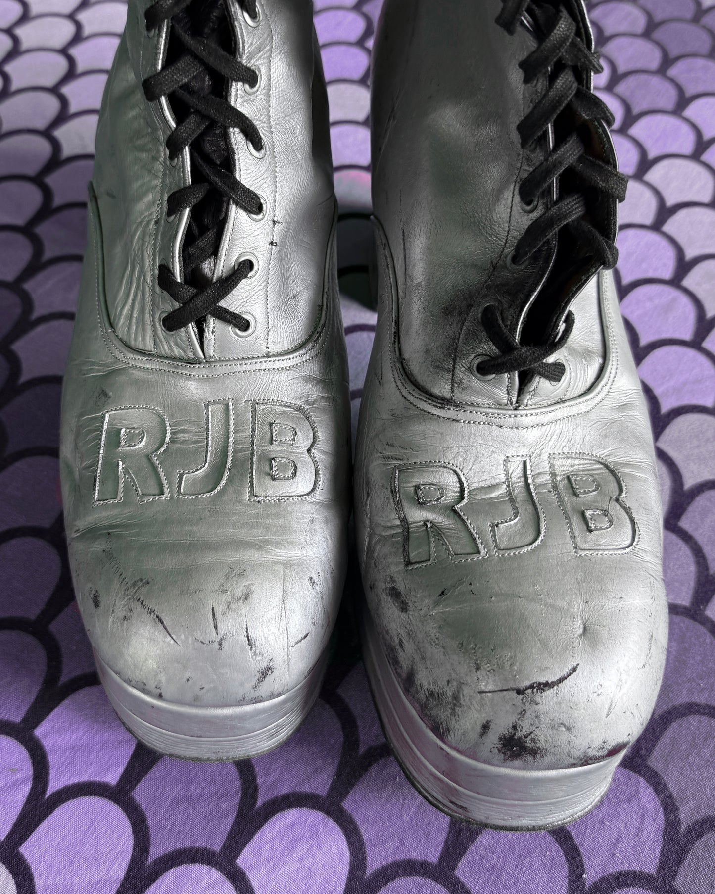 Custom silver sprayed leather boots featuring the original owner's initials 'RJB' embedded on the front! (originally owned by a well regarded British tailor). The DIY paint job has lasted well and gives these shoes so much glam rock charm. Perfectly worn in and distressed.