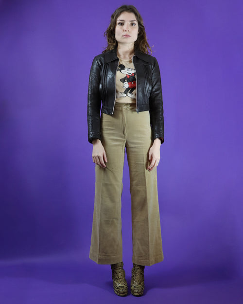 Vintage 1970s cropped length leather jacket. Super dark brown leather with a gorgeous patina. Features ridge detailing, articulated pockets, heavyweight zipper, large dagger collar and short length- perfect for pairing with high waisted trousers. Fully lined. Hard to find 70s bomber style jackets in this smaller size!