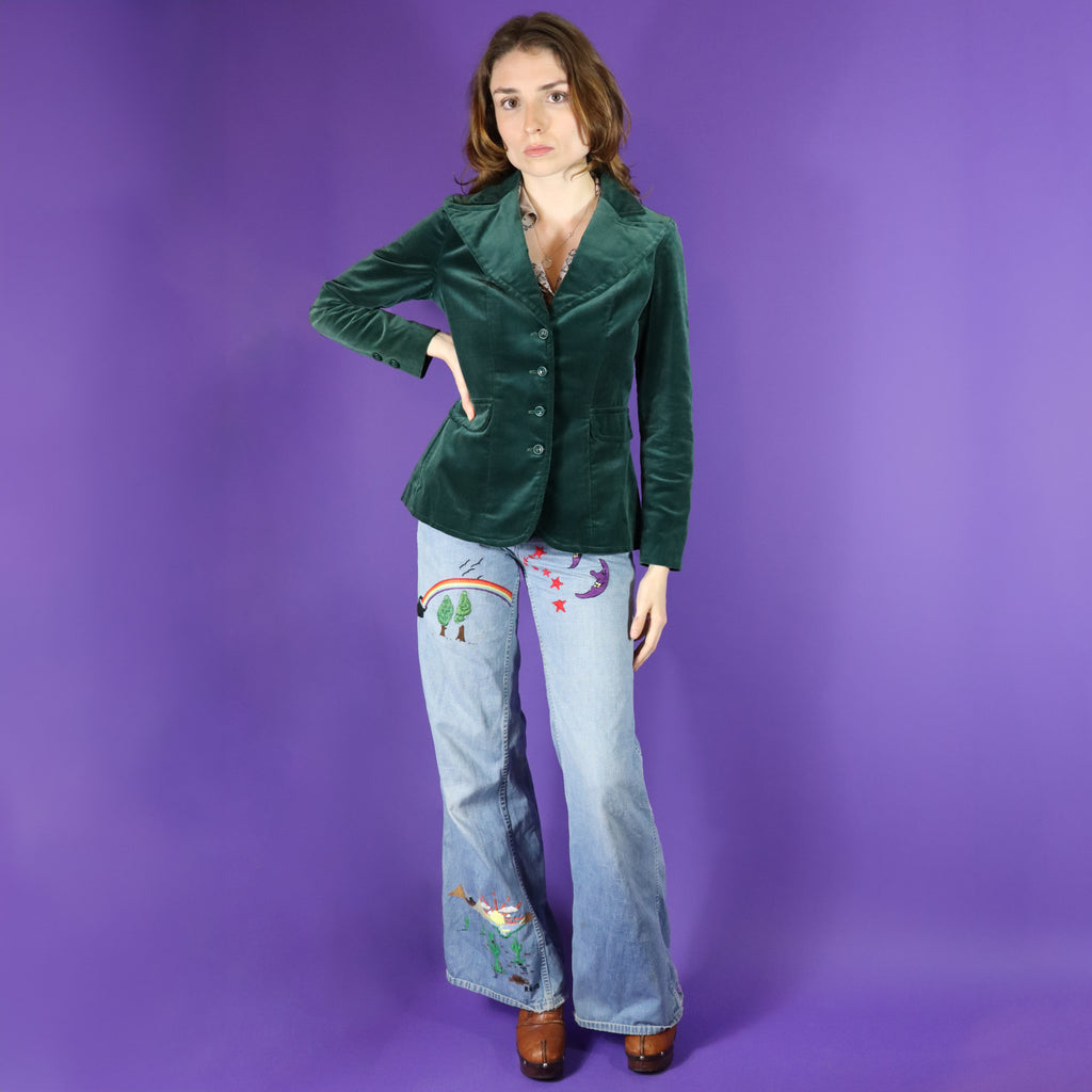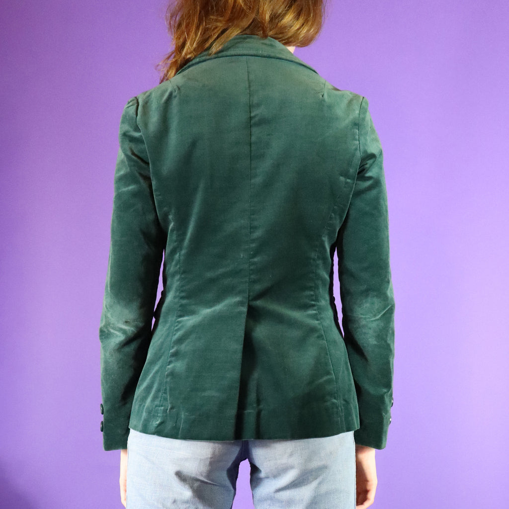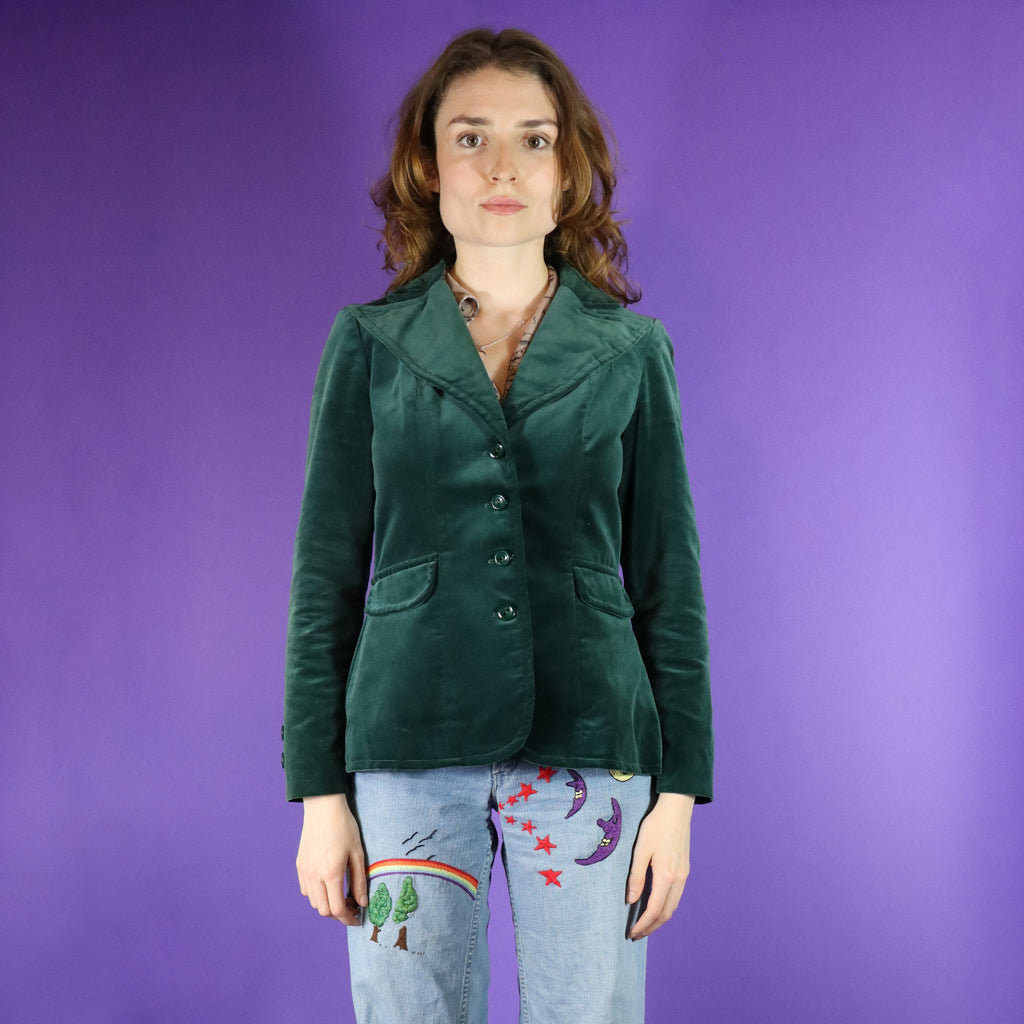Vintage 1970s College Town velvet blazer. Super beautiful opulent dark forest green with a gorgeous lustre- a plush cotton velvet. Cut with a wide dramatic peaked lapel, tight fit and row of matching buttons. Looks great worn with jeans!
