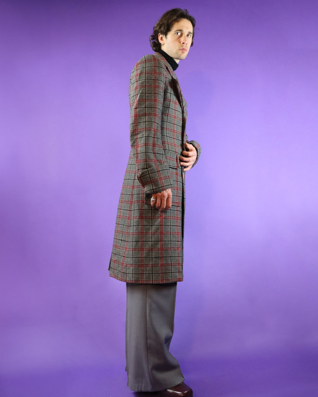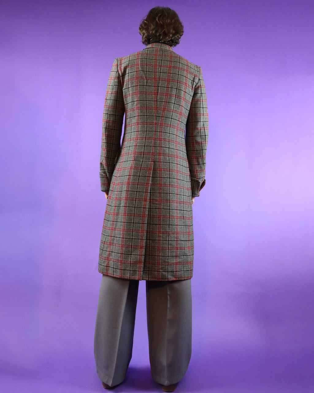 Fabulous vintage 1970s coat by Kings Road label 'Dandy'. Woollen mix plaid twill with stripes of grey, black, white and red- super striking. Fantastically cut with a dramatic wide lapel,sharp shoulders, centre back vent, patch pockets and finished with oversized shell buttons. I love the knee length and sleek silhouette- a super special coat.