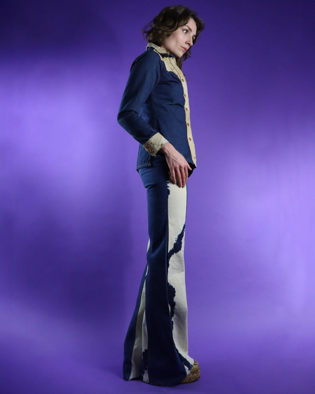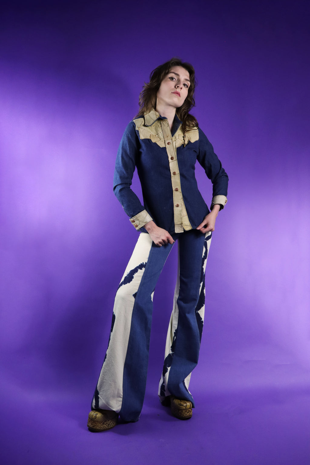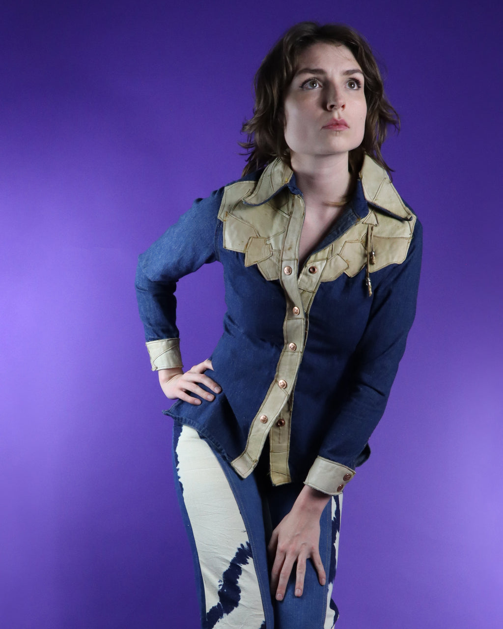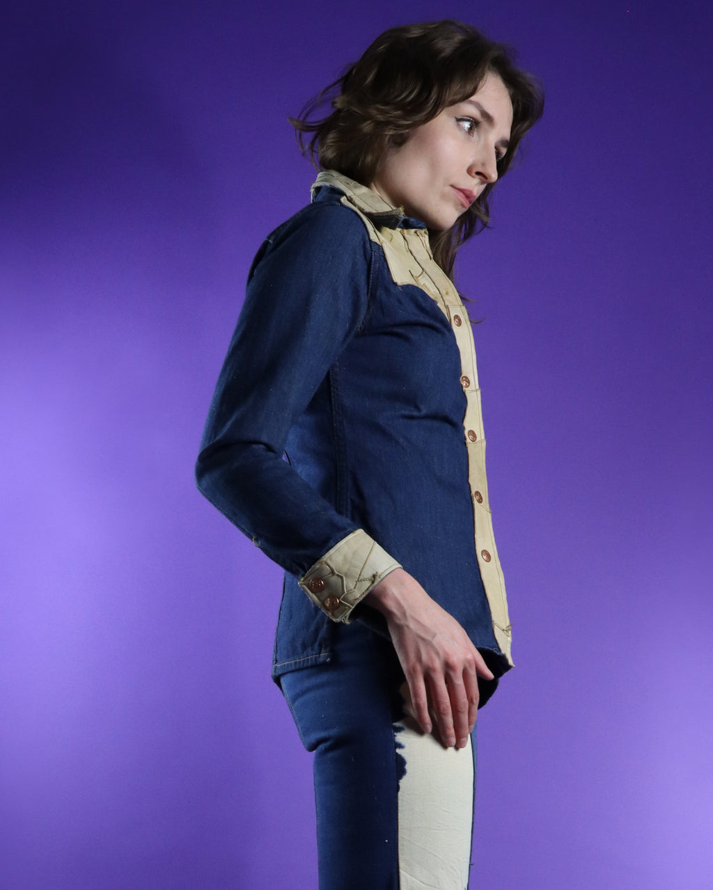 Beautiful vintage 1970s denim shirt with patchwork leather detailing. Made in Mexico by renowned and collectible Sante Fe based label 'M&H'. Dark indigo denim with patchwork cream leather yoke, button tabs, dagger collar and cuffs. Fastens using copper toned metal poppers. Form fitting super flattering cut. So beautifully crafted! I love the beaded tassel arrow detail.