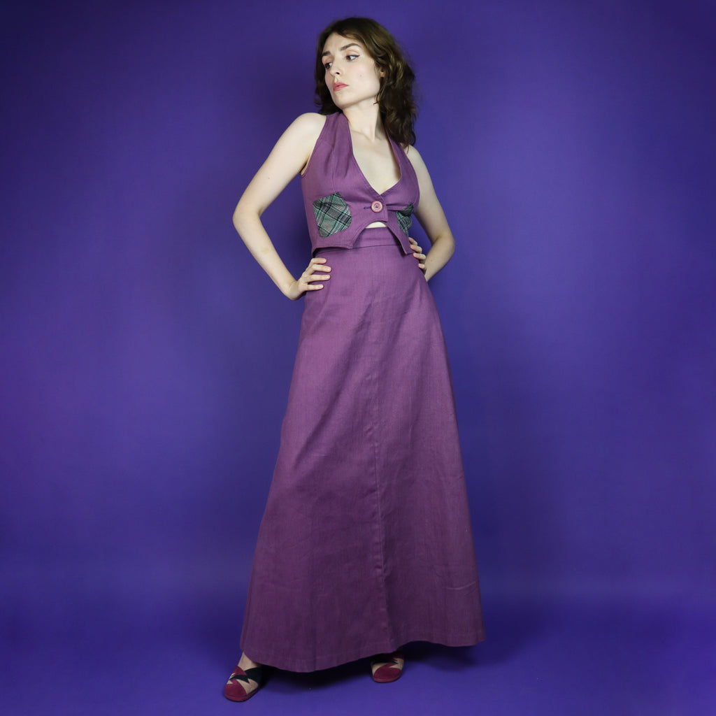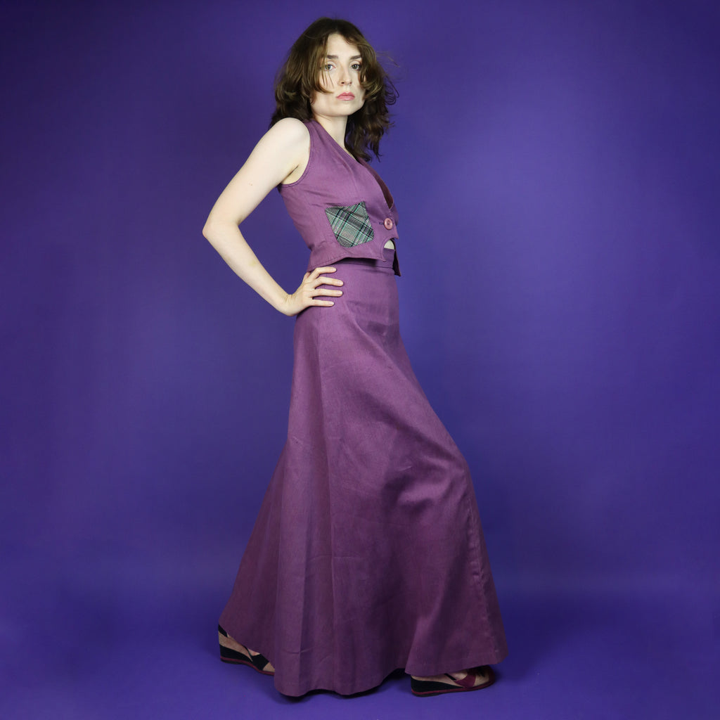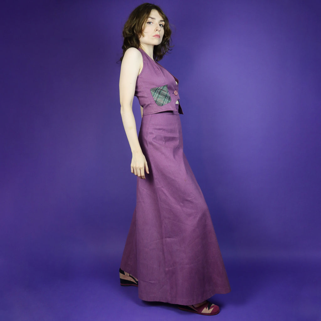 Vintage 1970s purple denim two piece by Highlight. A cute curved bottom waistcoat with gingham patch pockets, paired with a high waisted a line maxi skirt. A flattering and intelligent cut with loads of 70s charm. Wear with nothing underneath in the summertime or layer up with a rollneck in wintertime. A versatile set in a striking and unusual colourway.