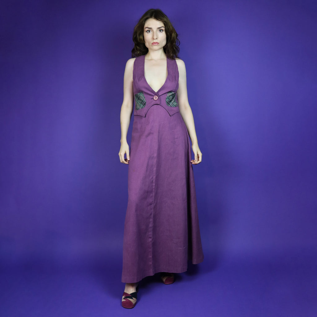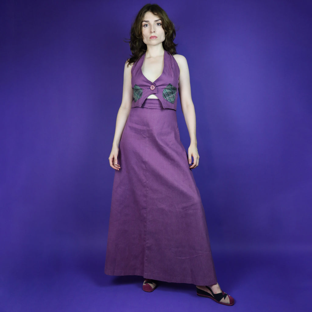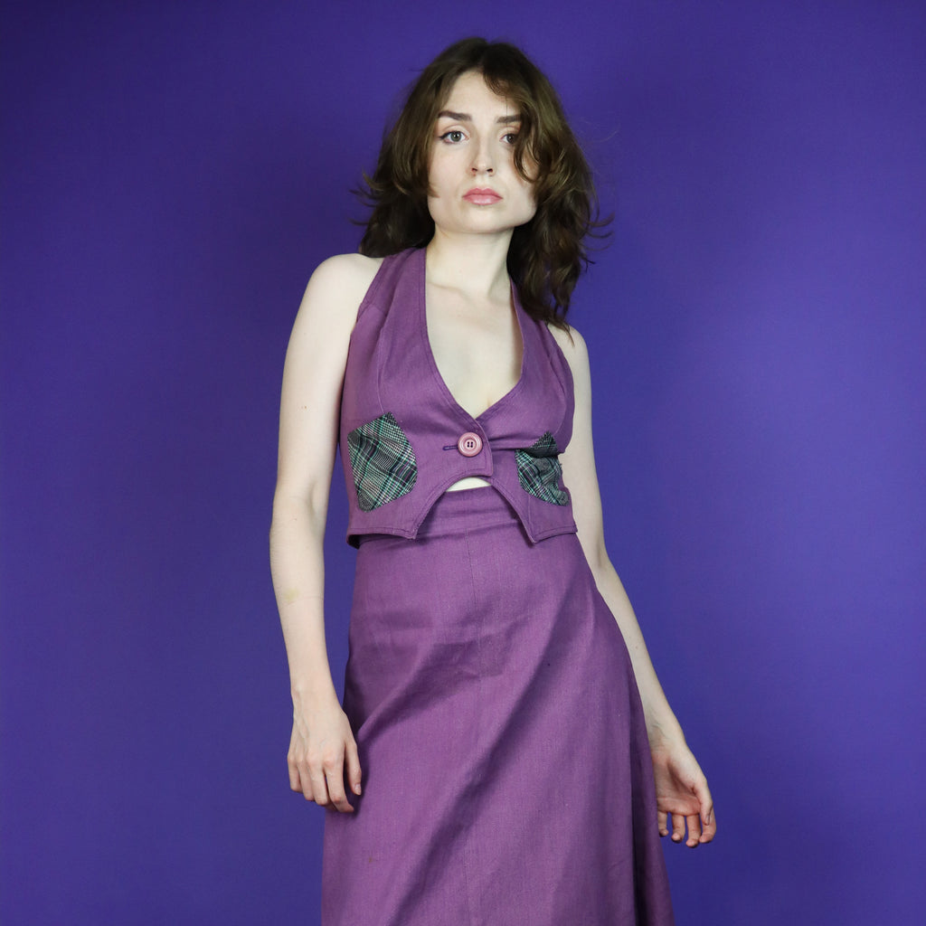 Vintage 1970s purple denim two piece by Highlight. A cute curved bottom waistcoat with gingham patch pockets, paired with a high waisted a line maxi skirt. A flattering and intelligent cut with loads of 70s charm. Wear with nothing underneath in the summertime or layer up with a rollneck in wintertime. A versatile set in a striking and unusual colourway.