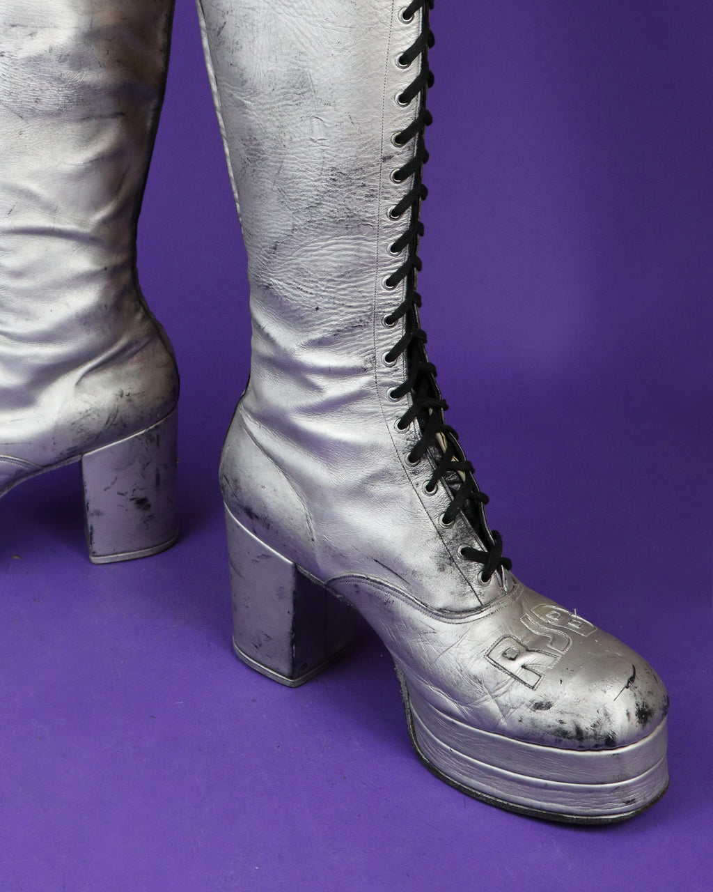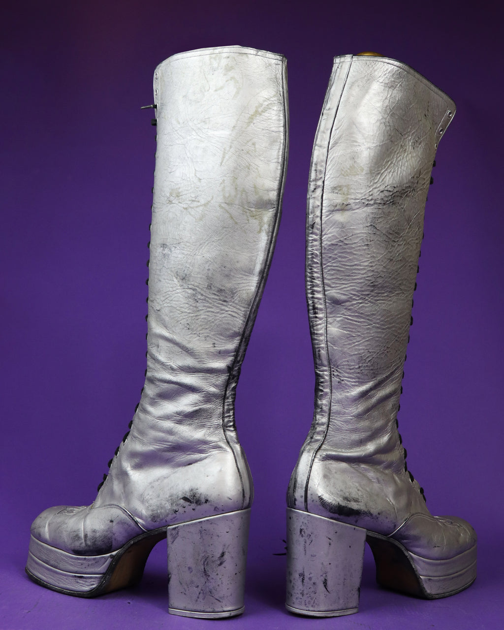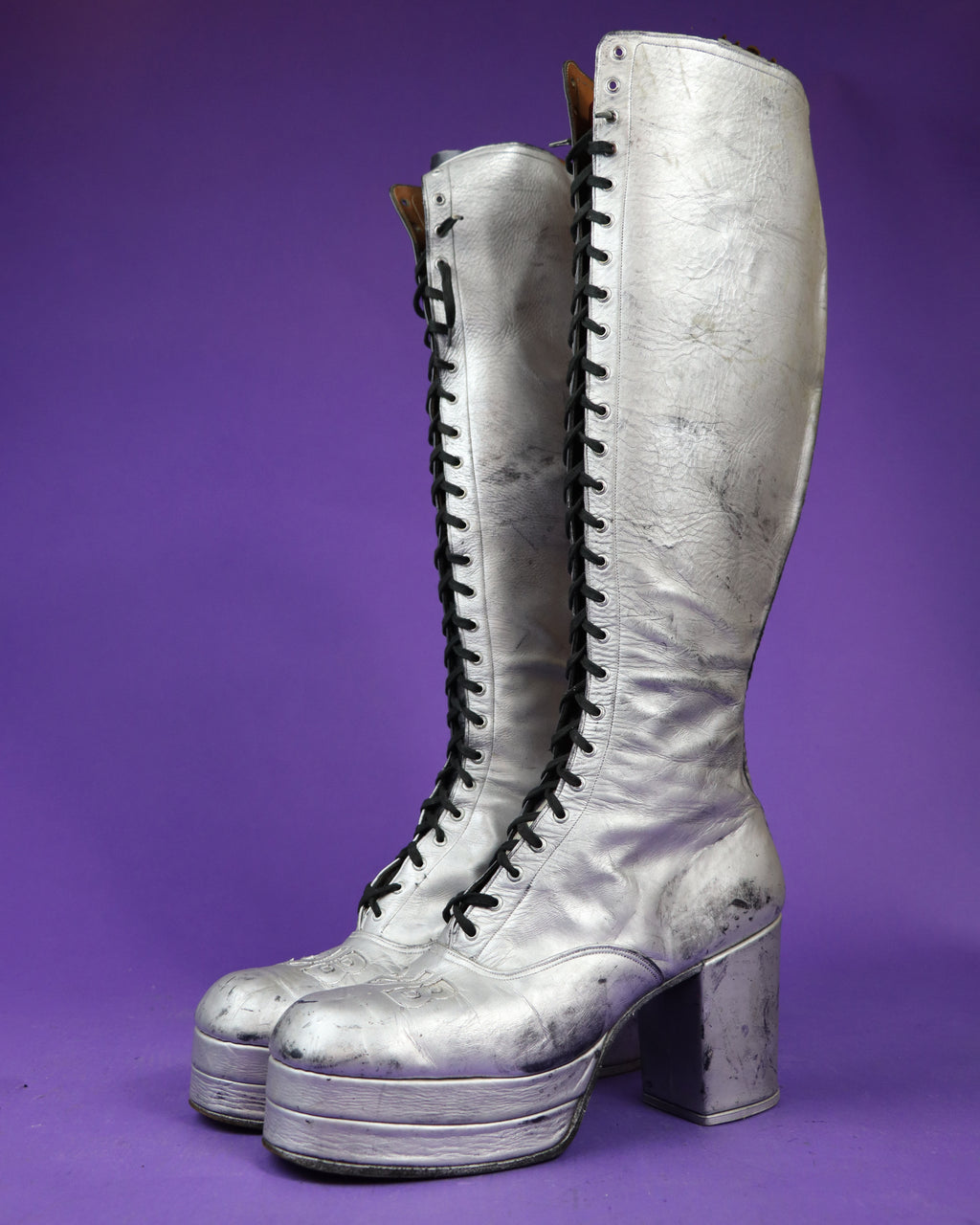 Super rare to find platforms in this larger size, and the knee length lace up design is so special! Absolute glam rock dream piece.