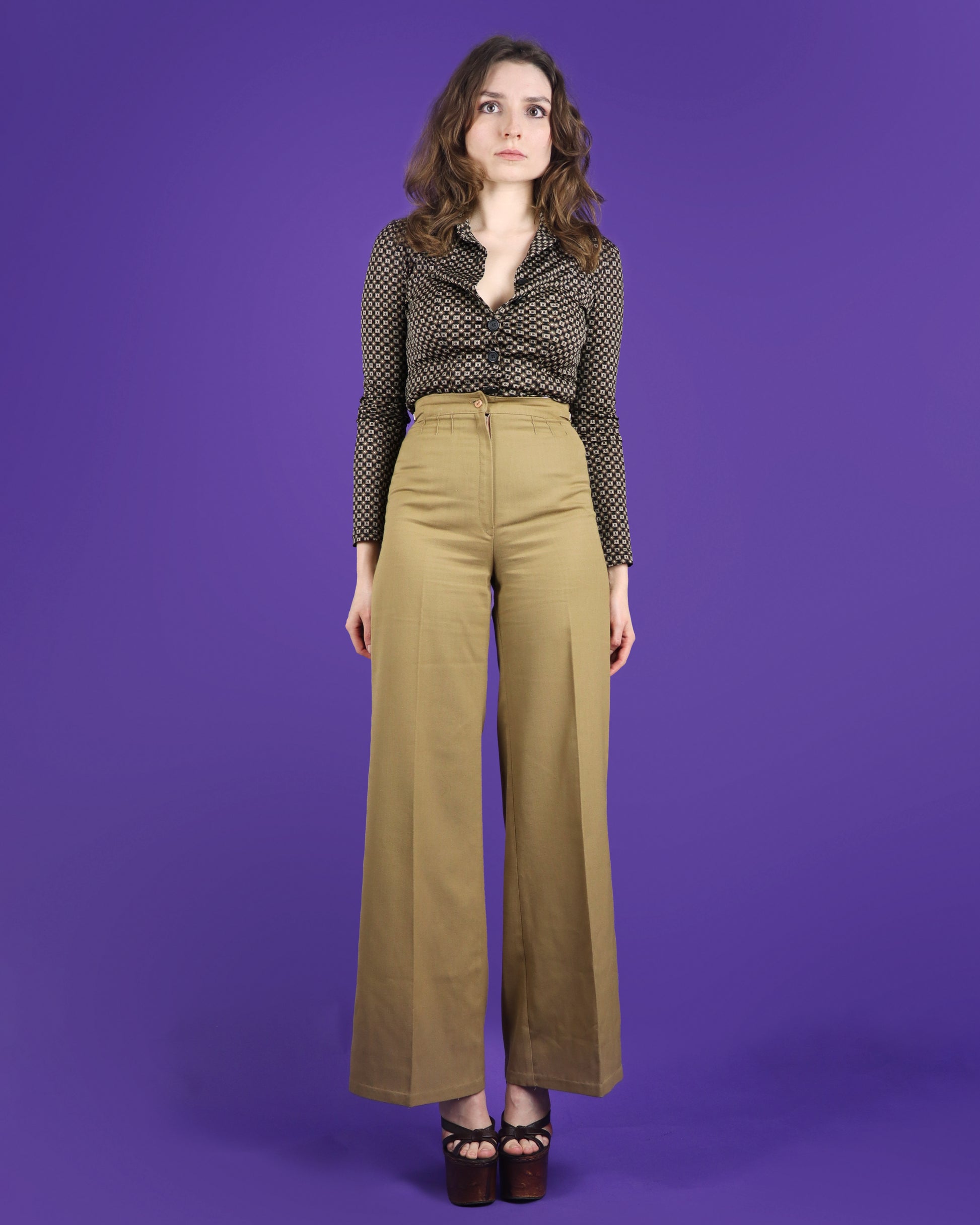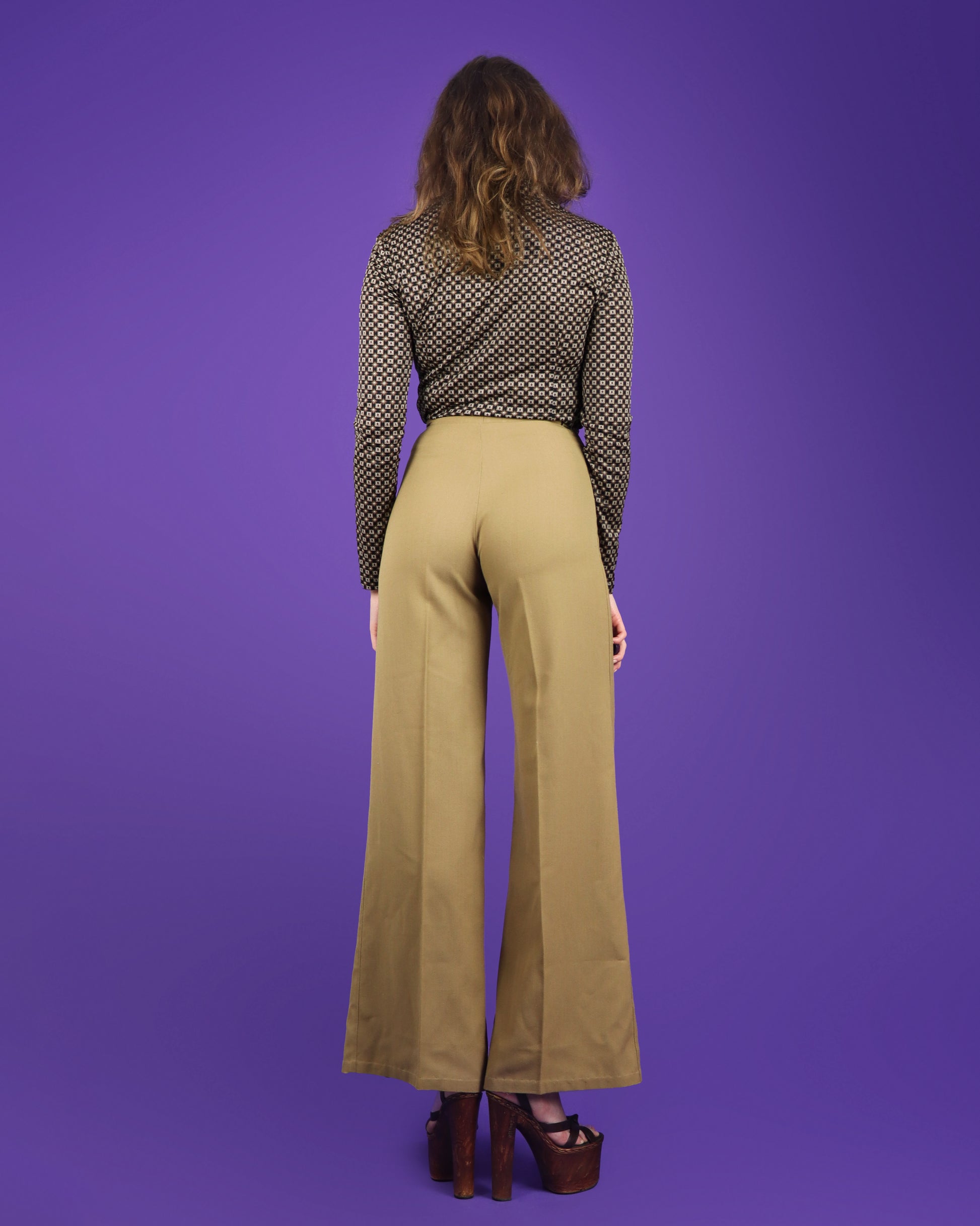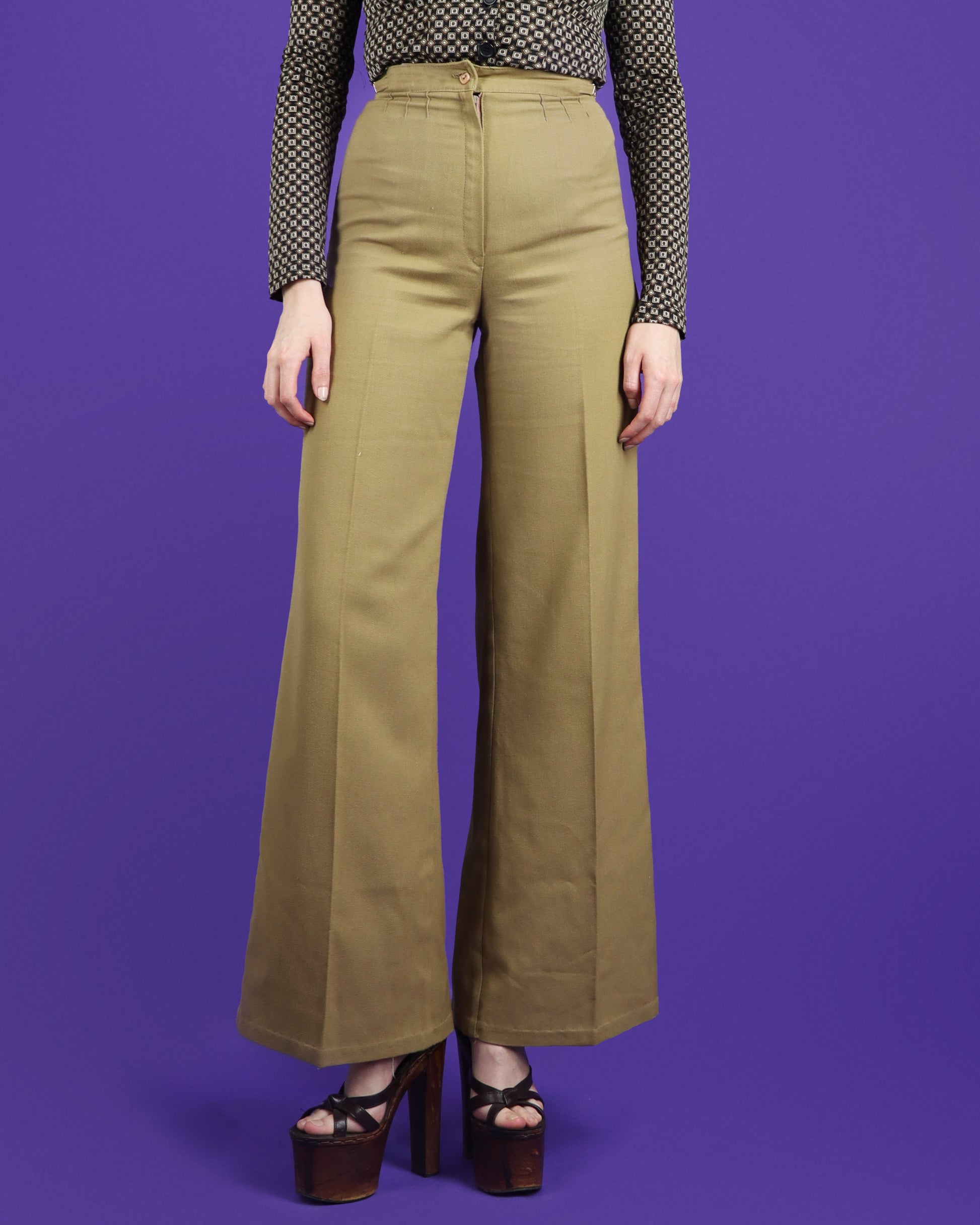 Vintage 1970s brown parcel coloured flares by C&A. Cotton gabardine beautifully cut with a super high waistband and a wide leg flare from the hip. Beautifully finished with sunray detailing below the waistband, gold tone metal waistband detail and knife edge pleating. A wardrobe staple!