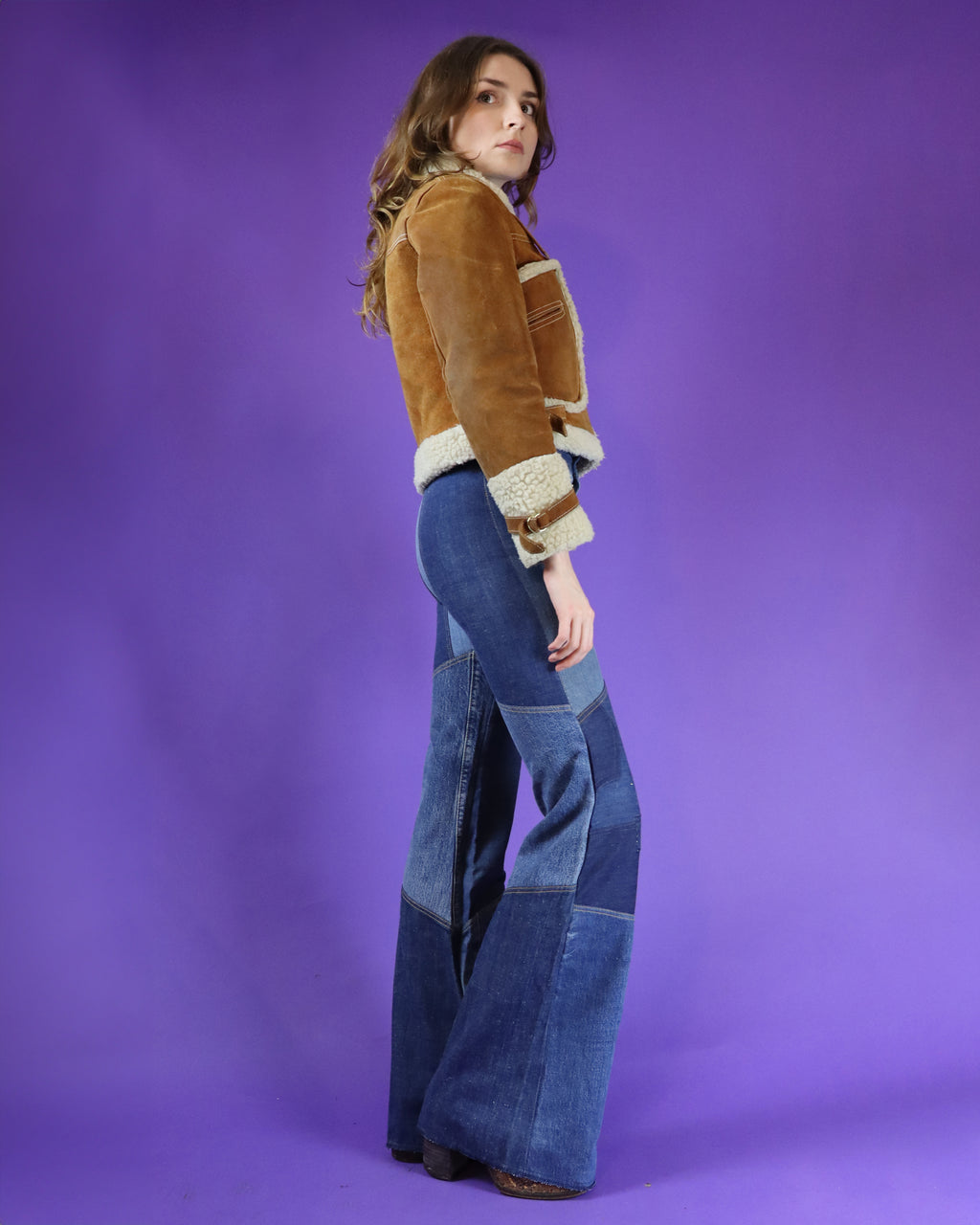 Vintage 1970s faux sheepskin trim suede jacket. Made by 'Leathers by Ambe'. Classic 70s aviator style with straps and buckles, patch pockets and fleece lining and trim. Tan suede colourway with contrast cream lining which is super warm! I love the cropped length-perfect for wearing with high waisted jeans. So hard to find these jackets in smaller sizes!