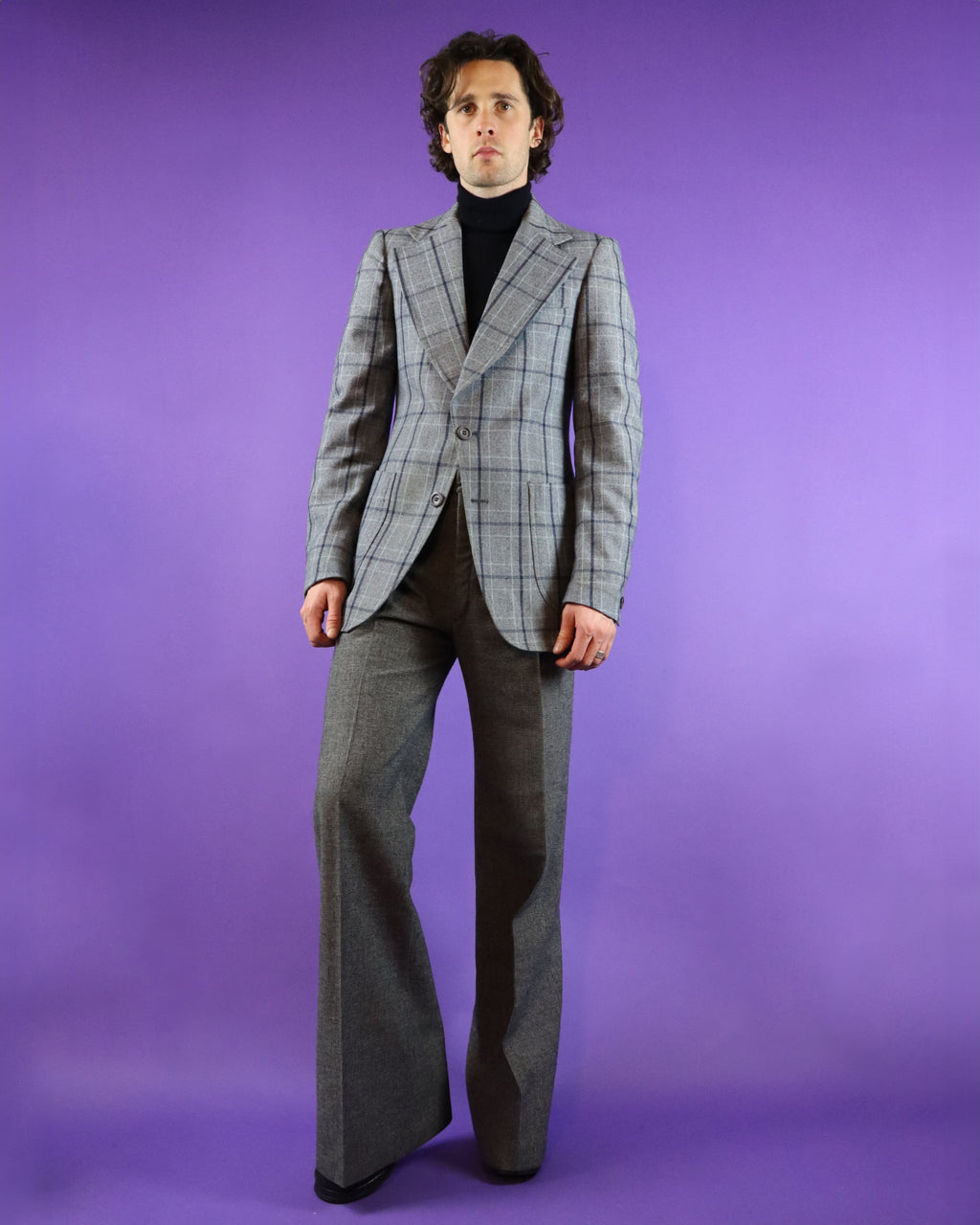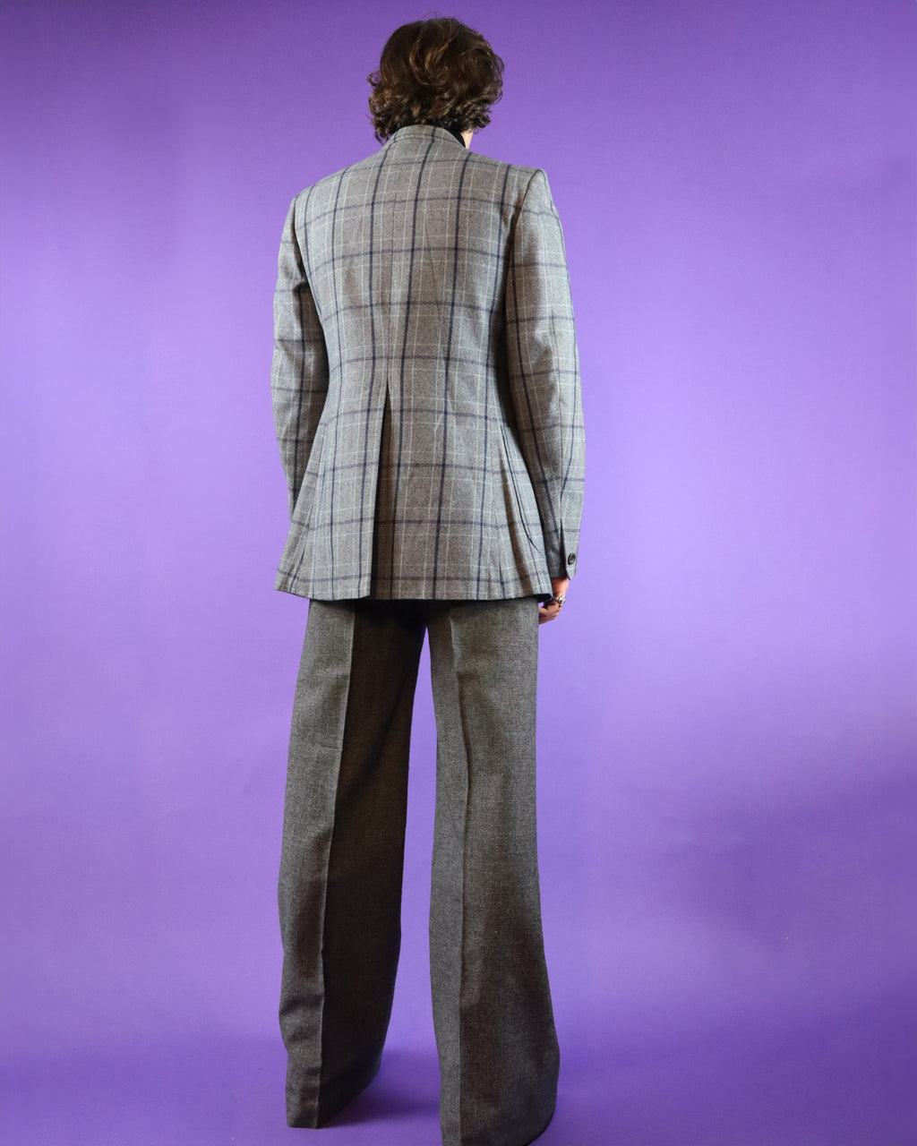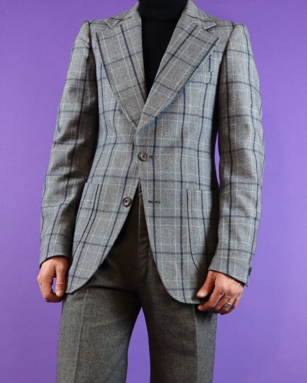 Vintage 1970s plaid blazer by John Collier. Woollen mix twill with cool grey and blue undertones and a blue plaid design. Cut with a sharp shoulder, cinched waist, centre back vent, wide lapel and patch pockets. Super suave piece of 70s tailoring.