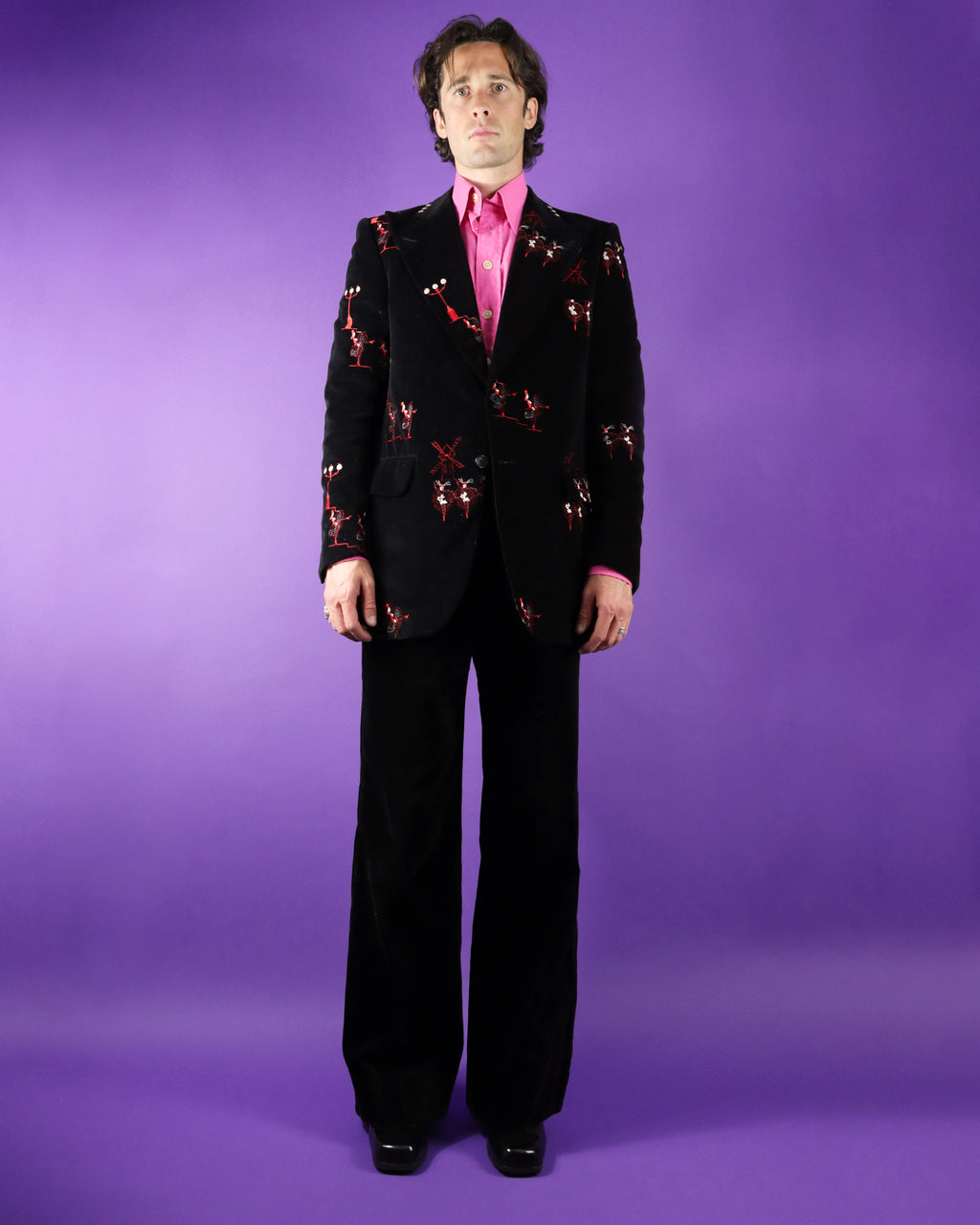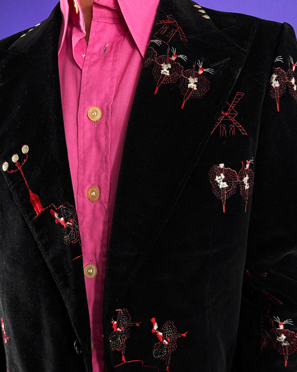 Incredible rare vintage 1970s blazer by Soho tailor 'James & James'. Black velvet with suave satin stripe down each side, adorned with contrast red and white embroidery depicting French cabaret motifs including dancers, windmills and lamp posts- very Moulin Rouge. I love the can can dancers with bloomers on display! Cut with a peaked lapel and featuring lots of lovely finishings and high quality details. A true work of art and piece of fashion history.