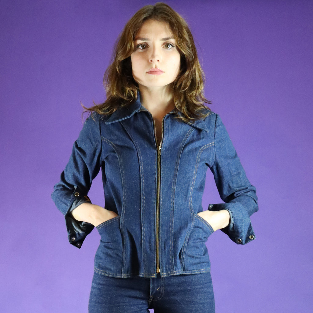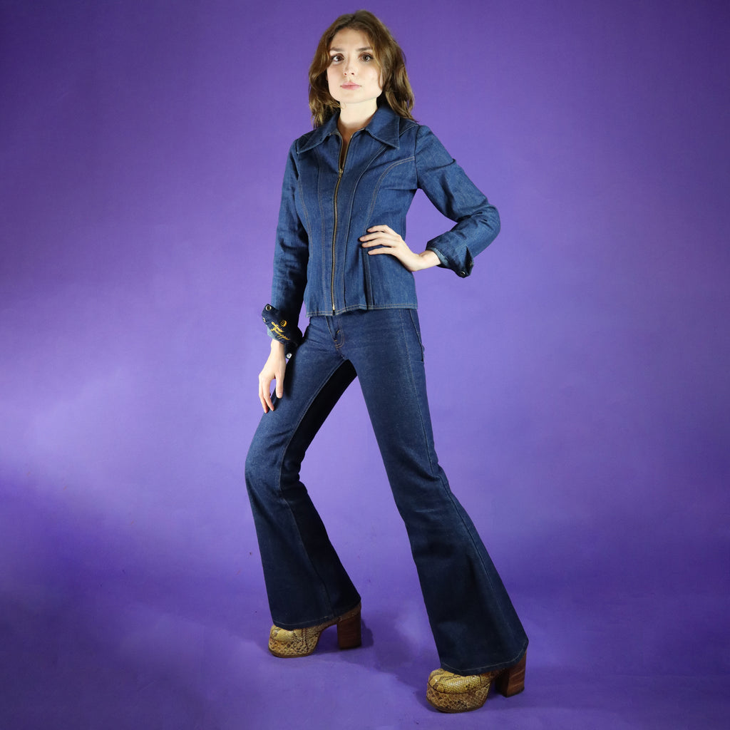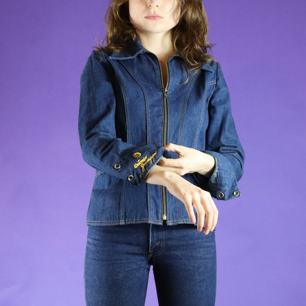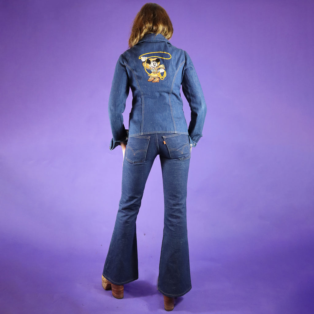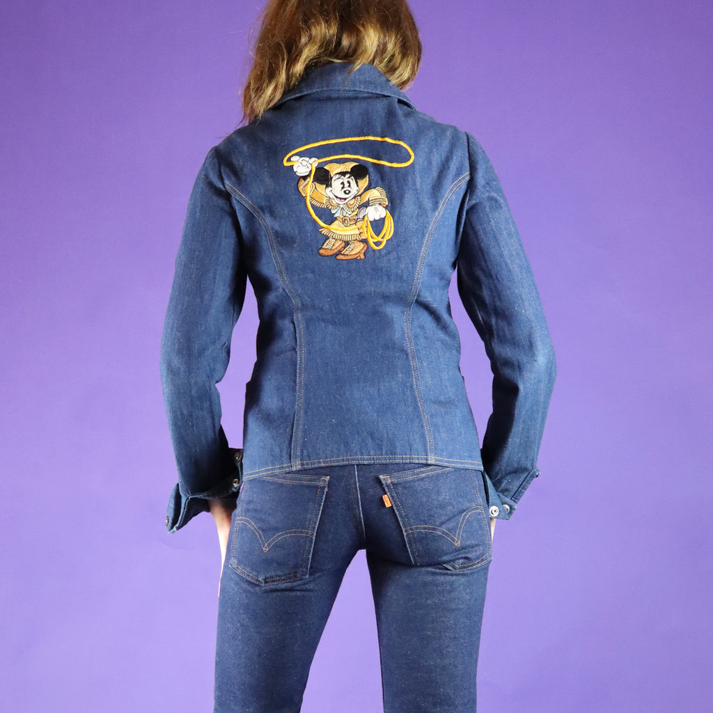 Vintage 1970s denim jacket by iconic denim label Antonio Guiseppe. Dark wash denim with beautiful curved panels, dagger collar and golden double stitching. Part of the brand's official collaboration with Disney- this jacket features a beautifully embroidered cowgirl Minnie Mouse. Iconic collector's piece!