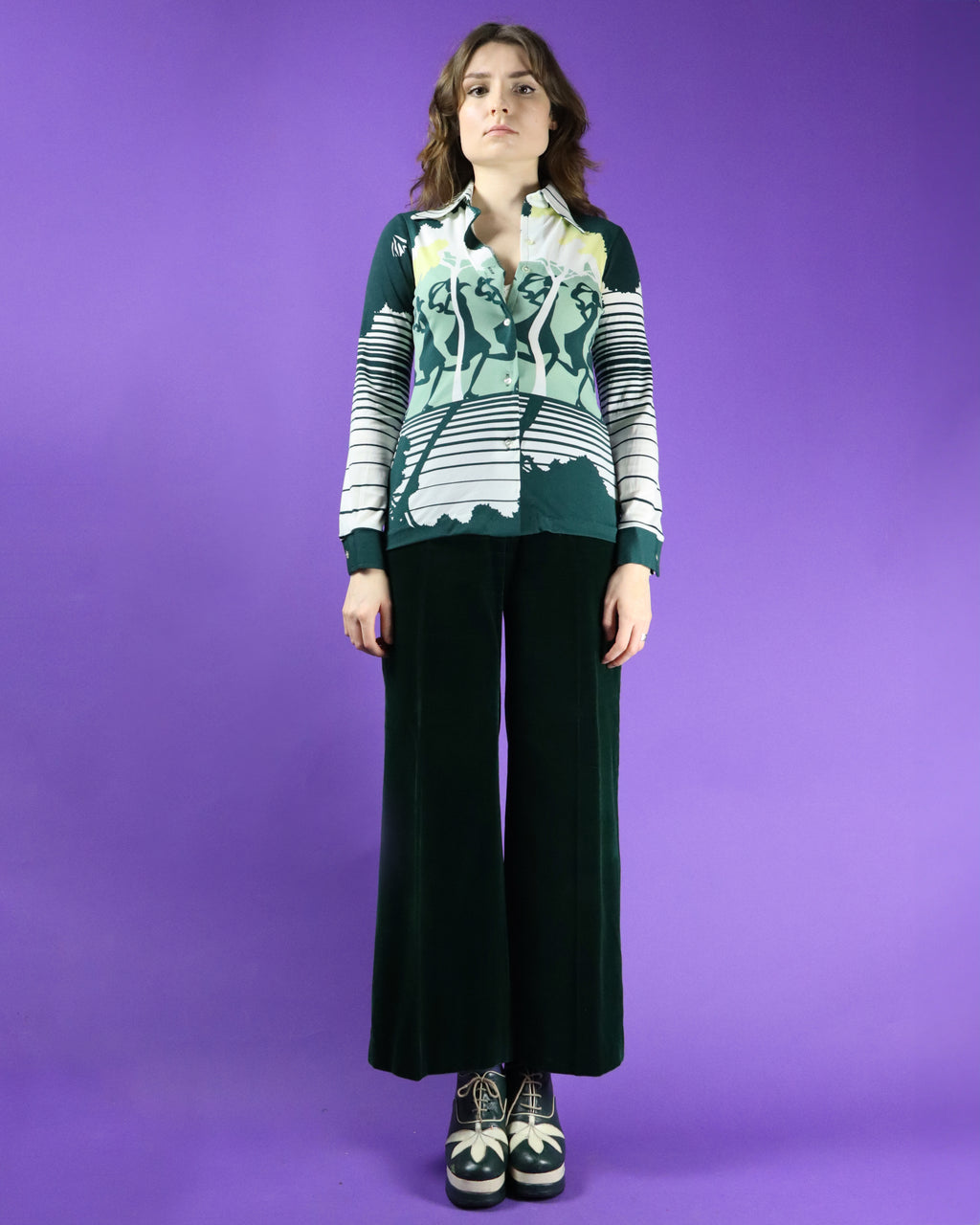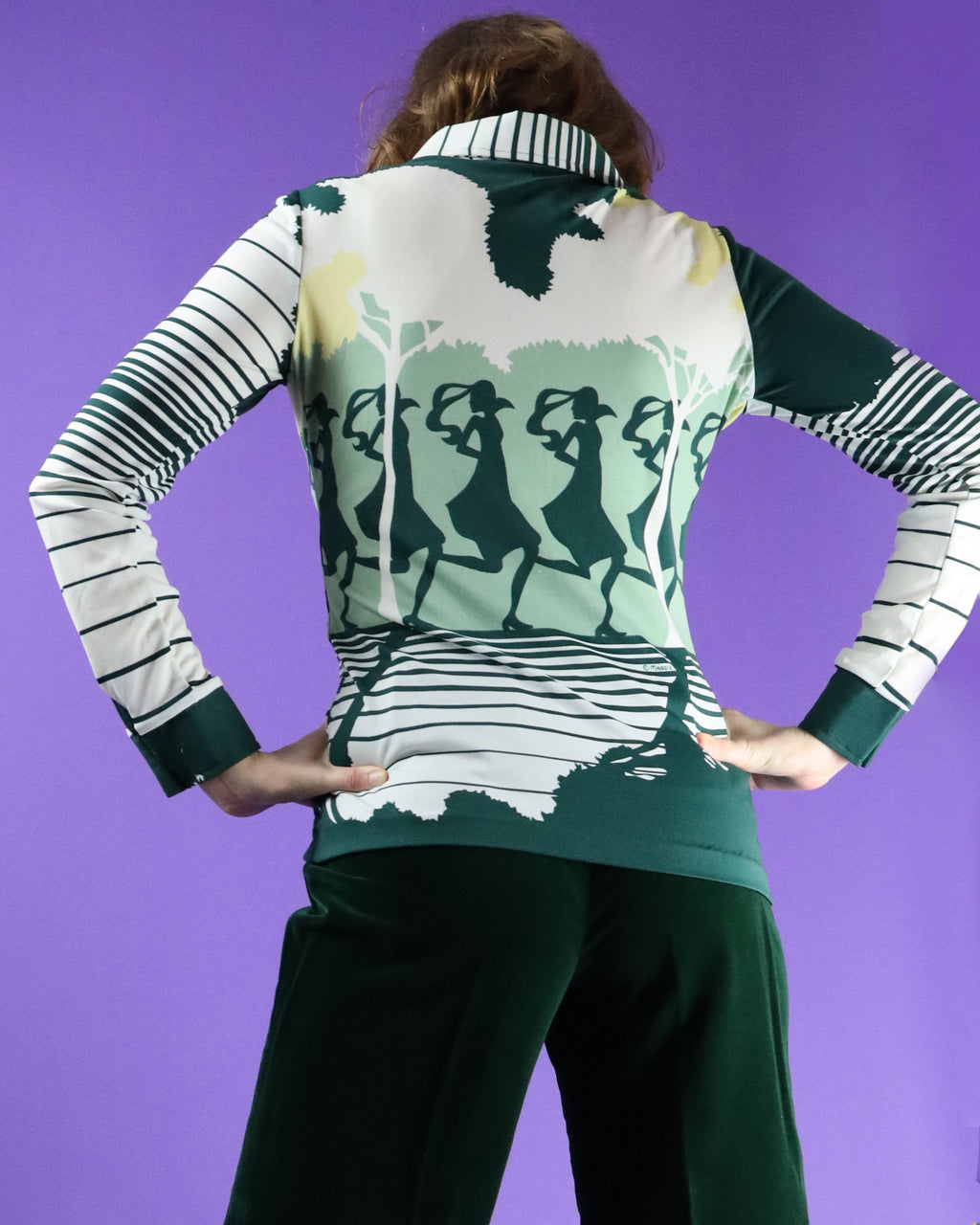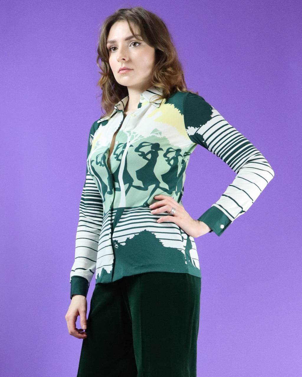 Fabulous vintage 1970s art nouveau print disco shirt by Maggie's Printworks. Various shades of green in a fabulous illustrative print. I love the dancing flapper girls! Cut with wide dagger collar and classic button up front. This shirt is deadstock, and still has it's original tag!