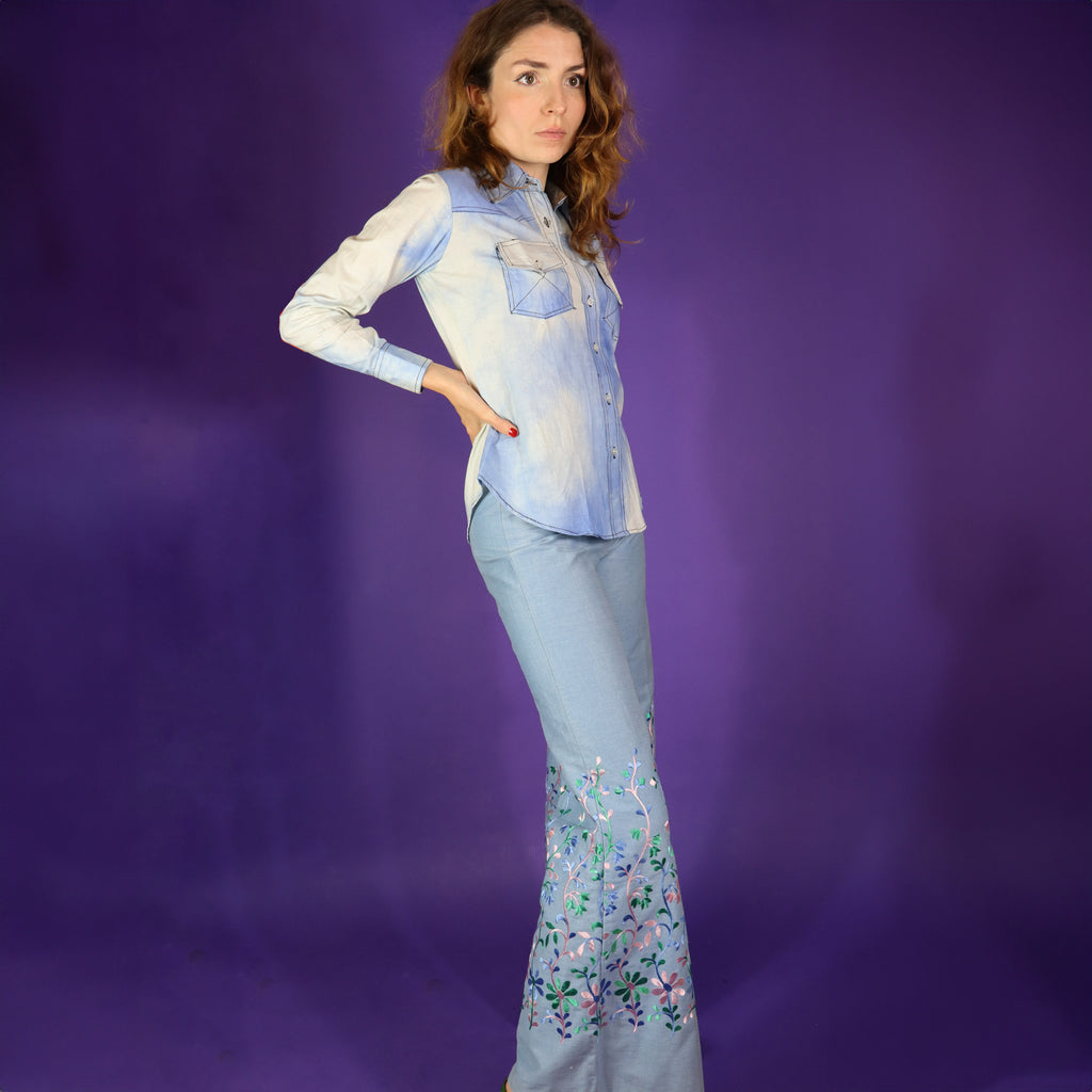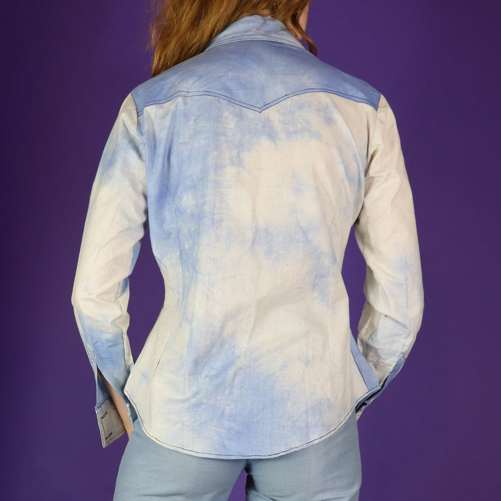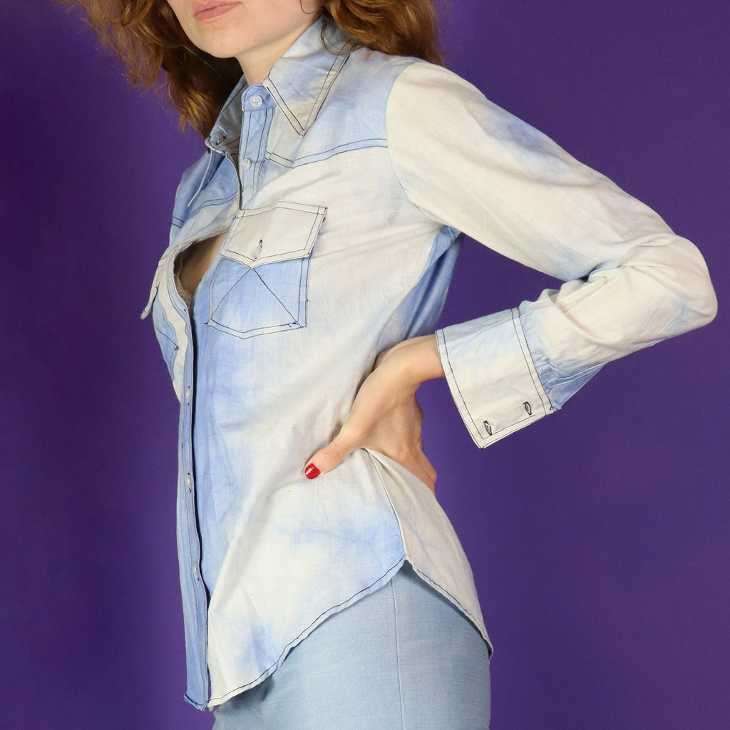 Fantastic vintage 1970s deadstock and unworn shirt by Californian Indian imports label. lightweight cotton space dyed with sky like powder blue and white. Cut in classically western way with dramatic dagger collar, yoke and double stitch detailing throughout. A perfect summer shirt!