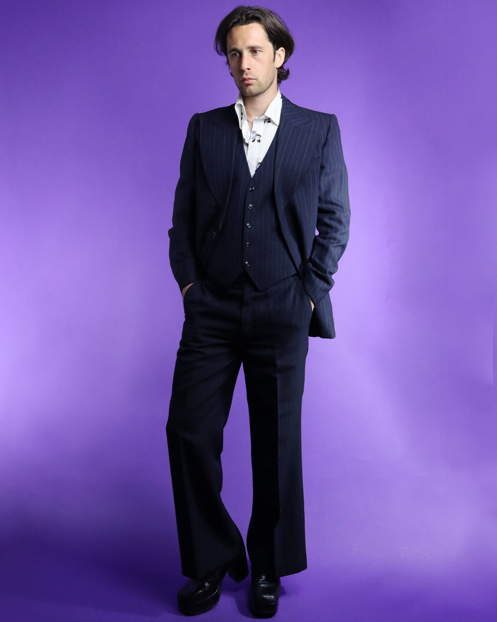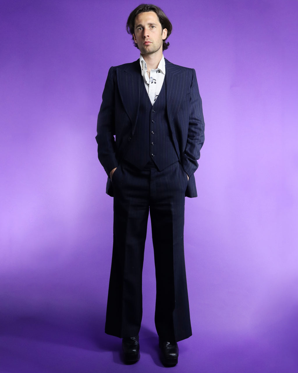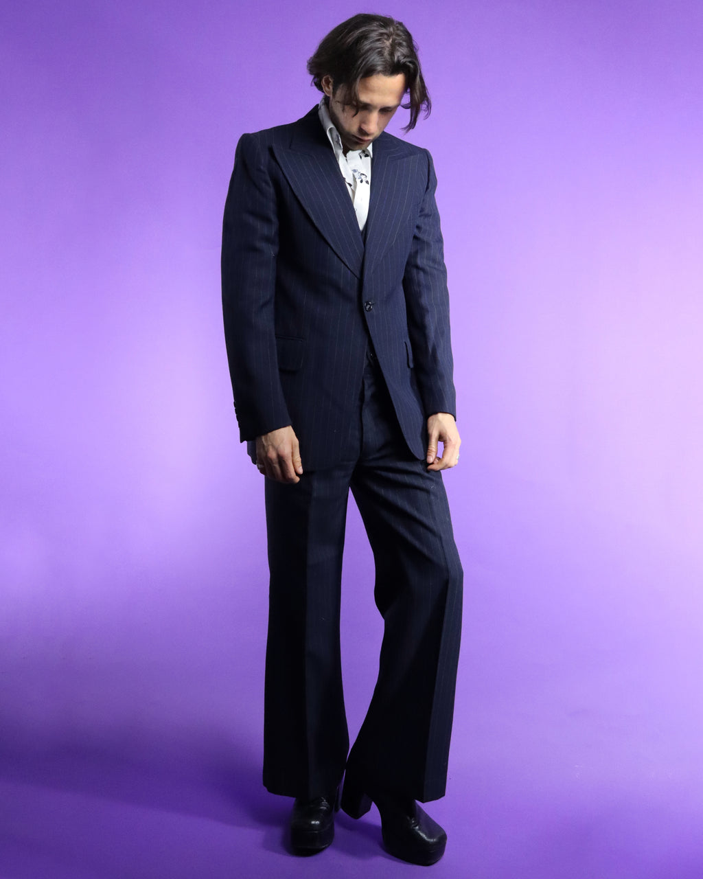 Fantastic vintage 1970s pinstripe suit by Kings Road label 'Dandy'. Deep navy blue with alternating electric blue and white thin chalk stripe. A fabulous 70s cut with wide peaked shield lapel, button up waistcoat and flared trousers. I love the deep v cut of the waistcoat and the sleek understated colourway. Super cool suit in fantastic condition, worn once and lovingly stored ever since.