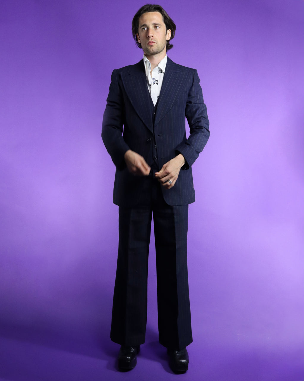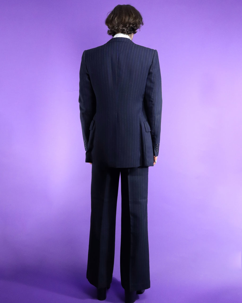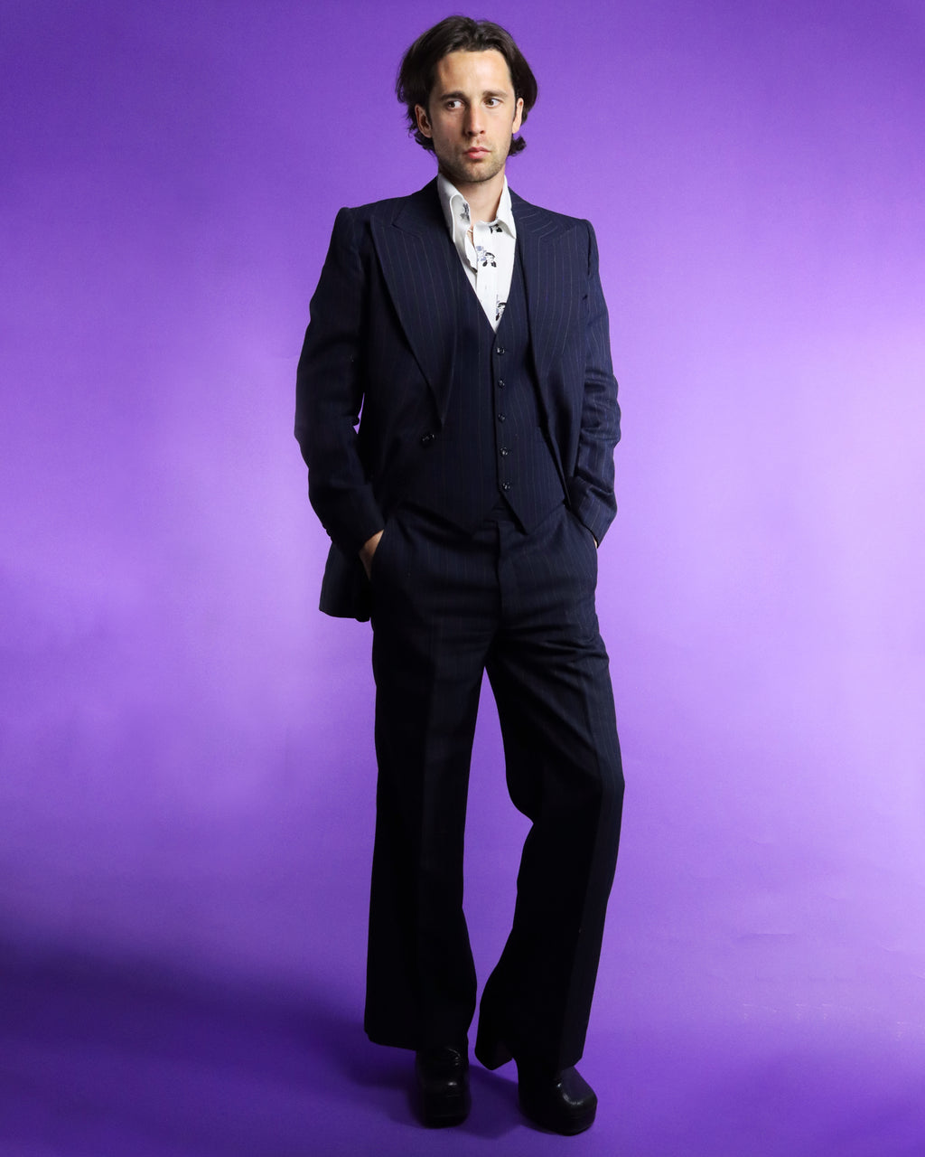 Fantastic vintage 1970s pinstripe suit by Kings Road label 'Dandy'. Deep navy blue with alternating electric blue and white thin chalk stripe. A fabulous 70s cut with wide peaked shield lapel, button up waistcoat and flared trousers. I love the deep v cut of the waistcoat and the sleek understated colourway. Super cool suit in fantastic condition, worn once and lovingly stored ever since.