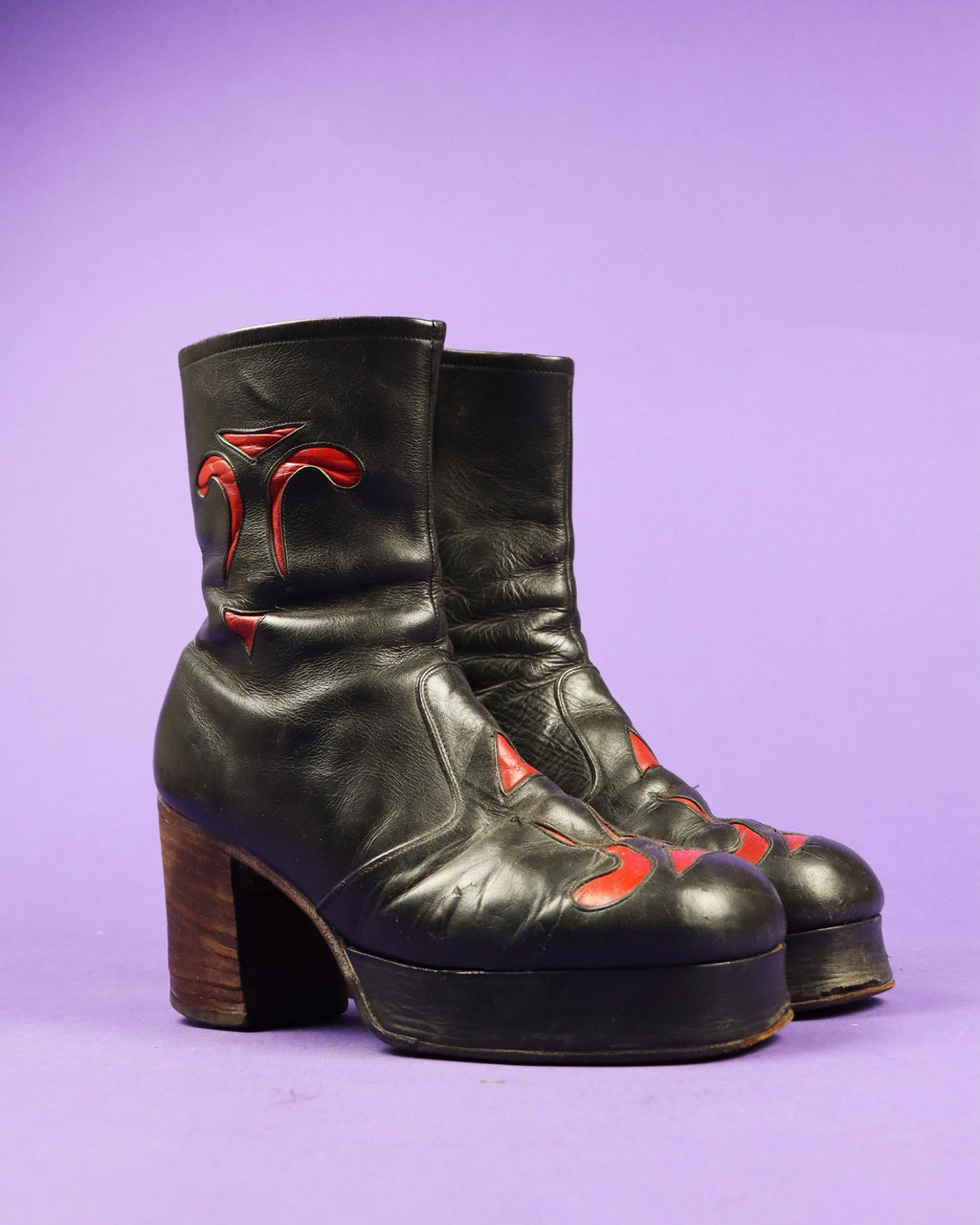 ULTIMATE Vintage 1970s stomping platform boots. High shine black leather with red insert detailing. Features a rounded toe, block platform and stacked heel. Beautifully crafted, sculptural boots- it's incredibly difficult to find 70s Stacks of this calibre. Fabulous worn in patina. The previous owner won them in a poker game in the late 70s!