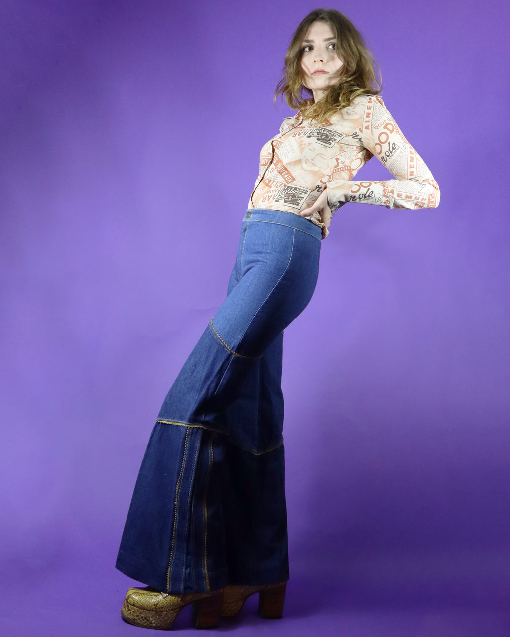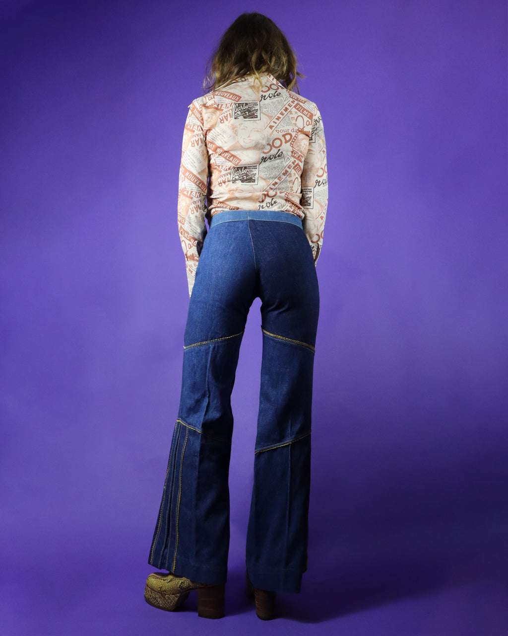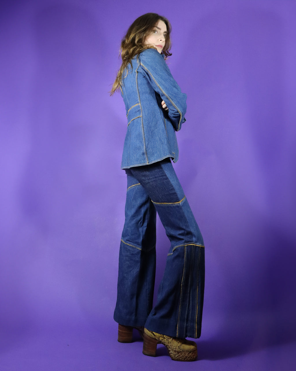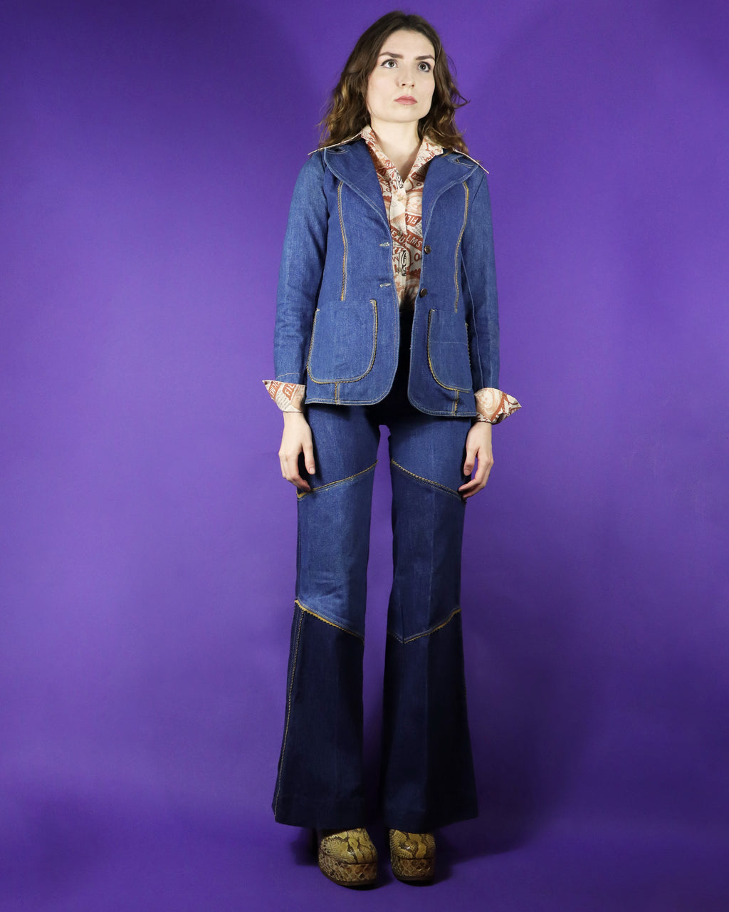 Incredible vintage 1970s denim patchwork suit by USA label ‘French Dressing’. Multi toned denims cleverly panelled together and contrasted with sand coloured zig zag leather piping. Classic 70s blazer cut and wide flares with western detailing at the cuffs. A super special and rare suit!