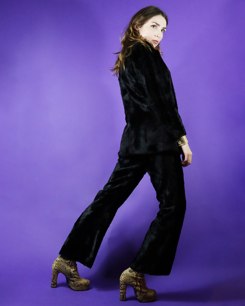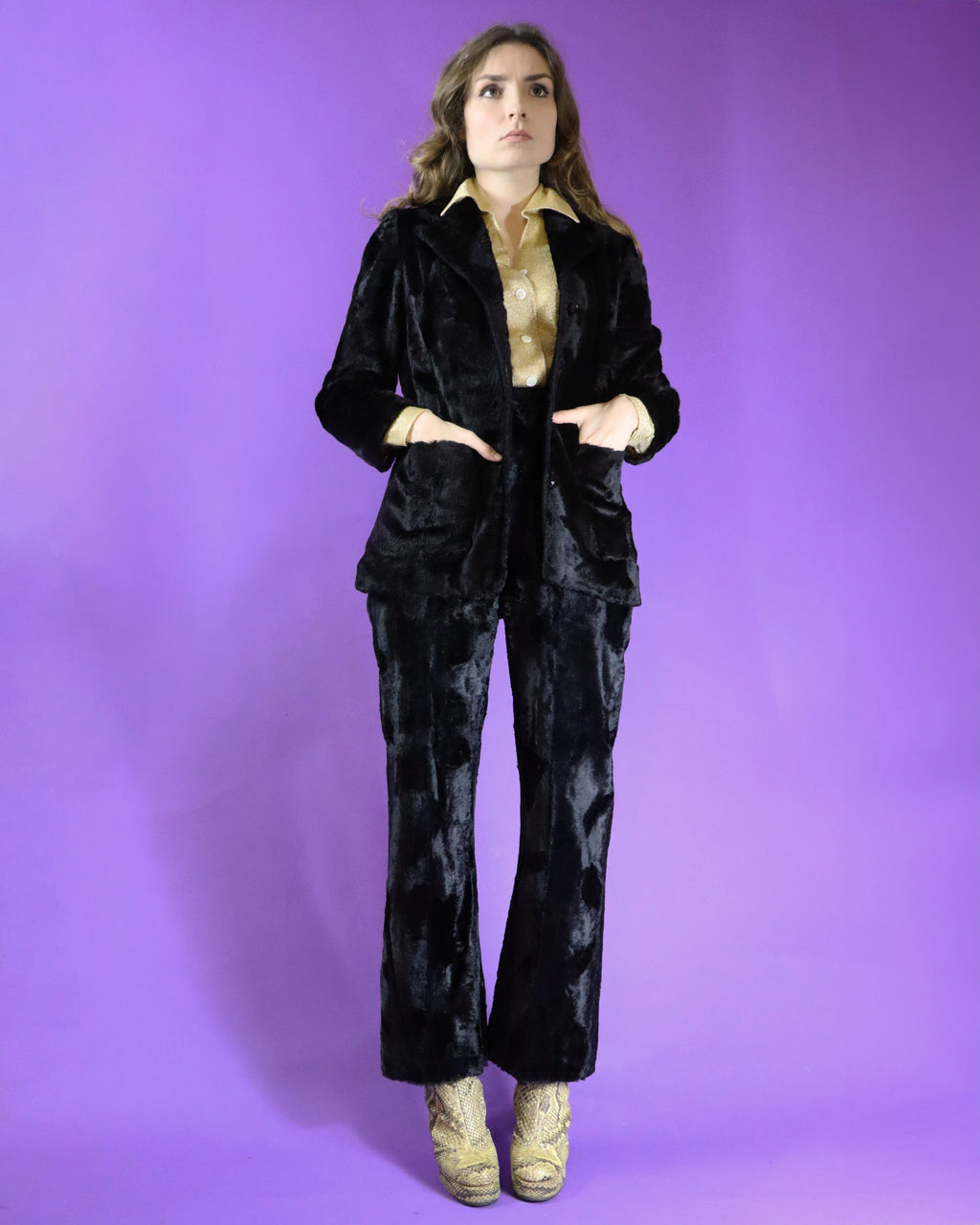 Vintage 1970s Black Faux Fur / Crushed Velvet Panther Suit