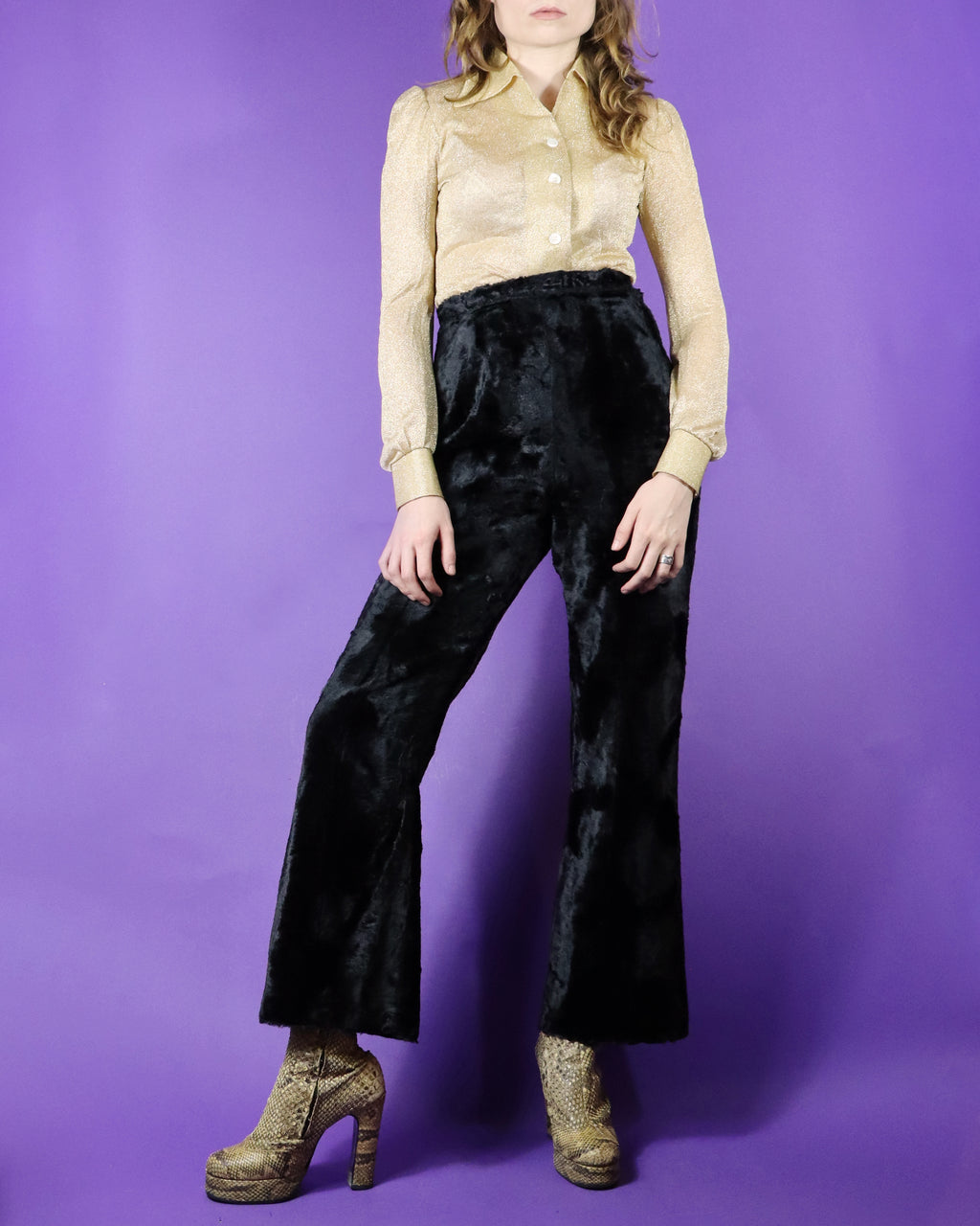 Vintage 1970s trouser suit. Made from panther black faux fur fabric- so glam! Cut with wide lapelled square cut blazer and paired with ultra high waisted flared trousers. The blazer is finished with a golden silky satin lining. Union made & high quality! A truly striking, special set.