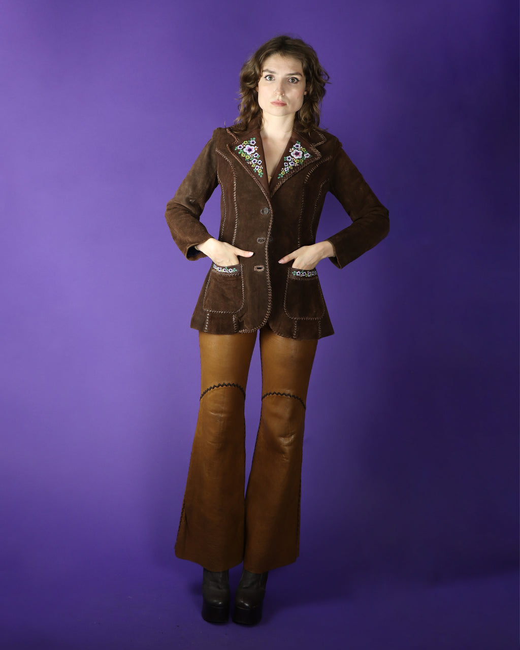 Rare & wonderful vintage 1970s brown suede blazer handcrafted so beautifully by renowned Mexican leather label ‘Char’ (Designer Charlotte Blankenship de Vasquez). Hand painted floral detailing, whipstitch seams, wooden slice buttons and curved panelling. What a joy! Fully lined with deep blue silky satin.