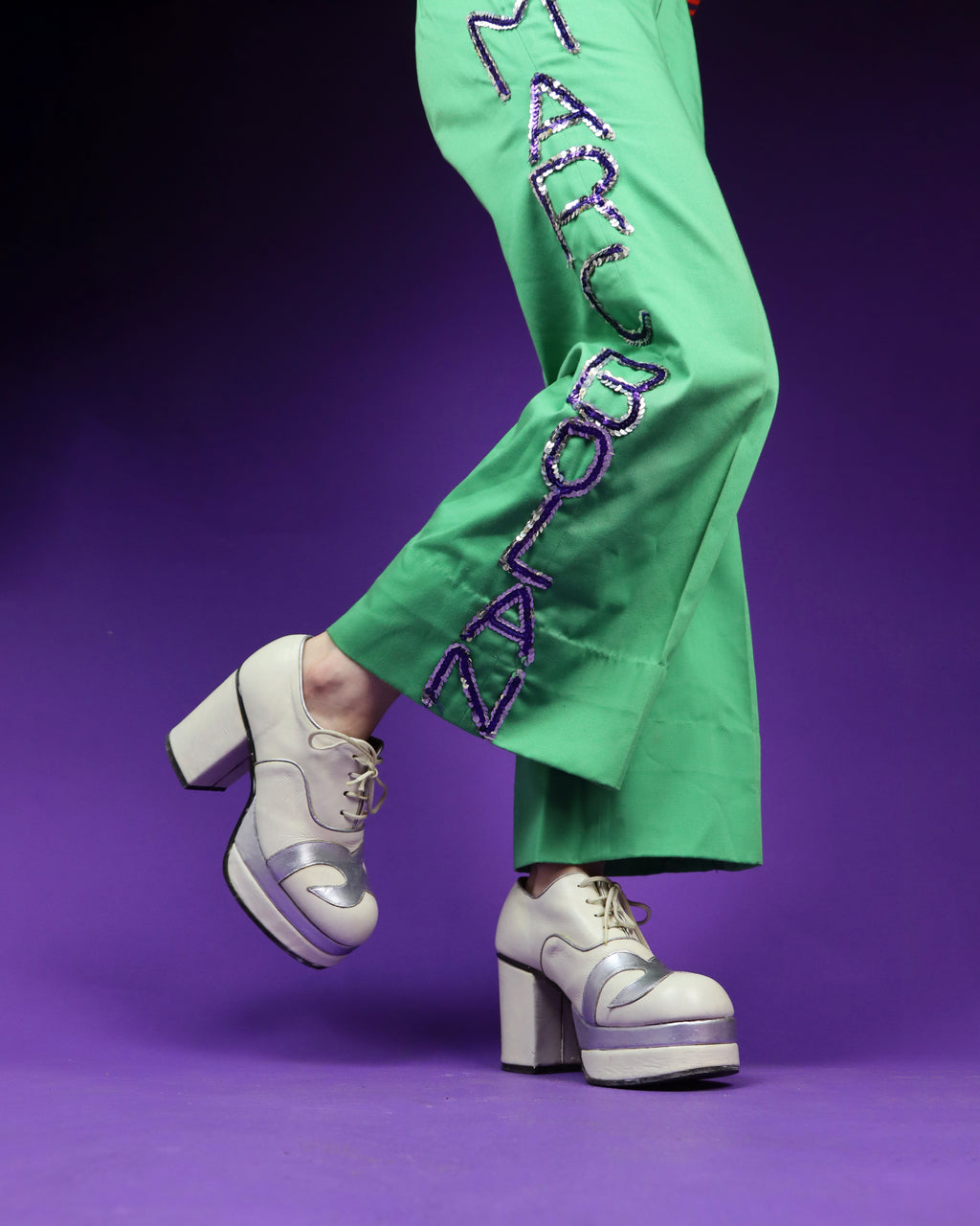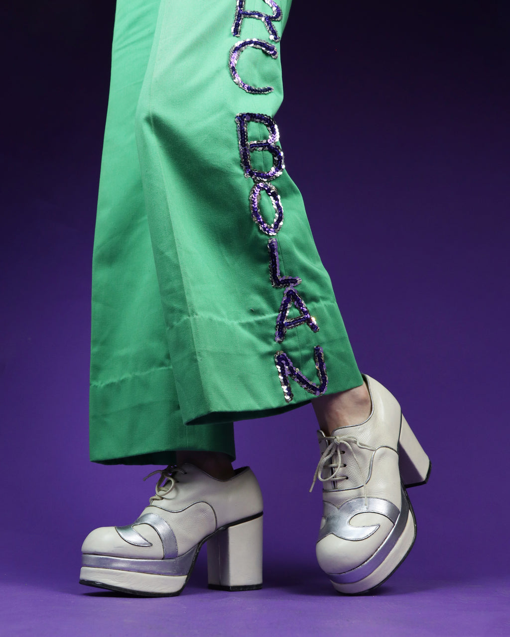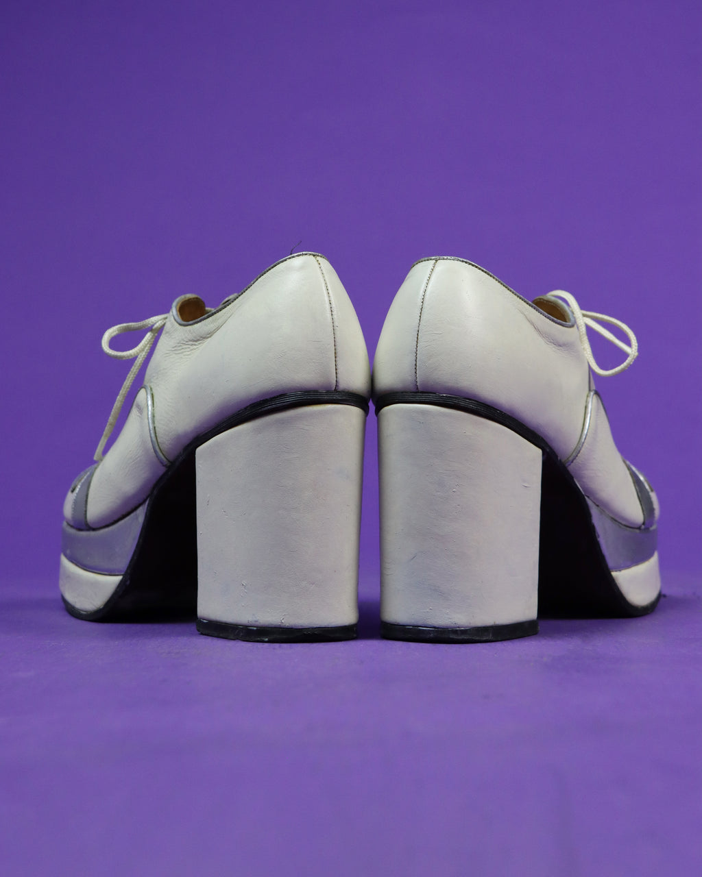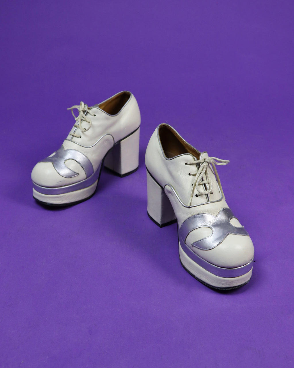 Vintage 1970s platform shoes in an off white colour with beautiful silver swirl detailing. I love how the silver colour of the wave detailing is echoed in the central stack of the platform and the piping too. These shoes have a lovely neat shape, large block heel and a rounded toe.