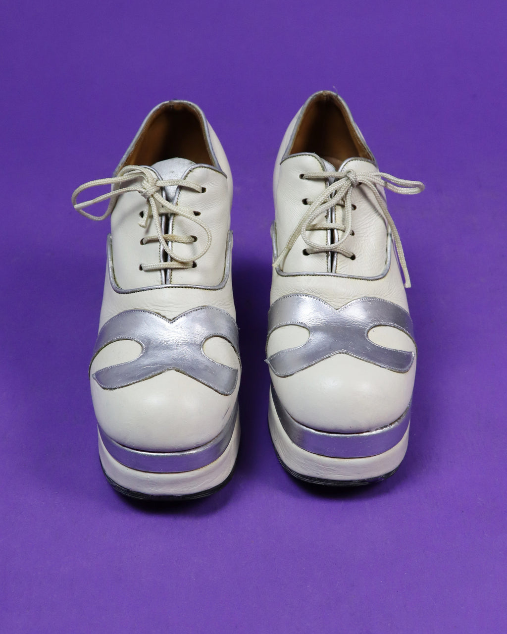 Vintage 1970s Cream and Silver Swirl Platform Shoes