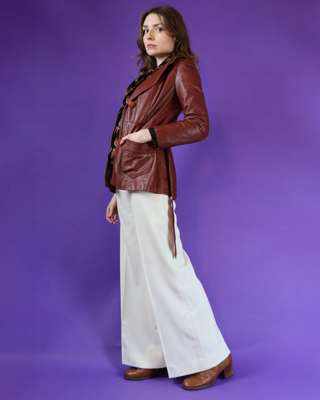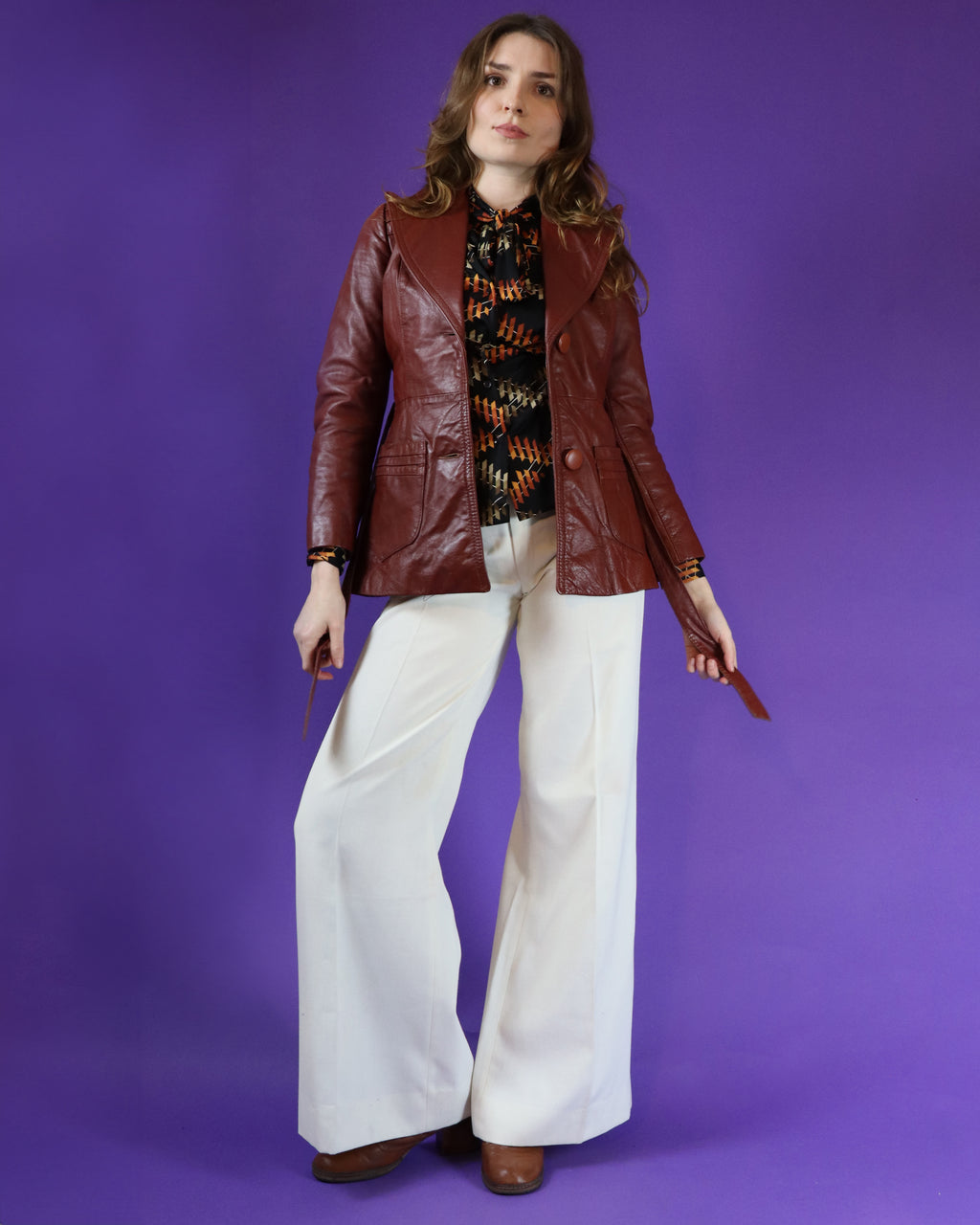 Vintage 1970s tie belt leather jacket. Burgundy high shine leather in form fitting blazer style cut with large peaked lapel, patch pockets and a tie belt at the waist. I love the ridge stripe detailing and the leather covered buttons. A super chic, form flattering jacket.