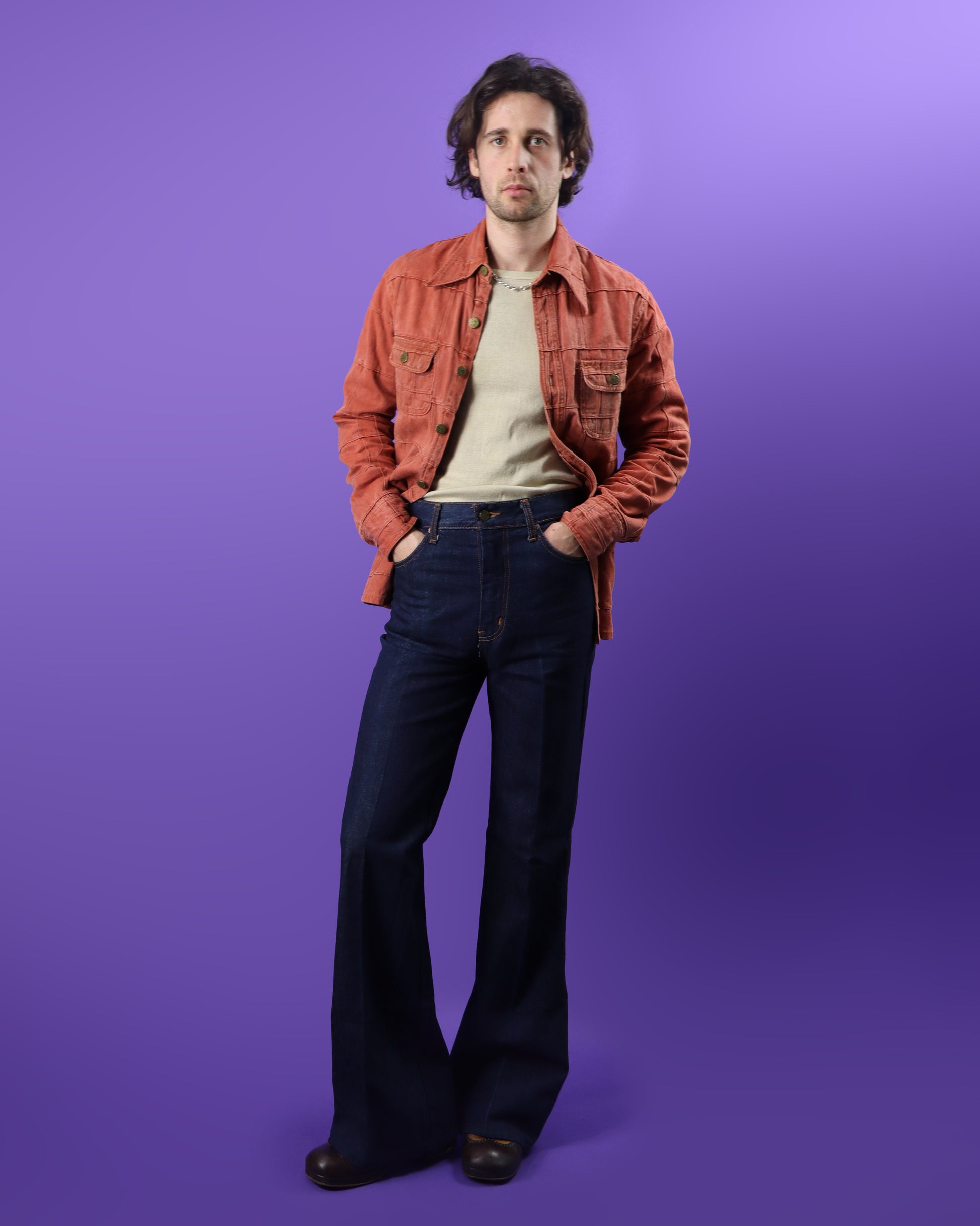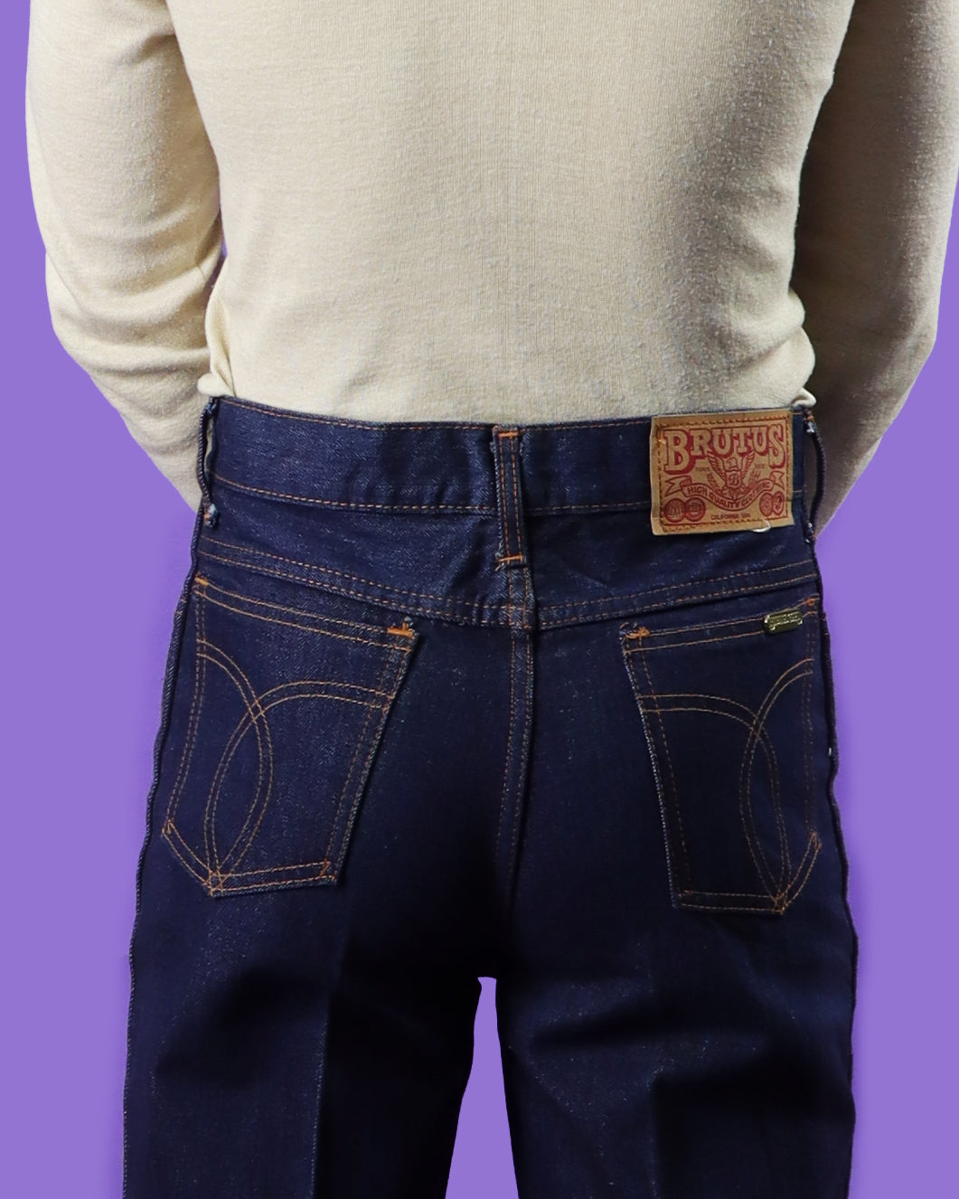 Fabulous vintage 1970s denim flares by BRUTUS Gold. Raw dark indigo denim with a fabulous bell bottom, featuring classic 5 pocket design and leather patch label still intact. Deadstock and unworn.