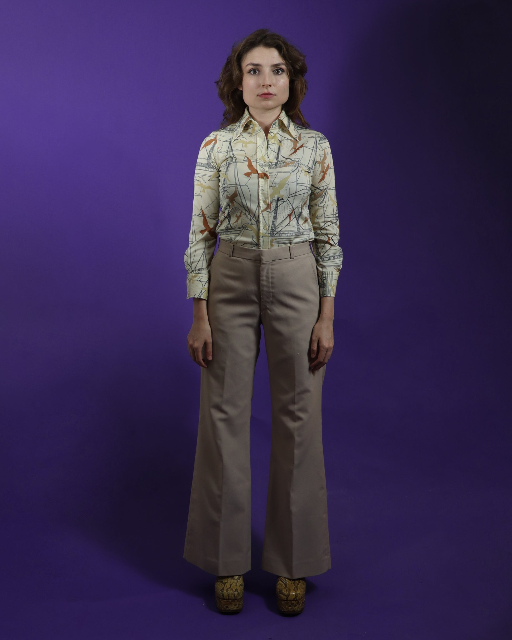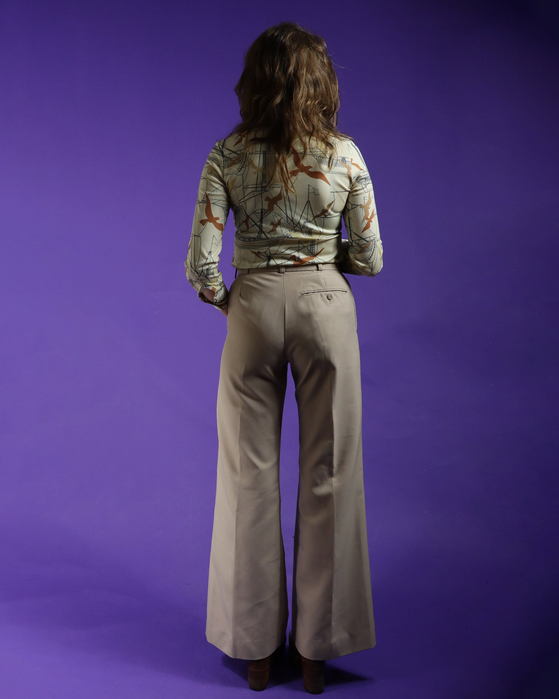 Vintage 1970s tailored trouser suit. A lightweight beige material cut with a pair of fabulous bell bottomed slacks and a wide lapelled blazer. A brilliant cut & sharp silhouette! Super cool and flattering suit.