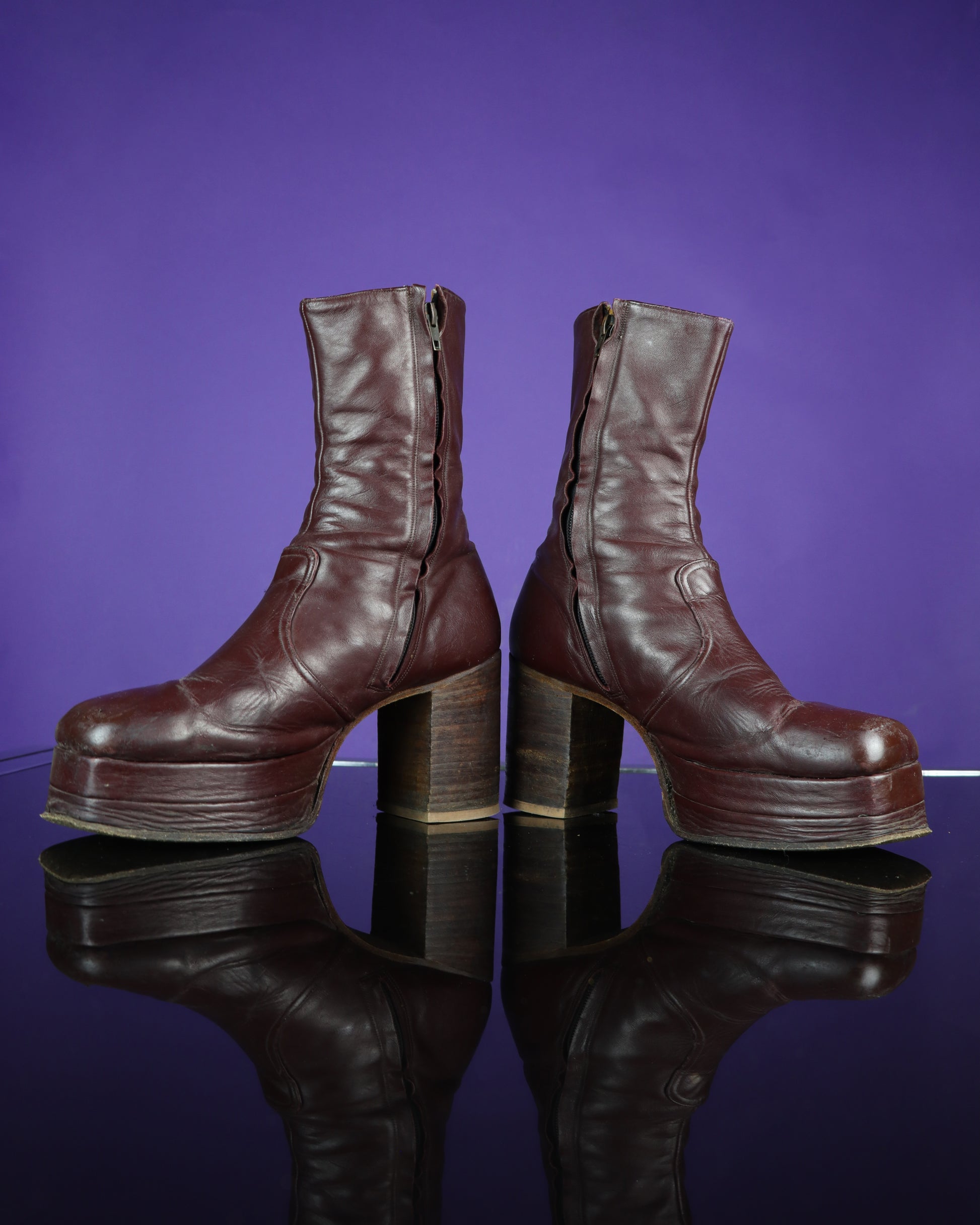 ULTIMATE Vintage 1970s stomping platform boots. Supple burgundy leather with a gorgeous patina. Handmade and featuring a squared toe shape, large platform and stacked heel. Beautifully crafted, sculptural boots- it's incredibly difficult to find 70s Stacks of this calibre!