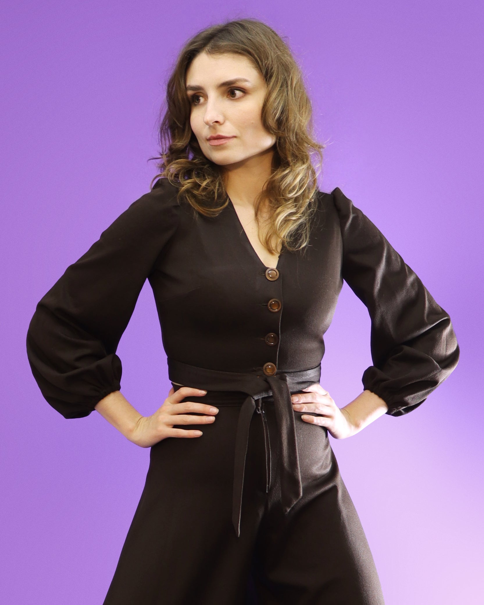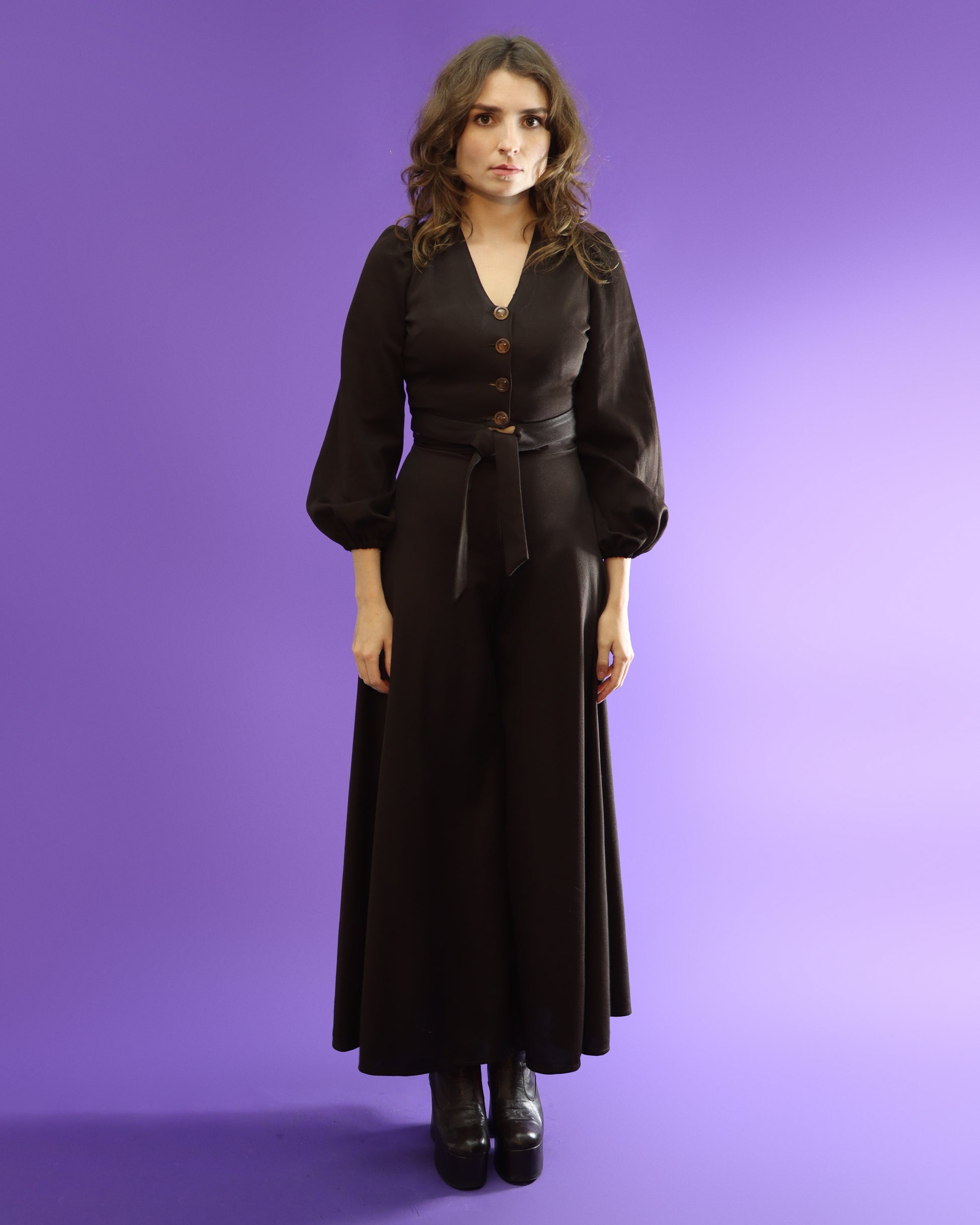 Vintage 1970s darkest chocolate brown palazzo pant suit. This set was lovingly handmade using a dark brown crepe appearing poly material which holds it's beautiful shape perfectly. Cut with a balloon sleeve, cropped top, tie front and a pair of wide leg mega flares.