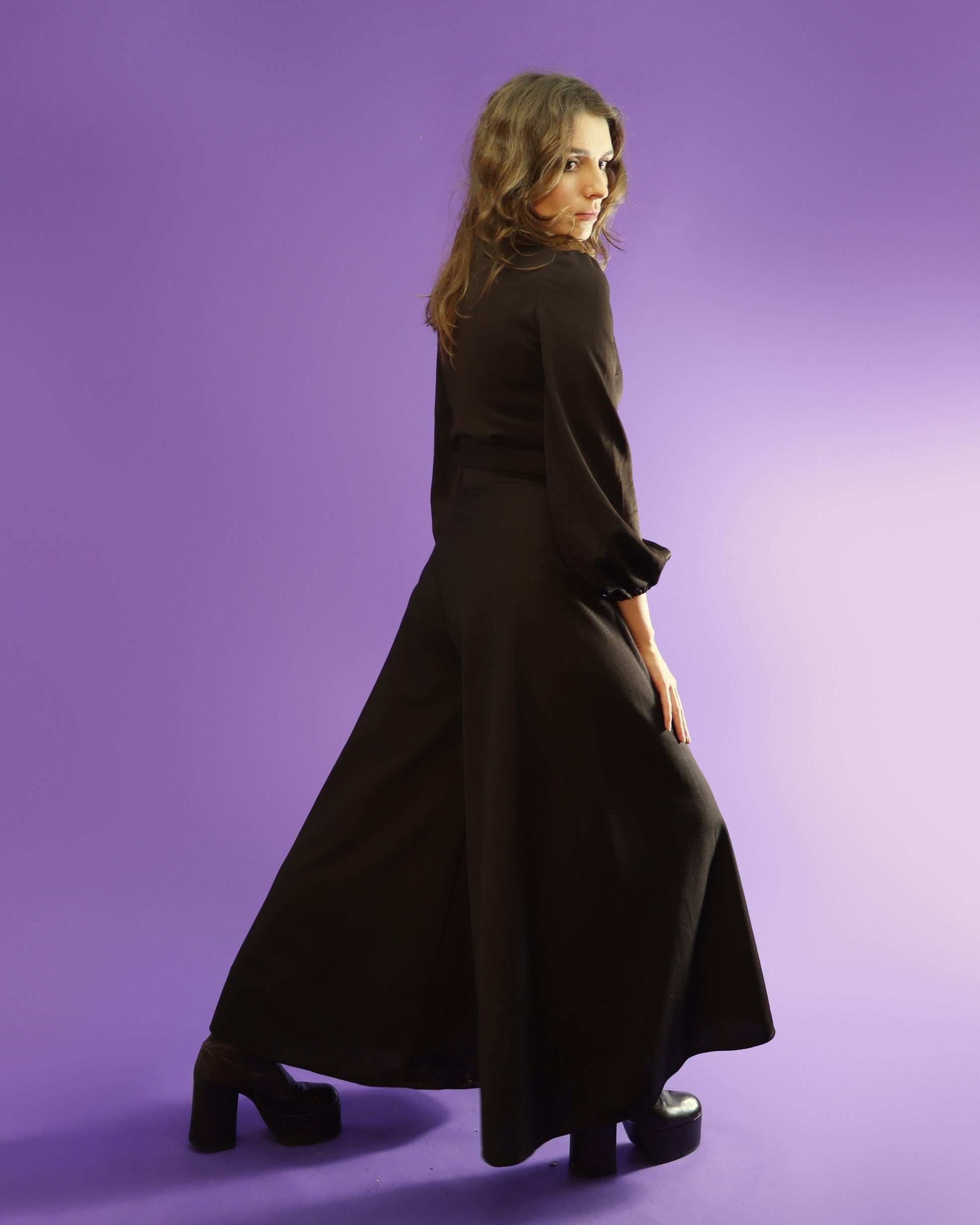 Vintage 1970s Chocolate Brown Palazzo Pant Suit Wide Leg Flares Balloon Sleeve