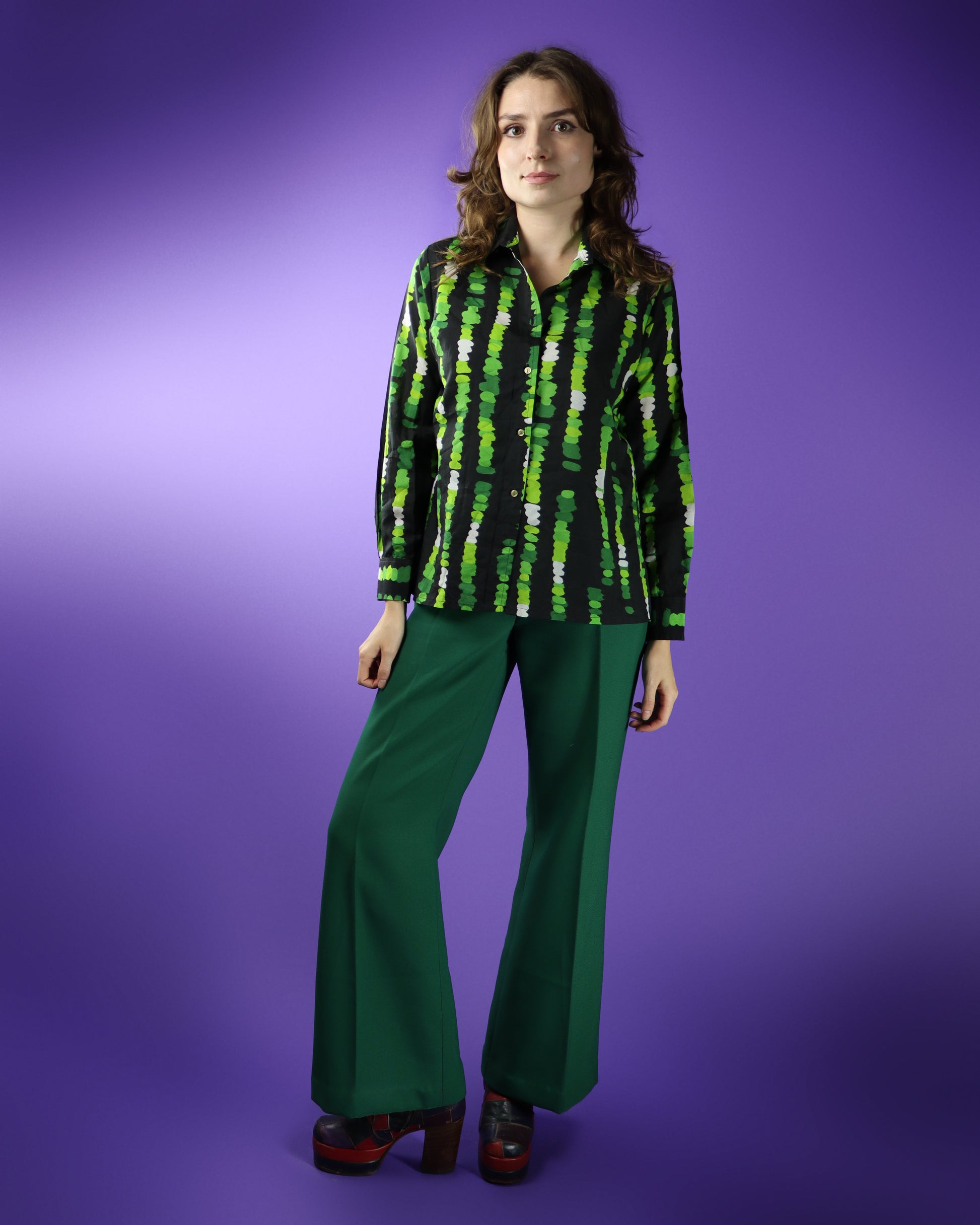 Vintage 1970s dagger collar shirt by Parisian label Solfin. Soft, lightweight material with a super striking print- various shades of green and white splodged in stripes against a black background. Perfect under a suit!