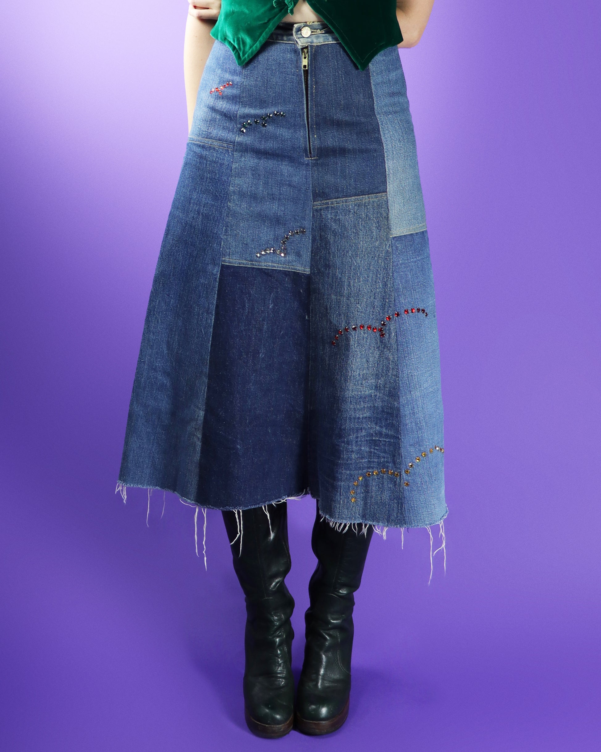 Vintage 1970s Denim Patchwork Skirt with Rhinestones
