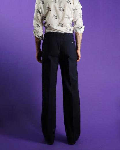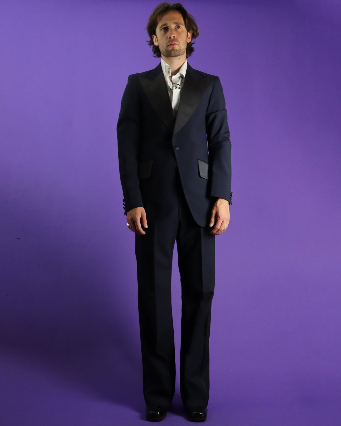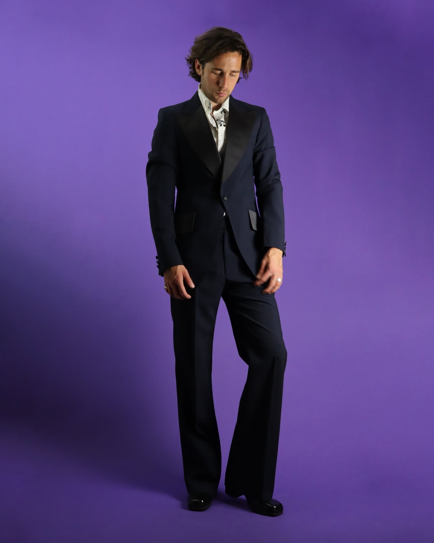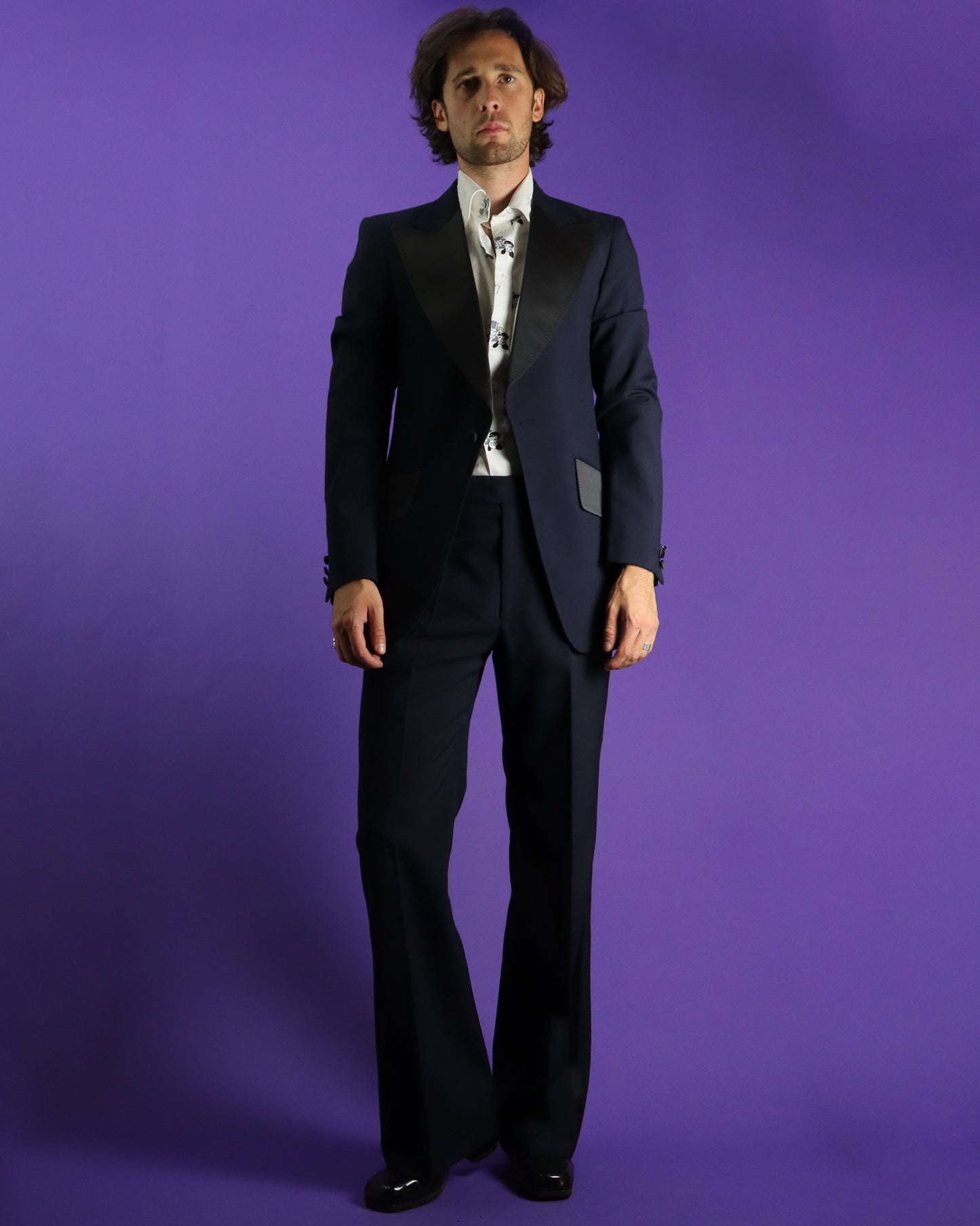 Vintage 1970s tailored dinner suit by 'tailored by Simon', made in England. Wool / poly blend in classic navy blue colour and featuring a contrast black satin peaked lapel, single button closure, pocket tabs and galloon. Cut with a wide peaked lapelled blazer with open front and a pair of kick flares. Super suave piece of 70s tailoring. In fantastic condition.